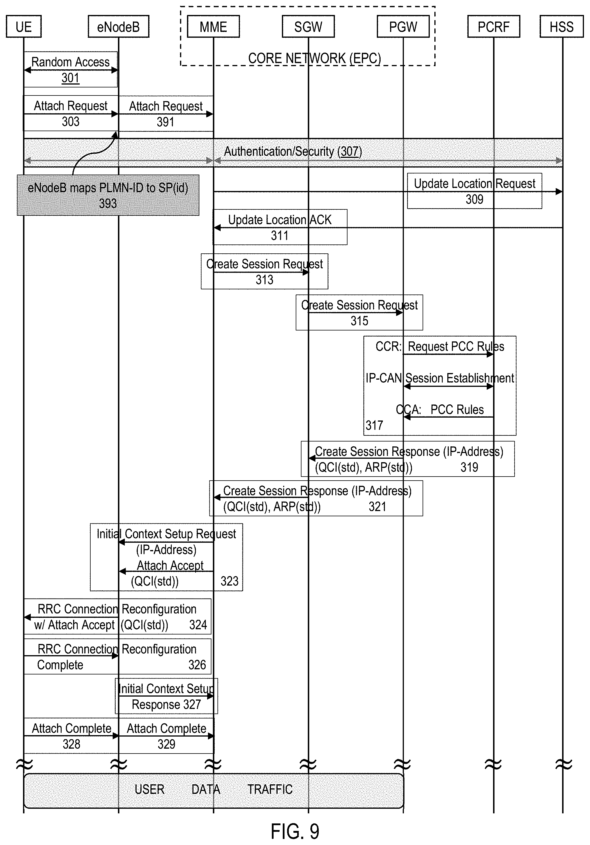 Initially (e.g., upon power-on), at Step 301, the UE first selects a network based on the Public Land Mobile Network (PLMN) identifier stored in the subscriber identity module (SIM) card of the UE. The SIM card securely stores identification information (e.g., the international mobile subscriber identity (IMSI) number, PLMN and security key information) used to identify and authenticate the UE on the network. The PLMN identifies the operator network with which the UE holds a current subscription (e.g., Verizon, AT&T, T-Mobile, etc.). Each eNodeB broadcasts the PLMN for the respective network operator that owns/operates the eNodeB. Accordingly, at this point, via random access, the UE identifies the eNodeB for the network to which it subscribes based on a match between the PLMN stored in its SIM card and the PLMN broadcast by the appropriate eNodeB. Further, in a multi-operator core network sharing configuration, there may be multiple core networks, each with a respective unique PLMN ID associated with each eNodeB. When the UE registers with a core network, the UE sends the Attach Message to the eNodeB, which includes the selected network PLMN-ID (and the UE IMSI). The eNodeB extracts the PLMN-ID from the Attach Request, and connects the UE with the respective core network with which the PLMN-ID is associated. Further, in order to access network resources or data services, the UE needs to register with the network to receive services that require registration (e.g., subscription services)—registration is referred to as Network Attachment. In LTE networks, the always-on IP connectivity for a UE of the Evolved Packet System (EPS) may be enabled by establishing a default EPS bearer during Network Attachment. The “default EPS bearer” or simply “default bearer” is the EPS bearer that is first established for a new PDN connection, and remains established throughout the lifetime of the PDN connection. The PCC rules applied to the default EPS bearer may be predefined in the PGW and activated in the attachment by the PGW itself. In the event that the UE subscribes to services that utilize specific dedicated bearers (other than the default bearer), the Attach procedure may further trigger one or multiple Dedicated Bearer Establishment procedures to establish the respective dedicated bearer(s) for that UE. During the attach procedure, the UE may also request for an IP address allocation. Once the UE acquires the appropriate network, to initiate the Attach process, the UE first sends an Attach Request message to the eNodeB, which contains various parameters, including the UE IMSI and the PLMN identifier (Step 303). The eNodeB forwards the UE Attach Request to the MME (Step 305). When the MME receives the UE attach request message, the MME requests the authentication keys from HSS, and authenticates the UE based on the provided keys (Step 307). At this point, the MME also assigns a unique identifier for the UE (the MME-UE-S1AP-ID, which is used by the MME to uniquely identify UE over the S1 interface within the MME. The MME-UE-S1AP-ID remains valid and constant as long as the UE maintains the S1 connection with the MME. After successfully authenticating the UE, the MME sends an Update Location Request message to the HSS to indicate that the UE is now handled by that MME (Step 309), which contains various parameters, including the MME identity and UE IMSI. The HSS acknowledges the attachment by sending an Update Location ACK message (including the UE IMSI, and Subscription data) back to the MME (Step 311). The Subscription data contains one or more PDN subscription contexts, where each PDN subscription context contains an ‘EPS subscribed QoS profile’ (e.g., the subscribed QCI and ARP). The QCI being the QoS Class Identifier and the ARP being the Allocation and Retention Priority (which provides bearer priority and preemption information). The MME then sends a Create Session Request message to the selected SGW (Step 313). The Create Session Request message of the MME includes various parameters, such as the UE IMSI and the Default EPS Bearer QoS. As provided in the 3GPP TS 23.401, the Create Session Request message of the MME may further include other parameters, such as MSISDN, MME TEID for control plane, PDN GW address, PDN Address, APN, RAT type, PDN Type, APN-AMBR, EPS Bearer Identity, Protocol Configuration Options, Handover Indication, ME Identity (IMEISV), User Location Information (ECGI), UE Time Zone, User CSG Information, MS Info Change Reporting support indication, Selection Mode, Charging Characteristics, Trace Reference, Trace Type, Trigger Id, OMC Identity, Maximum APN Restriction, Dual Address Bearer Flag, the Protocol Type over S5/S8, Serving Network. The SGW creates a respective new entry in its EPS Bearer table for the respective bearer and sends a Create Session Request message to the PGW (Step 315). The Create Session Request message of the SGW includes various parameters, such as the UE IMSI and the Default EPS Bearer QoS. As provided in the 3GPP TS 23.401, the Create Session Request message of the SGW may further include other parameters, such as MSISDN, APN, Serving GW Address for the user plane, Serving GW TEID of the user plane, Serving GW TEID of the control plane, RAT type, PDN Type, PDN Address, subscribed APN-AMBR, EPS Bearer Identity, Protocol Configuration Options, Handover Indication, ME Identity, User Location Information (ECGI), UE Time Zone, User CSG Information, MS Info Change Reporting support indication, PDN Charging Pause Support indication, Selection Mode, Charging Characteristics, Trace Reference, Trace Type, Trigger Id, OMC Identity, Maximum APN Restriction, Dual Address Bearer Flag, Serving Network. In Step 317, the PGW requests PCC rules from PCRF by sending a Credit Control Request (CCR) message on the Gx interface to the PGW. The PGW also performs an IP-CAN Session Establishment procedure with the PCRF. [See 3GPP TS 23.203] The PCRF responds, p