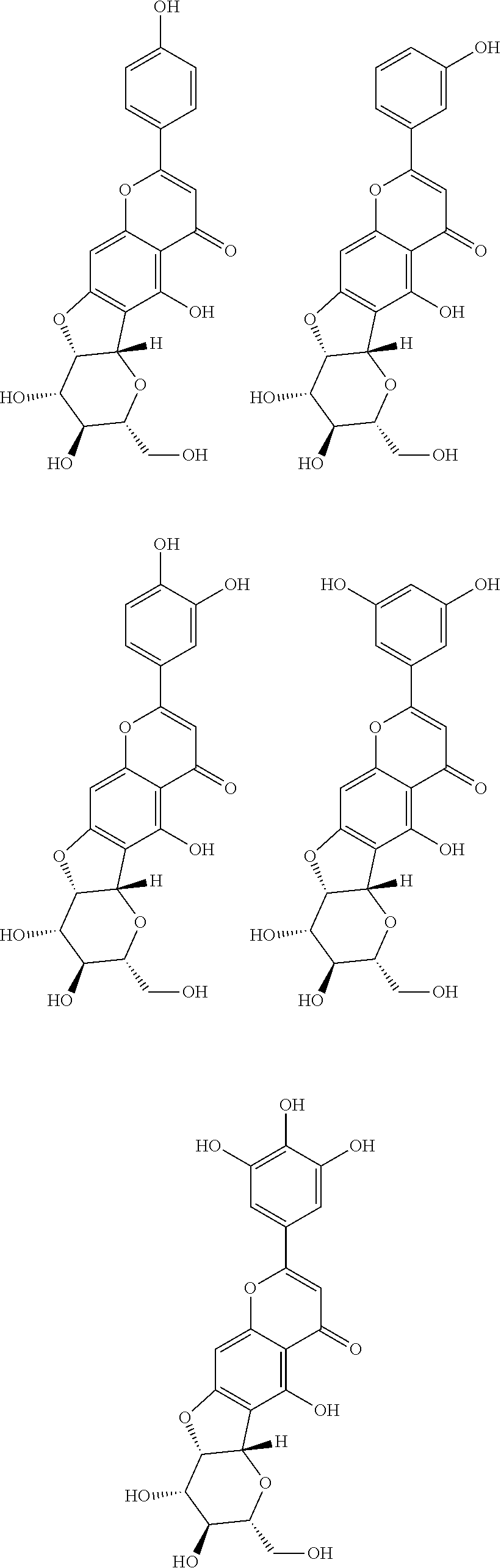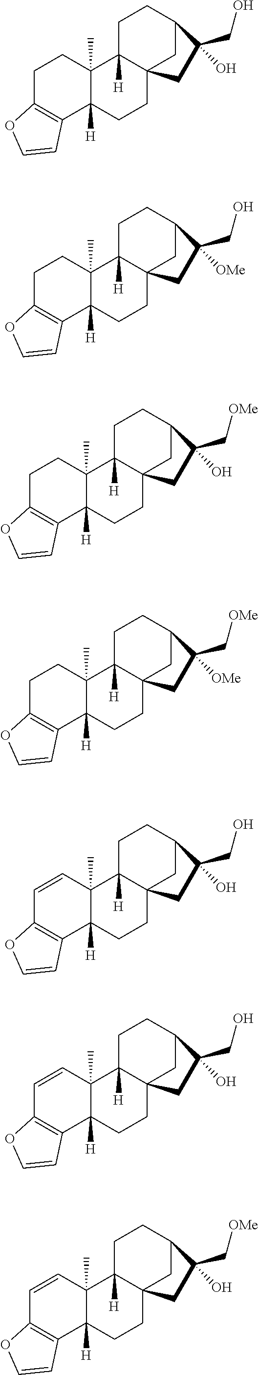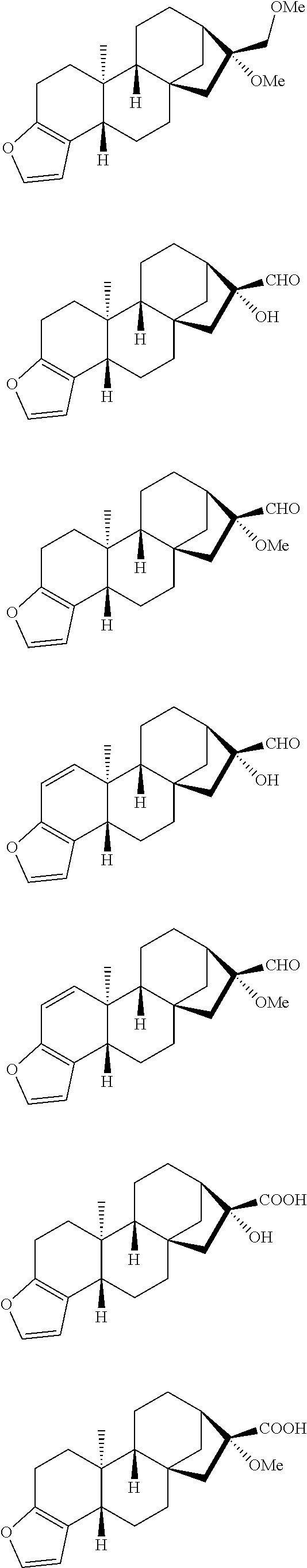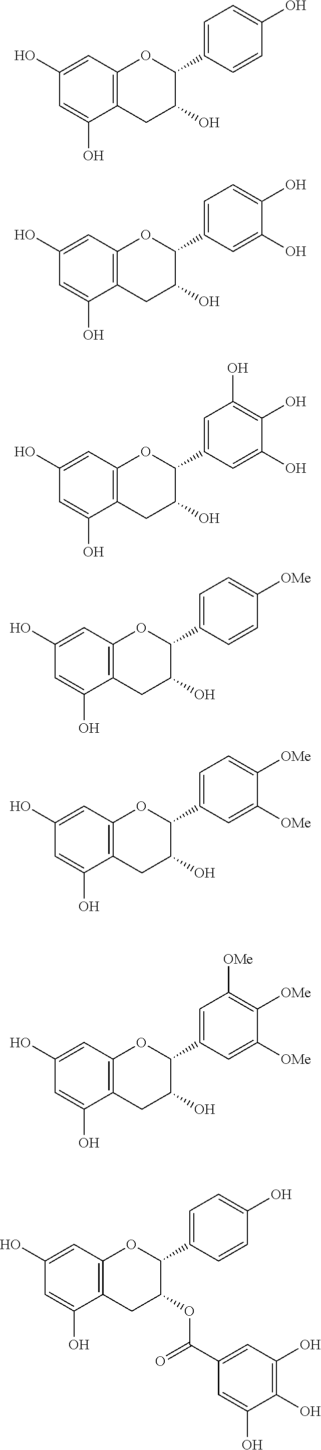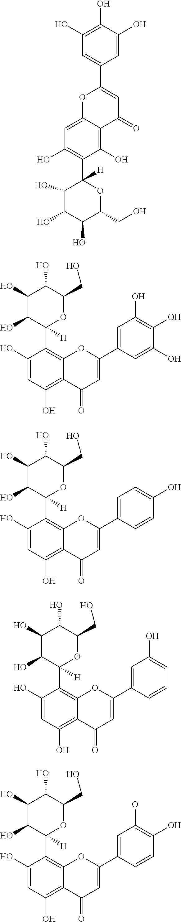 MONOTERPENE Perillartine (10)b 370 SESQUITERPENES Bisabolanes (+)-Hernandulcin (11) 1,500 4β-Hydroxyhernandulcin (12) N.S.c Acyclic glycoside Mukurozioside IIb (13) ca. 1 DITERPENES Diterpene acid 4β,11α-Dimethyl-1,2,3,4,5,10- Pine tree 1,300-1,800d hexahydro-fluorene-4α,6α- dicarboxylic acid (14)b ent-Kaurene glycosides Dulcoside A (15) 30 (Compositae) Rebaudioside A (4) 242 Rebaudioside B (16) 150 Rebaudioside C (17) 30 Rebaudioside D (18) 221 Rebaudioside E (19) 174 Rebaudioside F (20) N.S.c Rubusoside (21) 115 Steviolbioside (22) 90 Steviol 13-0-β-D-glucoside (23) N.S.c Stevioside (5) 210 Suavioside A (24) N.S.c Suavioside B (25) N.S.c Suavioside G (26) N.S.c Suavioside H (27) N.S.c Suavioside I (28) N.S.c Suavioside J (29) N.S.c Labdane glycosides Baiyunoside (30) 500 Phlomisoside I (31) N.S.c Gaudichaudioside A (32) 55 (Compositae) TRITERPENES Cucurbitane glycosides Bryodulcoside N.S.c Bryoside (33) N.S.c Bryonoside (34) N.S.c Carnosifloside V (35) 51 Chen (Cucurbitaceae) Carnosifloside VI (36) 77 Mogroside IV (37) 233-392d Zhange(Cucurbitaceae) Mogroside V (2) 250-425d 11-OxomogrosideV(38) N.S.c Scandenoside R6 (39) 54 Z.L. Chen (Cucurbitaceae) Scandenoside R11 (40) N.S.c Siamenoside I (41) 563 Cycloartane glycosides Abrusoside A (42) 30 Wall et W.& A. (Leguminosae) Abrusoside B (43) 100 Abrusoside C (44) 50 Abrusoside D (45) 75 Abrusoside E (46) N.S.c Dammarane glycosides Cyclocarioside A (47) 200 Iljinsk (Juglandaceae) Cyclocaryoside I (48) 250 Gypenoside XX (49) N.S.c Makino (Cucurbitaceae) Oleanane glycosides Albiziasaponin A (50) 5 (Leguminosae) Albiziasaponin B (51) 600 Albiziasaponin C (52) N.S.c Albiziasaponin D (53) N.S.c Albiziasaponin E (54) N.S.c Apioglycyrrhizin (55) 300 (Leguminosae) Araboglycyrrhizin (56) 150 Glycyrrhizin (1) 93-170d (Leguminosae) Periandrin I (57) 90 (Vell.) Taub. (Leguminosae) Periandrin II (58) 95 Periandrin III (59) 92 Periandrin IV (60) 85 Periandrin V (61) 220 Secodammarane glycosides Pterocaryoside A (62) 50 (Juglandaceae) Pterocaryoside B (63) 100 STEROIDAL SAPONINS Osladin (64) 500 (Polypodiaceae) Polypodoside A (65) 600 DC. Eaton (Polypodiaceae) Polypodoside B (66) N.S.c Telosmoside A8(67) N.S.c Merr. (Asclepiadaceae) Telosmoside A9(68) N.S.c Telosmoside A10(69) N.S.c Telosmoside A11(70) N.S.c Telosmoside Al2(71) N.S.c Telosmoside A13(72) N.S.c Telosmoside A14(73) N.S.c Telosmoside A15(74) 1000 Telosmoside A16(75) N.S.c Telosmoside A17(76) N.S.c Telosmoside A18(77) N.S.c PHENYLPROPANOIDS trans-Anethole(78)f 13 Trans-Cinnamaldehyde (79) 50 Kanehira (Lauraceae) DIHYDROISOCOUMARIN Phyllodulcing(3) 400 Seringe var. Makino (Saxifragaceae) FLAVONOIDS Dihydrochalcone glycosides Glycyphyllin (80) N.S.c Naringin dihydrochalconec(81) 300 Neohesperidin dihydrochalconec(82) 1,000 Phlorizin (83) N.S.c Et Zucc. (Symplocaceae) Trilobatin (84) N.S.c Dihydroflavonols and Dihydroflavonols glycosides 3-Acetoxy-5,7-dihydroxy-4'- N.S.c methoxyflavanone (85) K. Schum. (Zingiberaceae) 2R,3R-(+)-3-Acetoxy-5-7-4'- N.S.c trihydroxyflavanone (86) Dihydroquercetin 3-O-acetate 4'- 400 methyl etherc(87) & Arn.) Cabrera (Compositae) (2R,3R)-Dihydroquercetin 3-O- 80 acetate (88) K. Parker (Compositae) (2R,3R)-2,3-Dihydro-5,7,3',4'- 25 tetrahydroxy-6-methoxy-3-O- acetylflavonol (89) (2R,3R)-2,3-Dihydro-5,7,3',4'- 15 tetrahydroxy-6- methoxyflavonol (90) (2R,3R)-2,3-Dihydro- 20 5,7,4'-trihydroxy-6-methoxy- 3-O-acetylflavonol (91) Huangqioside E. (92) N.S.c Hance (Juglandaceae) Neoastilbin (93) N.S.c PROANTHOCYANIDINS Cinnamtannin B-1 (94) N.S.c Meisner (Lauraceae) Cinnamtannin D-1 (95) N.S.c Selligueain A (96) 35 Bory (Polypodiaceae) Unnamed (97) N.S.c Nakaike; Ching (Aspidiaceae) Unnamed (98) N.S.c BENZONINDENO[1,2-d]PYRAN Hematoxylin (99) 120 L. (Leguminosae) AMINO ACID Monatin (100) 1,200-1,400d A. Meeuse (Acanthaceae) PROTEINS Brazzein 2,000 Baillon (Pentadiplandraceae) Curculin 550 (Hypoxidaceae) Mabinlin N.S.c (Capparidaceae) Monellin 3,000 (Stapf) Diels. (Menispermaceae) Pentadin 500 Bailon (Pentadiplandraceae) Thaumatin 1,600 (Bennett) Benth. (Marantaceae) aValues of relative sweetness on a weight comparison basis to sucrose (=1.0) bSemisynthetic derivative of natural product. cN.S. = Sweetness potency not given. dRelative sweetness varied with the concentration of sucrose. eFormerly named fIdentified as a sweet-tasting constituent of these six species. However, this compound has a wider distribution in the plant kingdom. gThe plant of origin may be crushed or fermented in order to generate phyllodulcin Methods of Treatment