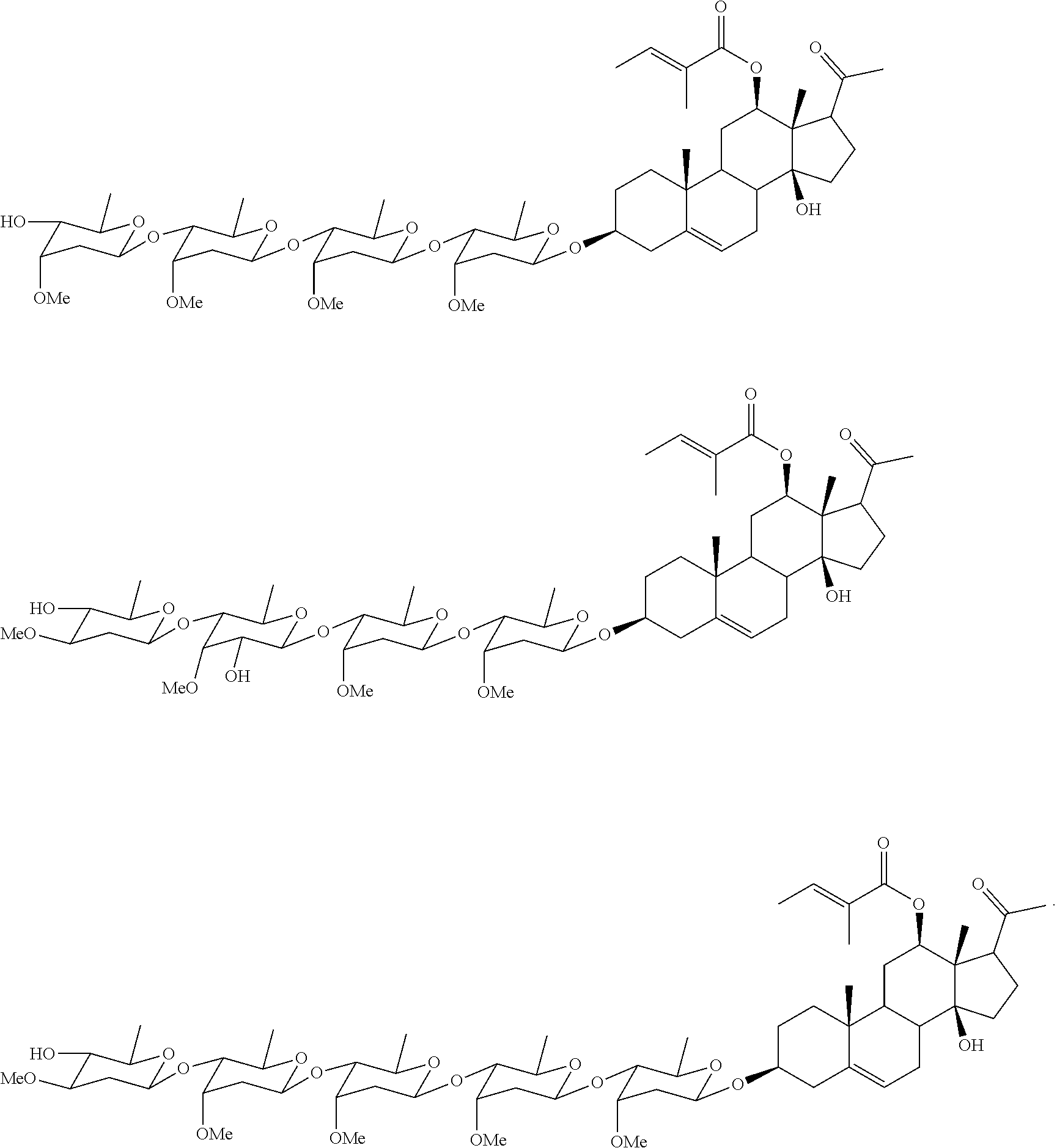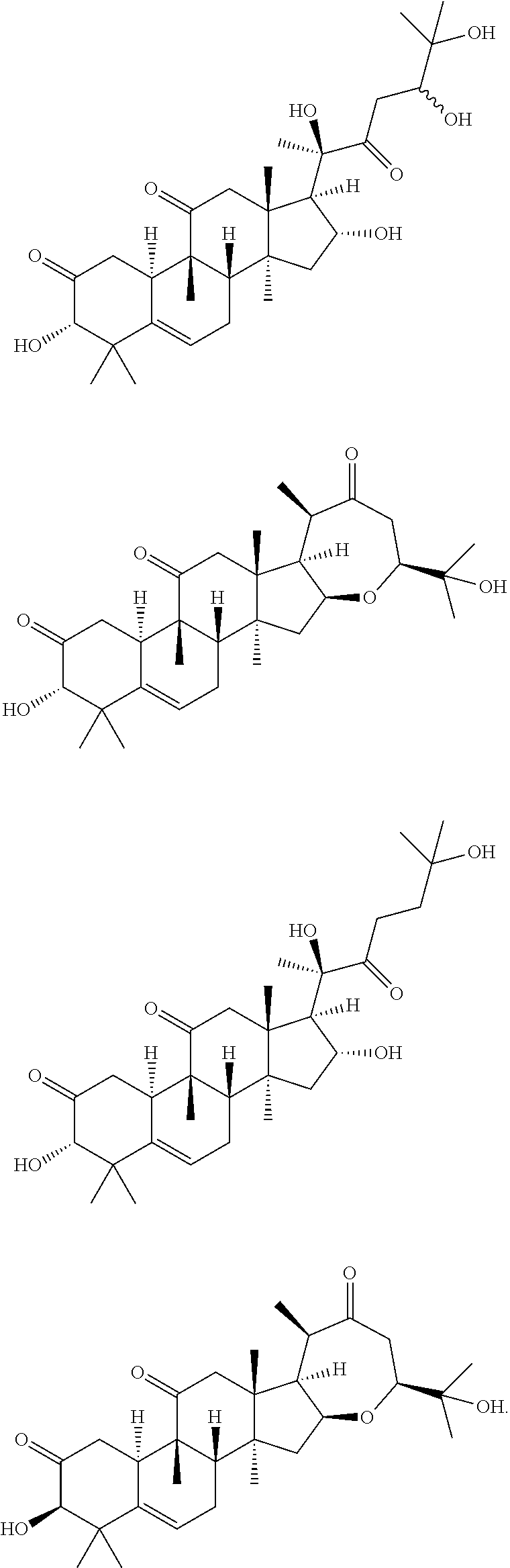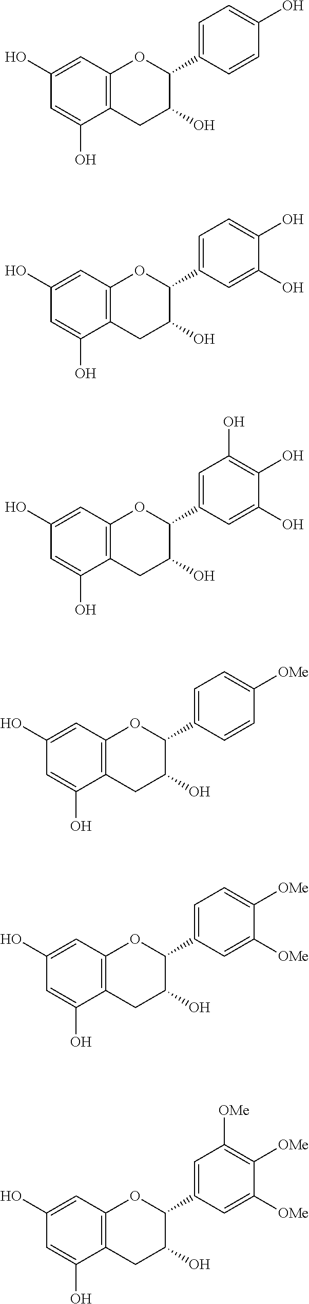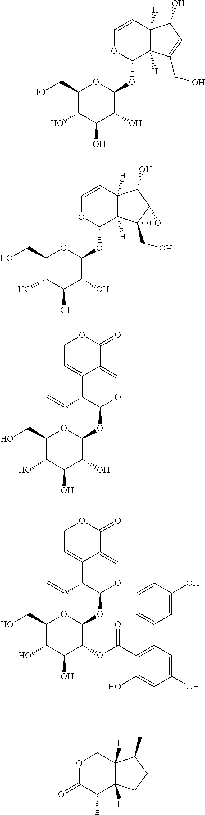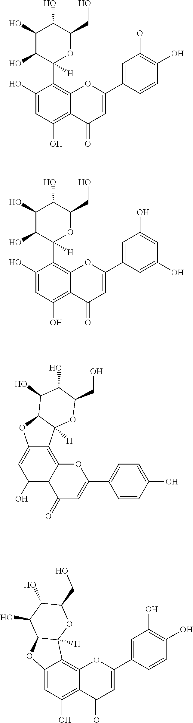 MONOTERPENE Perillartine (10)b 370 SESQUITERPENES Bisabolanes (+)-Hernandulcin (11) 1,500 4β-Hydroxyhernandulcin (12) N.S.c Acyclic glycoside Mukurozioside IIb (13) ca. 1 DITERPENES Diterpene acid 4β,11α-Dimethyl-1,2,3,4,5,10- Pine tree 1,300-1,800d hexahydro-fluorene-4α,6α- dicarboxylic acid (14)b ent-Kaurene glycosides Dulcoside A (15) 30 (Compositae) Rebaudioside A (4) 242 Rebaudioside B (16) 150 Rebaudioside C (17) 30 Rebaudioside D (18) 221 Rebaudioside E (19) 174 Rebaudioside F (20) N.S.c Rubusoside (21) 115 Steviolbioside (22) 90 Steviol 13-0-β-D-glucoside (23) N.S.c Stevioside (5) 210 Suavioside A (24) N.S.c Suavioside B (25) N.S.c Suavioside G (26) N.S.c Suavioside H (27) N.S.c Suavioside I (28) N.S.c Suavioside J (29) N.S.c Labdane glycosides Baiyunoside (30) 500 Phlomisoside I (31) N.S.c Gaudichaudioside A (32) 55 (Compositae) TRITERPENES Cucurbitane glycosides Bryodulcoside N.S.c Bryoside (33) N.S.c Bryonoside (34) N.S.c Carnosifloside V (35) 51 Chen (Cucurbitaceae) Carnosifloside VI (36) 77 Mogroside IV (37) 233-392d Zhange(Cucurbitaceae) Mogroside V (2) 250-425d 11-OxomogrosideV(38) N.S.c Scandenoside R6 (39) 54 Z.L. Chen (Cucurbitaceae) Scandenoside R11 (40) N.S.c Siamenoside I (41) 563 Cycloartane glycosides Abrusoside A (42) 30 Wall et W.& A. (Leguminosae) Abrusoside B (43) 100 Abrusoside C (44) 50 Abrusoside D (45) 75 Abrusoside E (46) N.S.c Dammarane glycosides Cyclocarioside A (47) 200 Iljinsk (Juglandaceae) Cyclocaryoside I (48) 250 Gypenoside XX (49) N.S.c Makino (Cucurbitaceae) Oleanane glycosides Albiziasaponin A (50) 5 (Leguminosae) Albiziasaponin B (51) 600 Albiziasaponin C (52) N.S.c Albiziasaponin D (53) N.S.c Albiziasaponin E (54) N.S.c Apioglycyrrhizin (55) 300 (Leguminosae) Araboglycyrrhizin (56) 150 Glycyrrhizin (1) 93-170d (Leguminosae) Periandrin I (57) 90 (Vell.) Taub. (Leguminosae) Periandrin II (58) 95 Periandrin III (59) 92 Periandrin IV (60) 85 Periandrin V (61) 220 Secodammarane glycosides Pterocaryoside A (62) 50 (Juglandaceae) Pterocaryoside B (63) 100 STEROIDAL SAPONINS Osladin (64) 500 (Polypodiaceae) Polypodoside A (65) 600 DC. Eaton (Polypodiaceae) Polypodoside B (66) N.S.c Telosmoside A8(67) N.S.c Merr. (Asclepiadaceae) Telosmoside A9(68) N.S.c Telosmoside A10(69) N.S.c Telosmoside A11(70) N.S.c Telosmoside Al2(71) N.S.c Telosmoside A13(72) N.S.c Telosmoside A14(73) N.S.c Telosmoside A15(74) 1000 Telosmoside A16(75) N.S.c Telosmoside A17(76) N.S.c Telosmoside A18(77) N.S.c PHENYLPROPANOIDS trans-Anethole(78)f 13 Trans-Cinnamaldehyde (79) 50 Kanehira (Lauraceae) DIHYDROISOCOUMARIN Phyllodulcing(3) 400 Seringe var. Makino (Saxifragaceae) FLAVONOIDS Dihydrochalcone glycosides Glycyphyllin (80) N.S.c Naringin dihydrochalconec(81) 300 Neohesperidin dihydrochalconec(82) 1,000 Phlorizin (83) N.S.c Et Zucc. (Symplocaceae) Trilobatin (84) N.S.c Dihydroflavonols and Dihydroflavonols glycosides 3-Acetoxy-5,7-dihydroxy-4'- N.S.c methoxyflavanone (85) K. Schum. (Zingiberaceae) 2R,3R-(+)-3-Acetoxy-5-7-4'- N.S.c trihydroxyflavanone (86) Dihydroquercetin 3-O-acetate 4'- 400 methyl etherc(87) & Arn.) Cabrera (Compositae) (2R,3R)-Dihydroquercetin 3-O- 80 acetate (88) K. Parker (Compositae) (2R,3R)-2,3-Dihydro-5,7,3',4'- 25 tetrahydroxy-6-methoxy-3-O- acetylflavonol (89) (2R,3R)-2,3-Dihydro-5,7,3',4'- 15 tetrahydroxy-6- methoxyflavonol (90) (2R,3R)-2,3-Dihydro- 20 5,7,4'-trihydroxy-6-methoxy- 3-O-acetylflavonol (91) Huangqioside E. (92) N.S.c Hance (Juglandaceae) Neoastilbin (93) N.S.c PROANTHOCYANIDINS Cinnamtannin B-1 (94) N.S.c Meisner (Lauraceae) Cinnamtannin D-1 (95) N.S.c Selligueain A (96) 35 Bory (Polypodiaceae) Unnamed (97) N.S.c Nakaike; Ching (Aspidiaceae) Unnamed (98) N.S.c BENZONINDENO[1,2-d]PYRAN Hematoxylin (99) 120 L. (Leguminosae) AMINO ACID Monatin (100) 1,200-1,400d A. Meeuse (Acanthaceae) PROTEINS Brazzein 2,000 Baillon (Pentadiplandraceae) Curculin 550 (Hypoxidaceae) Mabinlin N.S.c (Capparidaceae) Monellin 3,000 (Stapf) Diels. (Menispermaceae) Pentadin 500 Bailon (Pentadiplandraceae) Thaumatin 1,600 (Bennett) Benth. (Marantaceae) aValues of relative sweetness on a weight comparison basis to sucrose (=1.0) bSemisynthetic derivative of natural product. cN.S. = Sweetness potency not given. dRelative sweetness varied with the concentration of sucrose. eFormerly named fIdentified as a sweet-tasting constituent of these six species. However, this compound has a wider distribution in the plant kingdom. gThe plant of origin may be crushed or fermented in order to generate phyllodulcin Methods of Treatment