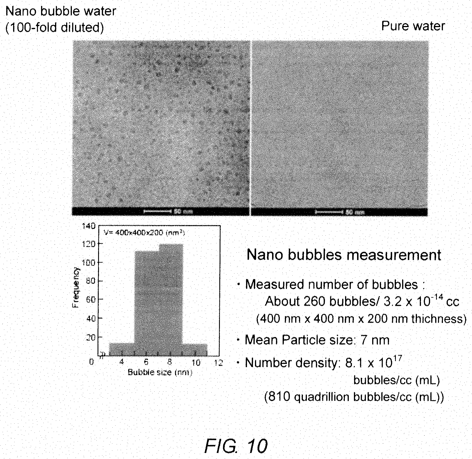 FIG. 10 shows photographs of electron microscopic image of amorphous ice of frozen pure water that contains air nano bubbles, and amorphous ice of frozen pure water (water without nano bubbles). As for the air nano bubble water, the particle size distribution (a histogram to show the particle size variance) is displayed under the electron microscope photograph.