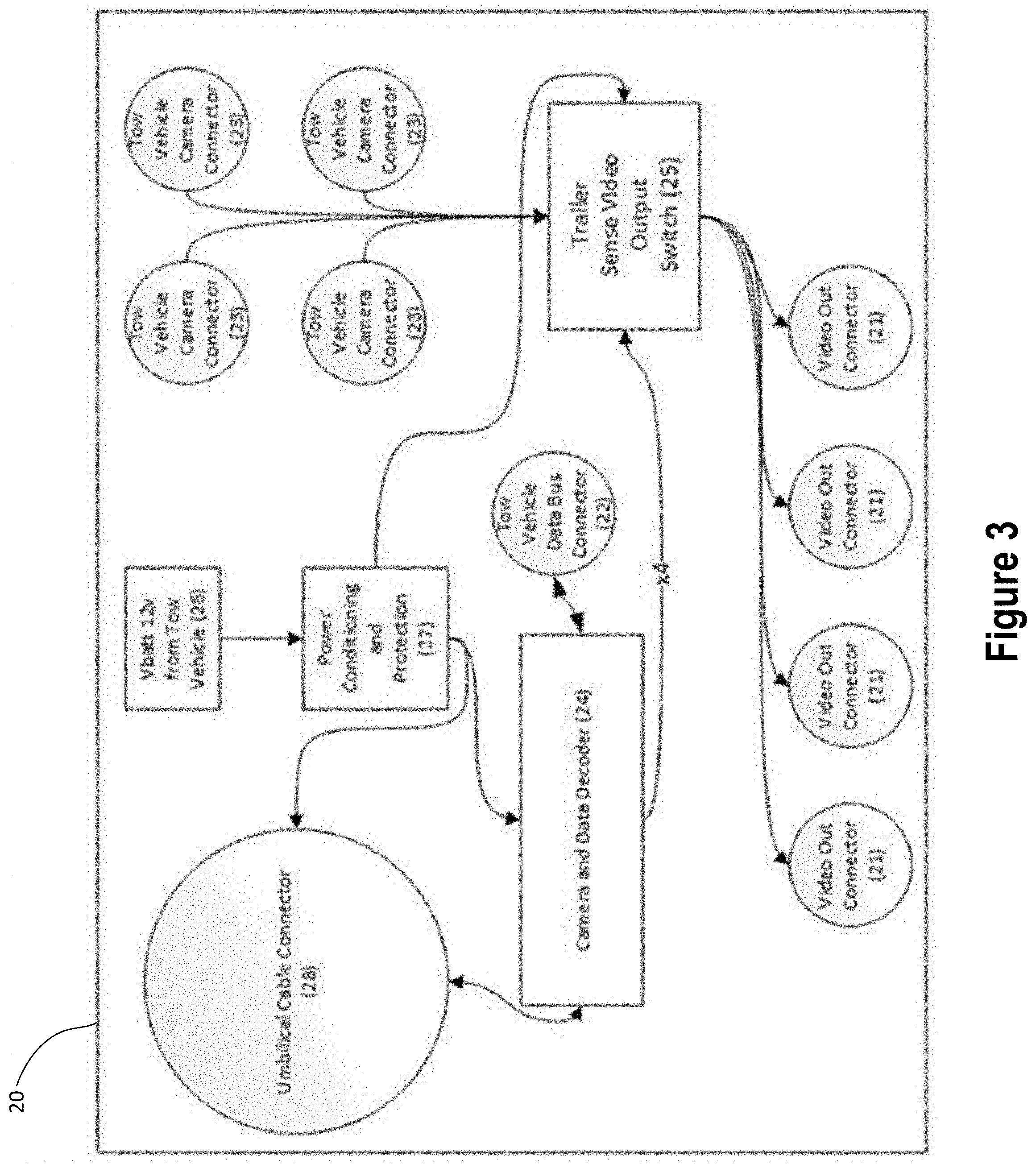 In FIG. 3 is shown an example of the tail box 20 that is provided within an enclosure that attached to or inside the tow vehicle 50 at the rear of the tow vehicle 50. The enclosure may be an IP rated enclosure. The tail box 20 may include an umbilical cable connector 28 for connecting to the umbilical cable 30, or the umbilical cable 30 may be connected directly and permanently to the tail box 20. In the illustrated example, the tail box 20 contains the umbilical cable connector 28, a plurality of tow vehicle camera connectors 23, a plurality of video out connectors 21, a tow vehicle data bus connector 22, as well as the electronics to manage all the signals. The tail box 20 is also connected to the tow vehicle power supply 54 and contains electronics to condition and distribute that power to the tail box 20, nose box 10 and cameras 52, 42 that are attached to the system. In particular, the tail box 12 includes the 12 volt nominal power input 26 from the tow vehicle 50 and a power conditioning and protection apparatus 27 which is connected to the umbilical cable connector 28, the camera and data decoder 24 and the trailer sense video output switch 25.