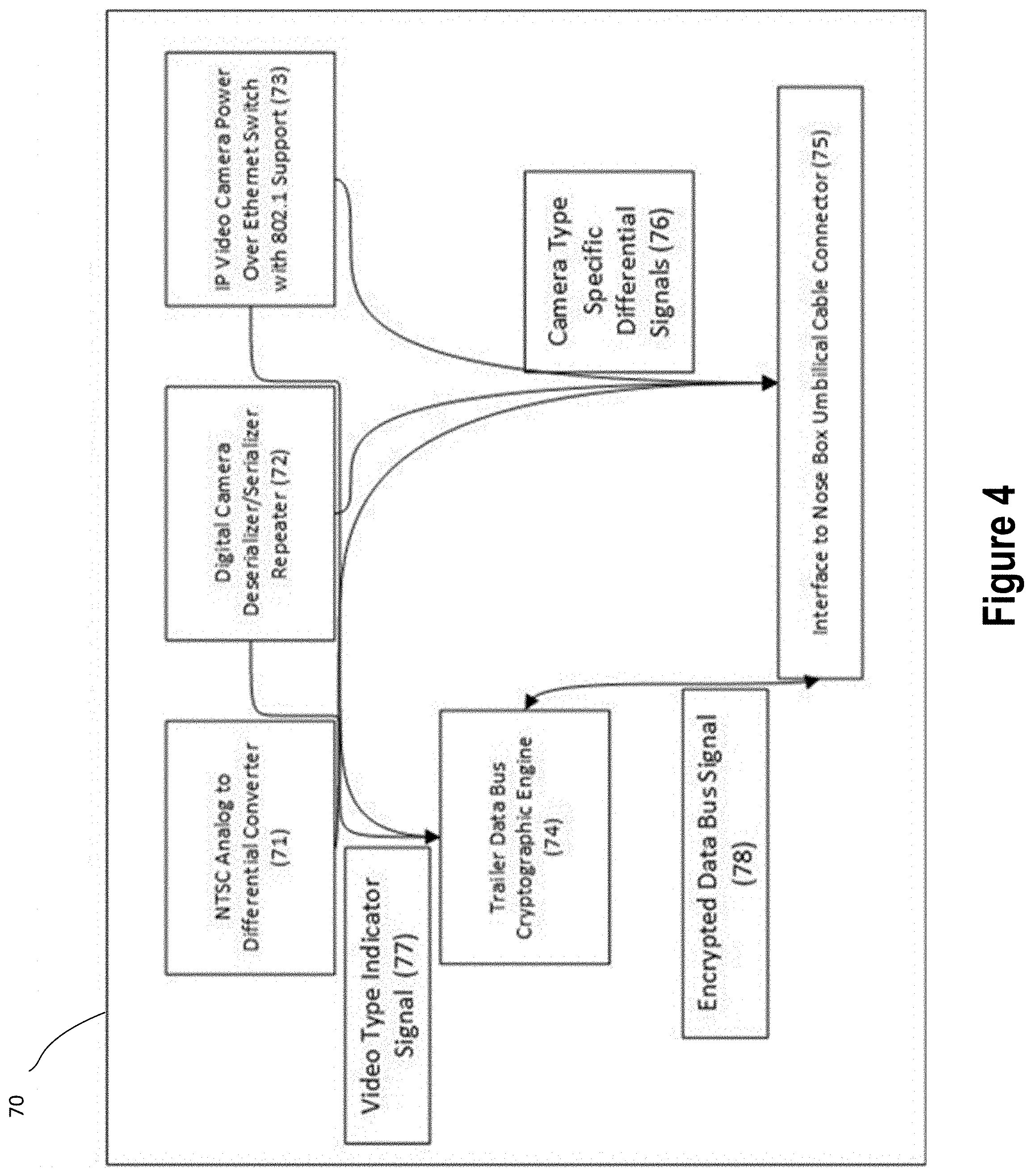 Returning to FIG. 4, the Ethernet switch with 802.11ac support 73 may be connected to a data encoder that operates to encode the video signals and data bus data for communication via the 802.11 link, where it is decoded on the receiving side. Camera type specific signals may be transmitted. For NTSC cameras, the communication could be a simple single wire analog to differential pair converter, for digital cameras this would be done with a deserializer/serializer such as two TI 914/913 SERDES chips connected back-to-back, and for IP video this could simply be an Ethernet signal that brings together all IP video inputs for the nose box 11 and uses four of the umbilical wires 33 pairs. The video differential signal converters 71,72, and 73 also signal to the trailer data bus cryptographic engine 74 what camera type is being used. The trailer data bus cryptographic engine 74 then encodes that information along with the trailer data bus 41 data to pass to the tail box 20 using an encrypted data bus signal 78 over the interface to nose box umbilical cable connector 75.