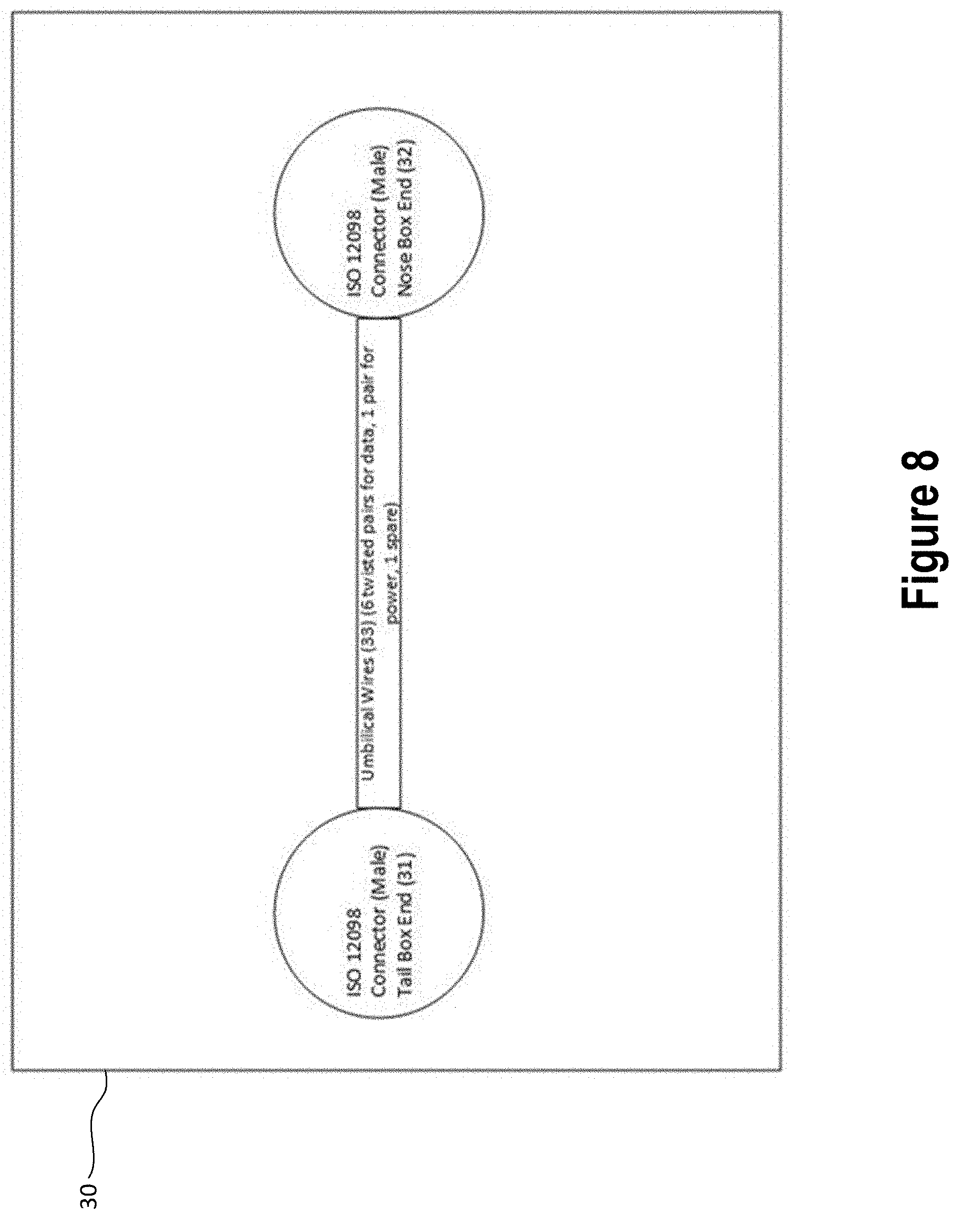 FIG. 8 is a functional block diagram of an umbilical cable for connecting a nose box to a tail box; and