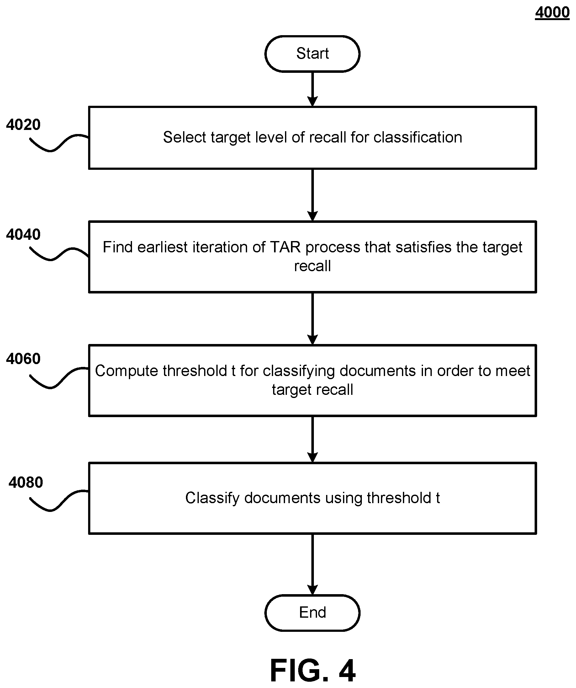FIG. 4 is a process flow diagram that illustrates a method 4000 for selecting a threshold t to achieve a minimum level of recall. In this method, the intermediate results of a TAR process are used to determine a threshold t. For example, the intermediate results stemming from one or more iterations of the process described with respect to FIG. 1 may be used to calculate t. Here, let Uo, U1. . . Ukrepresent the state of the document set U at each iteration j, let {circumflex over (R)}0, {circumflex over (R)}1. . . {circumflex over (R)}krepresent the value of {circumflex over (R)} at each iteration j, and So, S1. . . Skrepresent the scoring function of the classifier computed in each iteration j. In step 4020, a target level of recall TR is selected. In step 4040, the earliest iteration j is found such that {circumflex over (R)}j≥TR·{circumflex over (ρ)}N. In step 4060, t is computed such that