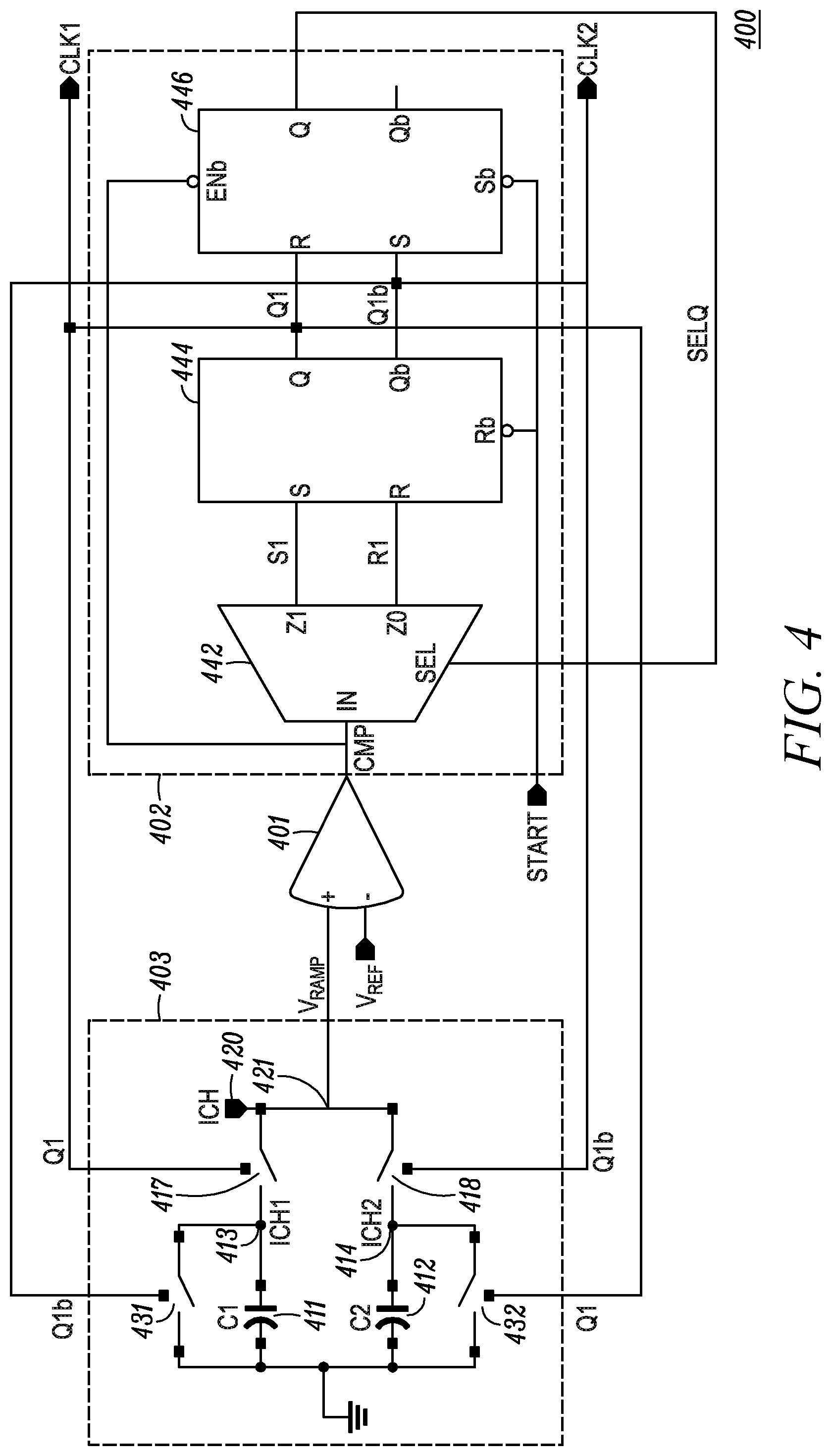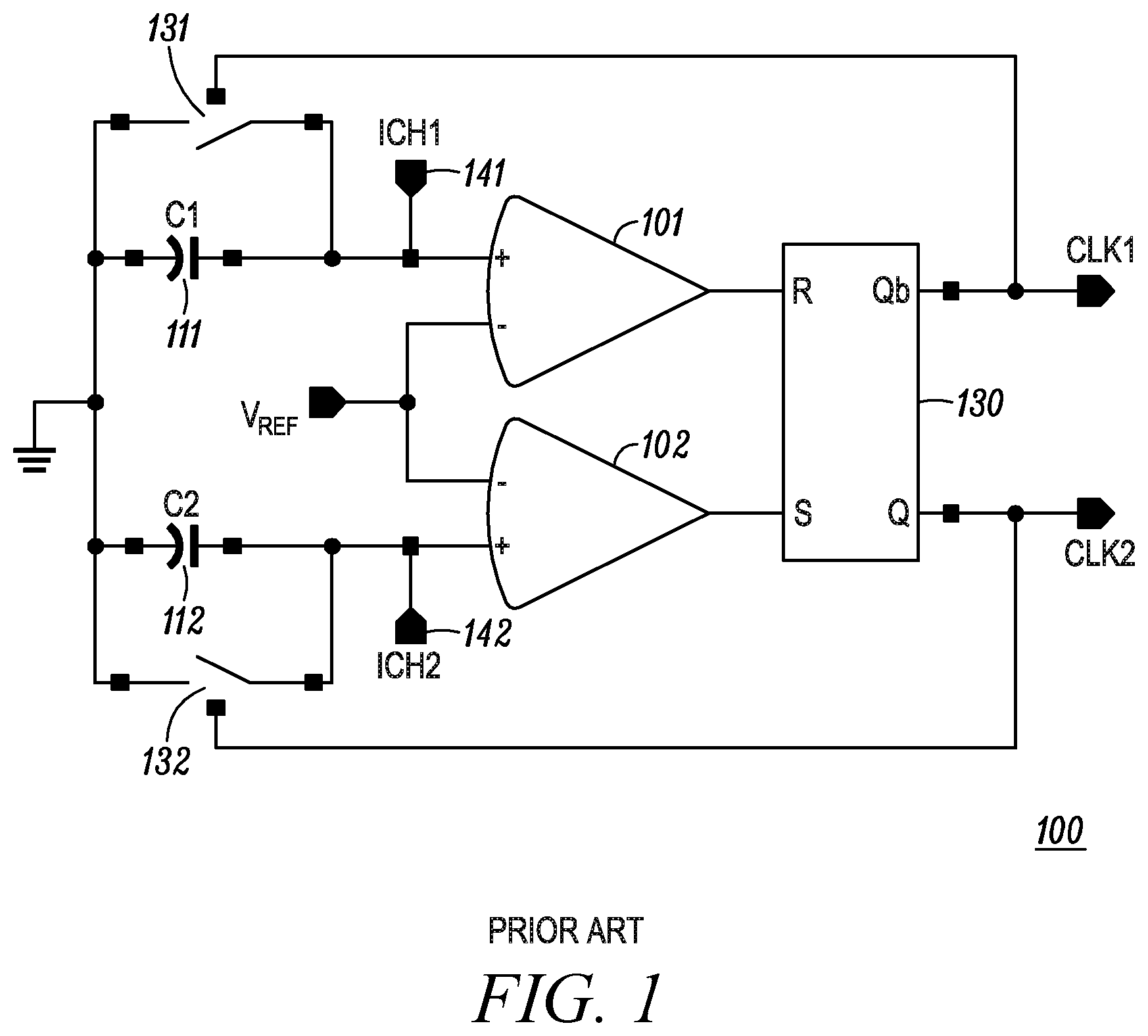 an input terminal for receiving an input current; a ramp voltage generating sub-circuit, coupled to the input terminal, for generating a first ramp voltage and a second ramp voltage during alternate cycles of a clock signal, wherein a frequency of the clock signal is based, in part, on a value of the input current; a ramp voltage selecting sub-circuit for selecting one of the first ramp voltage and the second ramp voltage depending on a value of the first ramp voltage relative to a value of the second ramp voltage; and a switching signal generating sub-circuit for receiving the selected ramp voltage and for generating a switching signal based on a value of the selected ramp voltage relative to a reference voltage, wherein the switching signal generating sub-circuit outputs clock signal CLK1 and clock signal CLK2. 2. The current-controlled oscillator of 3. The current-controlled oscillator of 4. The current-controlled oscillator of 5. The current-controlled oscillator of 6. The current-controlled oscillator of 7. The current-controlled oscillator of 8. The current-controlled oscillator of 9. The current-controlled oscillator of 10. The current-controlled oscillator of 11. The current-controlled oscillator of