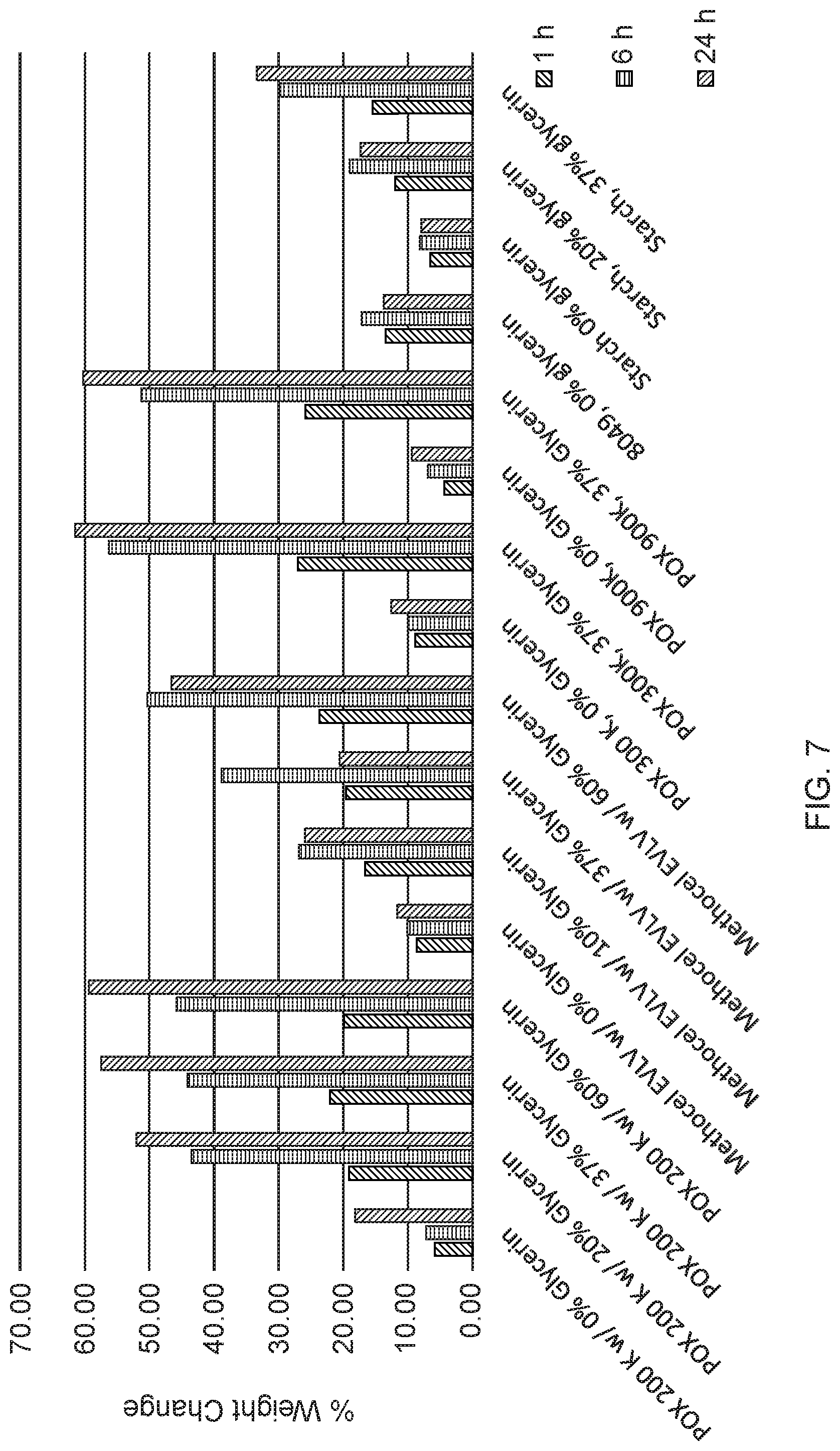 Modulus Drop [100 * (Initial − Modulus (MPa) Final)/Initial] 25 C. 37 C. 37 C. vs. 25 C. 40% 75% 90% 40% 75% 90% 75% vs. 90% vs. Sample No. RH RH RH RH RH RH 40% 40% 1. Methocel E5LV 0% 1925 1122 61 1235 650 100 66.23 94.81 Glycerin 2. Methocel E5LV 37% 417 30 5 428 34 5 91.85 98.80 Glycerin 3. PEO 200K 0% 395 224 38 232 141 3 64.30 99.24 Glyercin 4. PEO 200K 37% 126 23 116 100.00 100.00 Glycerin Foamed EVA 22 23 24 14 14 14 36.36 36.36 Backing Layer Methocel E5LV is hydroxpropyl methylcellulose available from Dow Chemical.