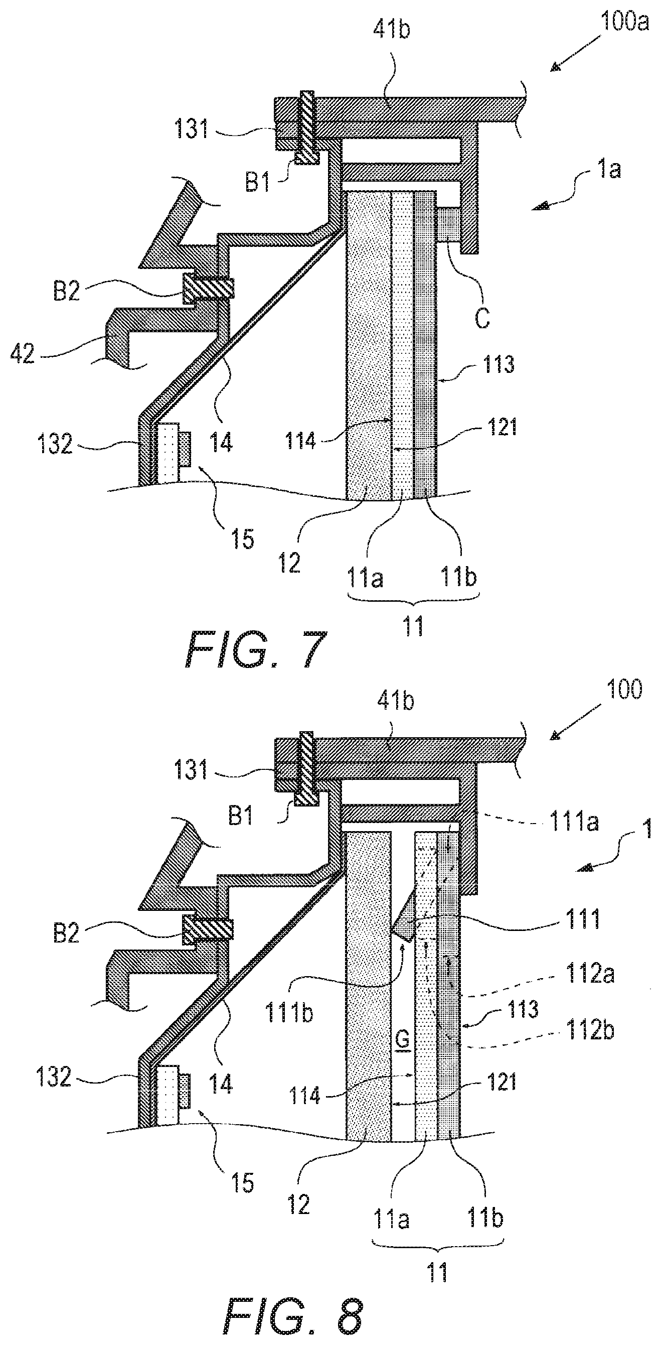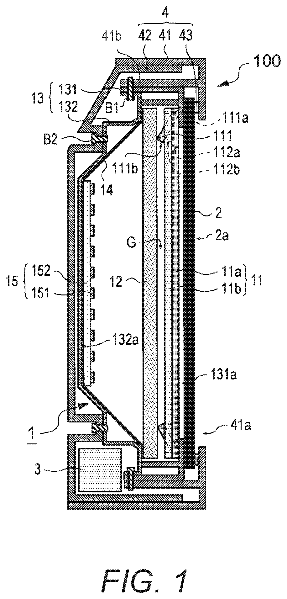 With this configuration, even though the optical sheet 11a is not provided with a portion that engages with the latching component 111 (such as the opening 112b into which the latching component 111 is inserted), the area near the edge 115 of the optical sheet 11a can be sandwiched between the latching component 111 and the specific portion of the optical sheet 11b other than the latching component 111. In other words, even though the optical sheet 11a is not processed, the above-mentioned sandwiching structure can be formed at the optical sheets 11a and 11b, and these optical sheets can be brought into close contact with each other.