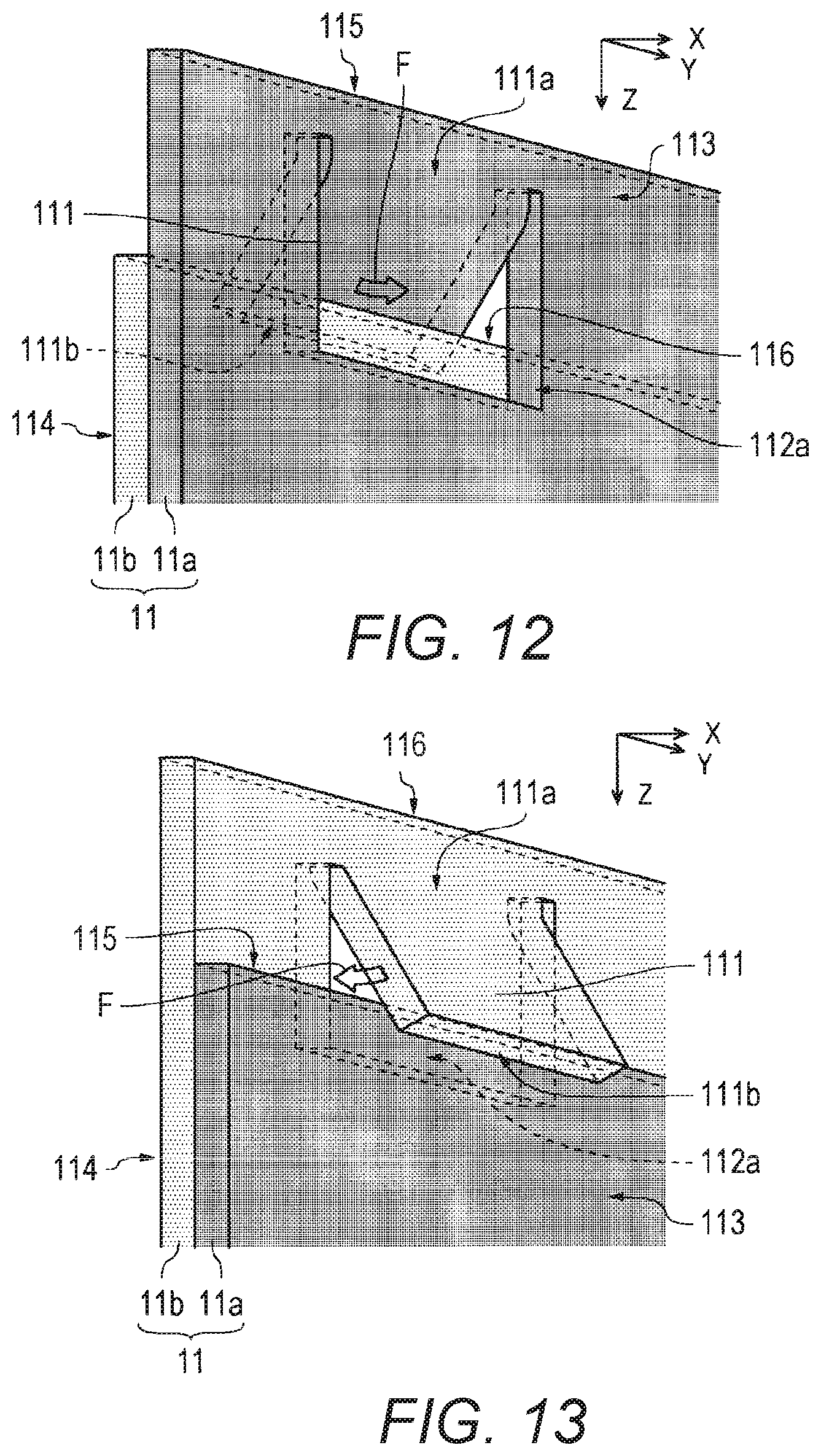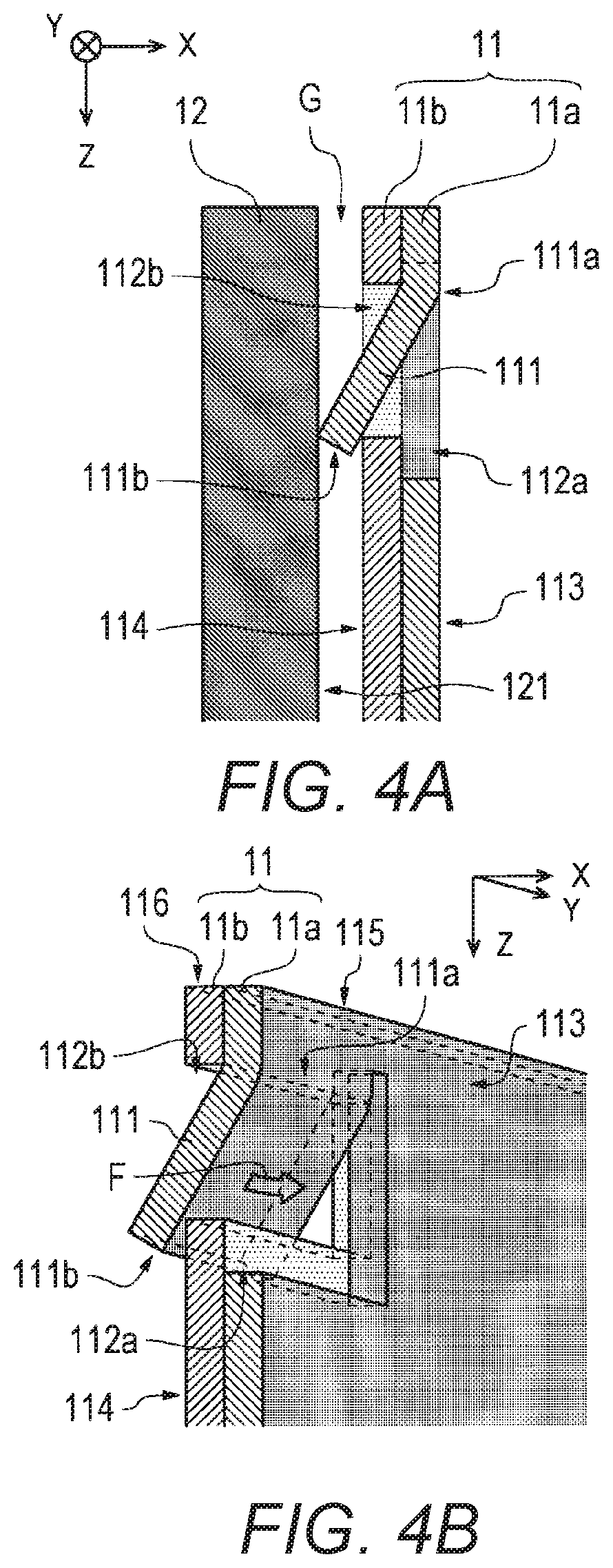 Furthermore, as shown in FIG. 16, the optical sheet laminate 11 can further have an optical sheet 11d (e.g., fourth optical sheet) with respect to the configuration shown in FIG. 2. The optical sheet 11d at least partially contacts with the optical sheet 11b (e.g., at least one second optical sheet). In this modification example, as shown in FIG. 16, the optical sheet 11b further has a pair of openings 112d (e.g., third openings). Thus, as shown in FIG. 16, the optical sheet 11b has the openings 112b and the openings 112d at different locations. Furthermore, the optical sheet 11d has a pair of latching components 311 (e.g., third latching components). With the optical sheet laminate 11 in this modification example, the latching components 311 of the optical sheet 11d are disposed through the openings 112d, respectively, in a manner similar to the above-mentioned embodiment. Then, the optical sheet 11b is sandwiched between the latching component 311 and a specific portion of the optical sheet 11d other than the latching component 311.