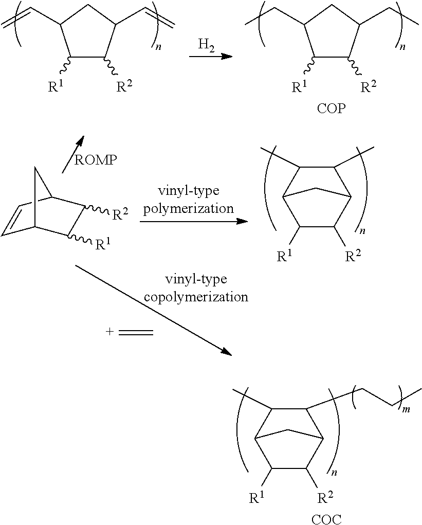 Comparative properties of COP and COC Resin COP COC Elongation 20% 2.6% at yield Tensile modulus 341.4 ksi or 1519 kN 421 ksi or 1873 kN Tg (° C.) 136 142 Drop impact Won't shatter easily Shatters easily when dropped when dropped Extractables Lower Higher Purity Contains less low Contains more low MW additives or Mw additives or process aids process aids EXAMPLES