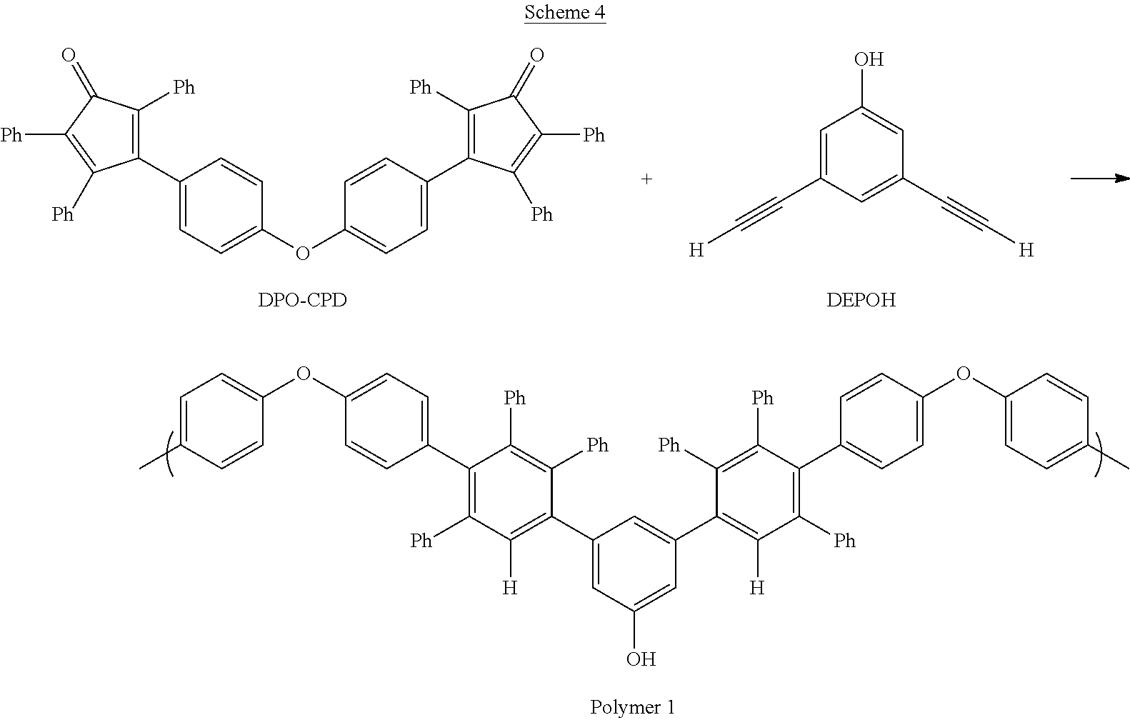 wherein each R is as defined above for the monomers of formula (1); Ar5is a C6-30-aromatic moiety; each Y2is independently a single chemical bond or a divalent linking group chosen from —O—, —S—, —S(═O)—, —S(═O)2—, —C(═O)—, —(C(R9)2)z—, C6-30-aryl, and —(C(R9)2)z1—(C6-30-aryl)-(C(R9)2)z2—; each R15is independently chosen from C1-4-alkyl, C1-4-haloalkyl, C1-4-alkoxy, optionally substituted C7-14-aralkyl, and optionally substituted C6-10-aryl; b4=1 or 2; and f=0 to 4; z is 1 to 10; z1 is 0 to 10; z2 is 0 to 10; and z1+z2=1 to 10. “Substituted aralkyl” refers to an aralkyl moiety having one or more of its hydrogens replaced with one or more substituents chosen from halogen, C1-6-alkyl, C1-6-haloalkyl, C1-6-alkoxy, C1-6-haloalkoxy, phenyl, and phenoxy, preferably from halogen, C1-6-alkyl, C1-4-haloalkyl, C1-6-alkoxy, C1-4-haloalkoxy, and phenyl, and more preferably from halogen, C1-6-alkyl, C1-6-alkoxy, phenyl, and phenoxy. Fluorine is the preferred halogen. In formula (13), it is preferred that each R is independently H or C6-10-aryl, and more preferably H or phenyl. It is preferred that each R15is independently chosen from C1-4-alkyl, C1-4-fluoroalkyl, C1-4-alkoxy, benzyl, phenethyl, phenyl, naphthyl, substituted phenyl and substituted naphthyl, more preferably C1-2-alkyl, C1-4-fluoroalkyl, C1-2-alkoxy, phenyl, and substituted phenyl, and yet more preferably from C1-2-alkyl, C1-4-fluoroalkyl, C1-2-alkoxy, and phenyl. Preferably, b4=2. Preferably, f=0 to 3, more preferably 0 to 2, and yet more preferably f=0. Ar5may be any suitable C6-30aromatic moiety, such as, without limitation, phenyl, naphthyl, anthracenyl, phenanthryl, tetracenyl, pyrenyl, perylenyl, coronenyl, pentacenyl, triphenylenyl, tetraphenyl, benzotetracenyl, biphenyl, binaphthyl, diphenyl ether, and dinaphthyl ether. Preferably, optional monomers of formula (13) comprise 2 or 3 alkynyl moieties having a terminal hydrogen or terminal phenyl moiety. Any 2 alkynyl moieties in the monomers of formula (13) may have an ortho, meta or para relationship to each other, and preferably a meta or para relationship to each other. Preferably, the alkynyl moieties do not have an ortho relationship to each other. A single optional monomer of formula (13) may be used to prepare the present polymers, or two or more optional monomers of formula (13) but different from each other may be used. When a single optional monomer of formula (13) is used, it is preferred that b4=2. In one preferred embodiment, the present polymers further comprise as polymerized units a monomer of formula (13), and more preferably a monomer of formula (13) wherein b4=2. In an alternate preferred embodiment, the present polymers further comprise as polymerized units one monomer of formula (13) wherein b4=1, and another monomer of formula (13) wherein b4=2.