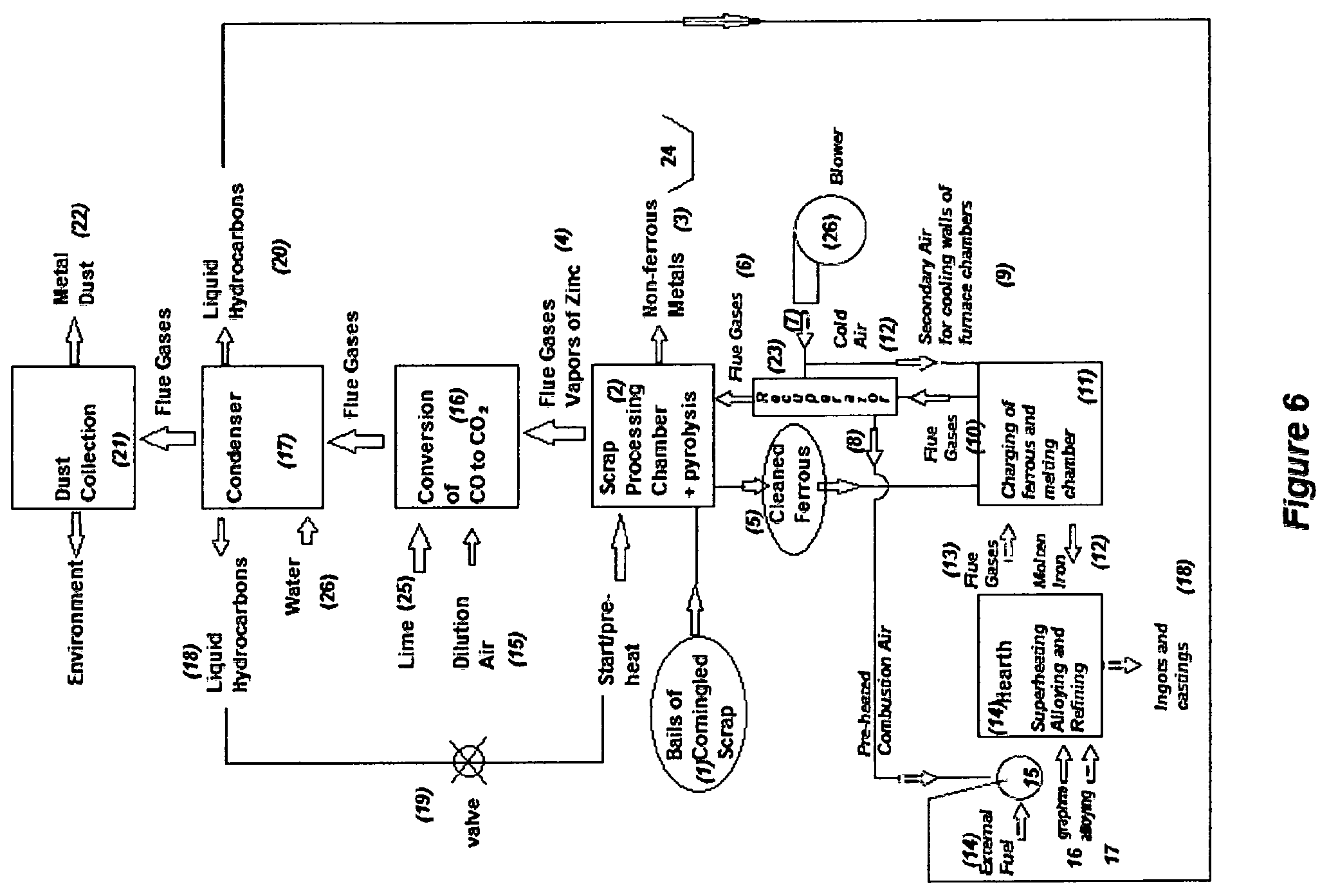 a.) introducing comingled bails of scrap to a first chamber of a three chambered furnace and heating to a temperature of 600-1000° C. by applying flue gases resulting from other part of the furnace to pyrolyze rubber and plastics producing a flue gas; and heating and melting zinc contained in said bail of scraps; separating the pyrolyzed gases from the rubber and plastics and separating the zinc from galvanized steel and to promote the melting of non-ferrous metals within comingled scrap leaving a mass of ferrous scrap; b.) feeding the ferrous scrap following treatment in the first chamber into a second, intermediary chamber, mixing the ferrous scrap with pig iron or iron carbide, for direct iron reduction which is melted and shaped into a briquettes or pellets, and urging the briquettes or pellets to a third chamber reverberating furnace hearth; c.) melting and alloying said ferrous briquettes or pellets within a third chamber of said hearth furnace including the step of removing sulfur, phosphorous and other contaminants contained in the said scrap, the ferrous briquettes or pellets. 2. A process as claimed in 3. The process according to 4. The process of 5. The process of