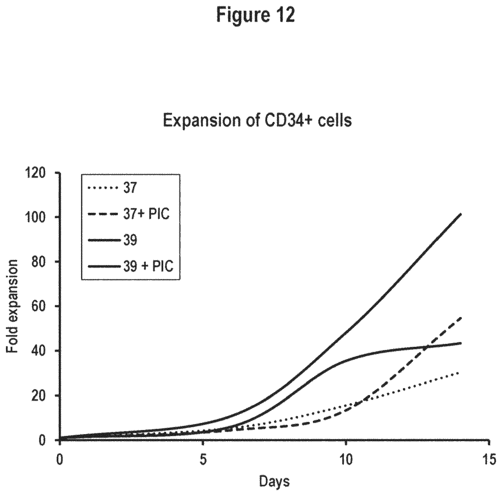FIGS. 19, 20 and 21 show the fold-expansion of CD34+ cells (hematopoietic stem cells), CD34+/CD45RA− cells (LT-HSCs), and CD34+/CD38−/CD45RA− cells (Majeti et al., 2007), respectively, after 7, 10, and 14 days in culture.