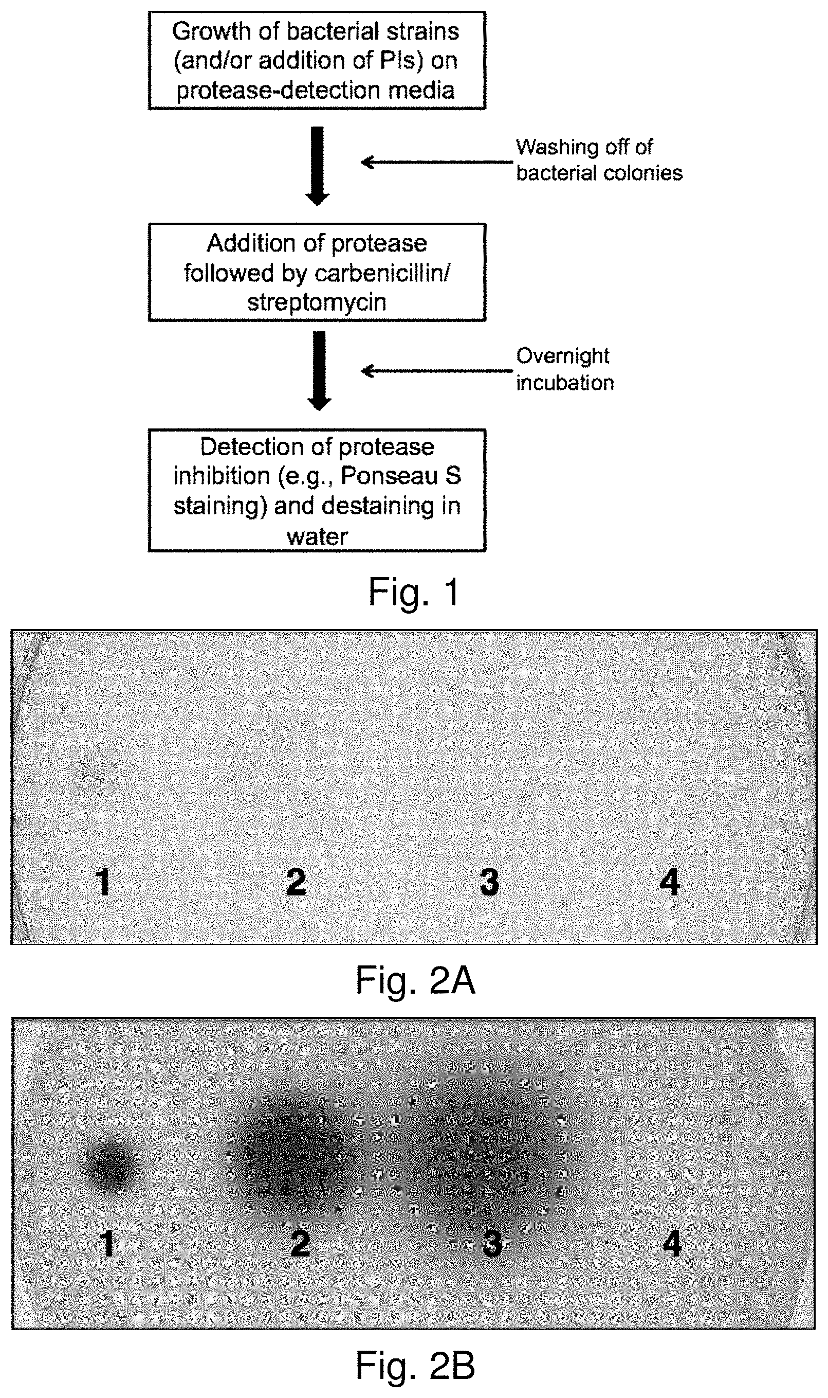 Other protease inhibition assays based on individual clones or strains are already known to those skilled in the arts, and generally couple a biochemical test for proteolysis with purified fractions that potentially contain protease inhibitors. The protease inhibition assays as conducted by Wee et al. (2000) for identification of the P. luminescens protease inhibitor utilizes ammonium sulfate precipitation of the culture supernatant, redisolution of the precipitate in phosphate buffer, dialysis, separation by isoelectric focusing, and then testing of fractions for inhibitory activity using azocoll (Chavira et al., 1984 Assaying proteases with azocoll, Analytical Biochem. 136: 446-450). Inhibitory activity can also be monitored by determining hydrolysis of the chromogenic peptide N-a-benzoyl-DL-arginine-p-nitroanilide (BAPNA) or by following the change in absorbance at 275 nm of the protease substrate Na-p-tosyl-L-argininemethylester. The purified protease inhibitor is then identified by MALDI-TOF (Webster and Oxley 2012, Protein identification by MALDI-TOF mass spectrometry, Methods in Molecular Biology 2012; 800:227-40. doi: 10.1007/978-1-61779-349-3_15; Yukihira et al., 2010 MALDI-MS-based high-throughput metabolite analysis for intracellular metabolic dynamics, Analytical Chemistry, 15; 82(10):4278-82. doi: 10.1021/ac100024w).