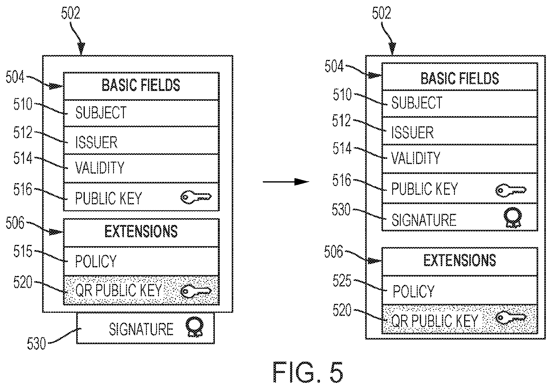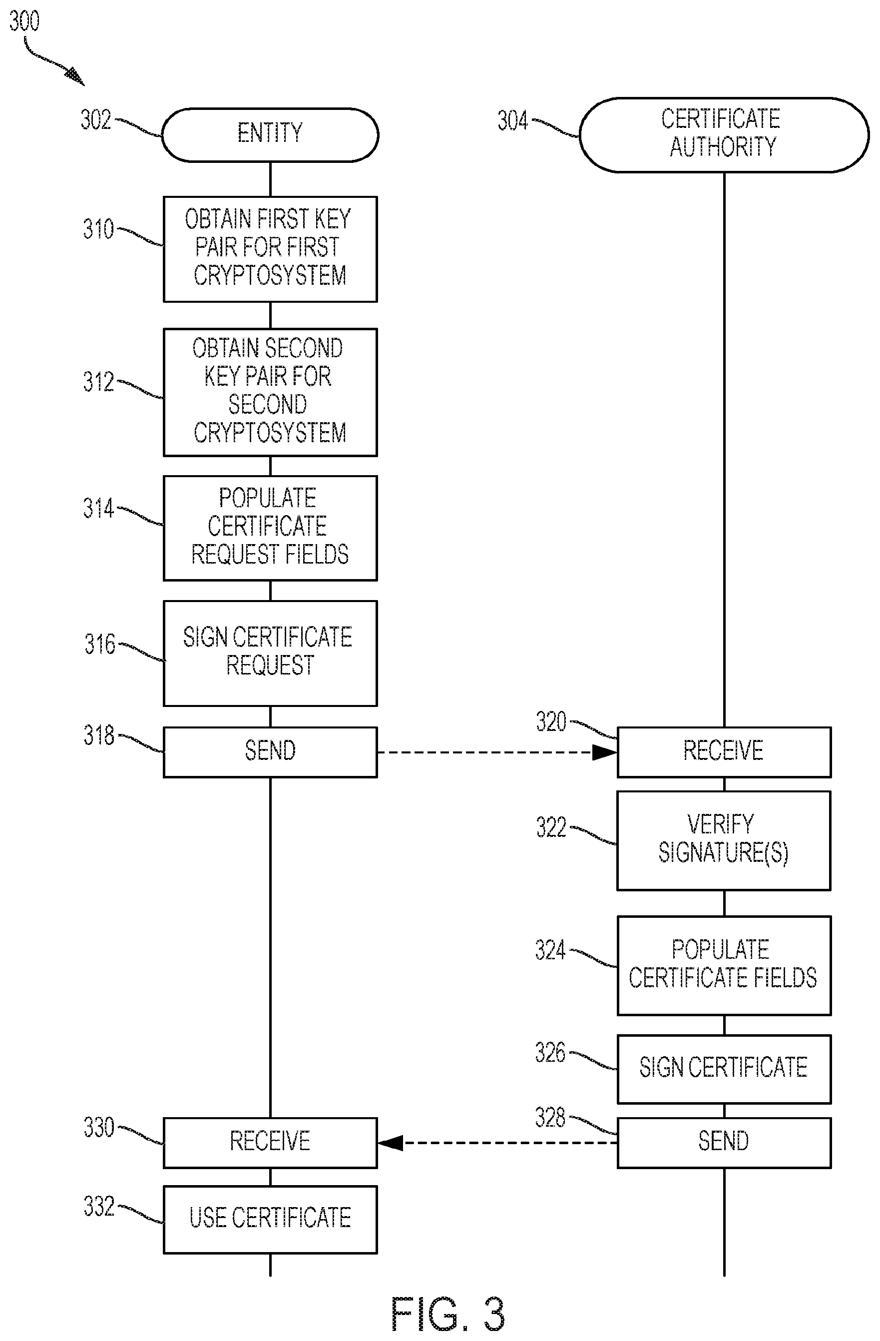 a plurality of signatures of a certificate authority, the plurality of signatures comprising a first digital signature of the certificate authority and a second digital signature of the certificate authority; a first public key field comprising a first public key of an entity, the first public key of the entity associated with a first cryptosystem; a signature value field comprising the first digital signature of the certificate authority, the first digital signature associated with the first cryptosystem; and an extension comprising: