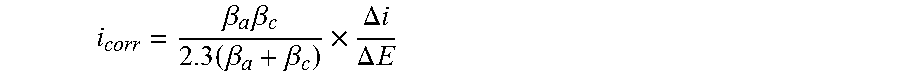 where E.W. is the equivalent weight of the corroding species, g. In this case, the corroding species is Zn, so E.W.=32.7 g. Icorr, is the corrosion current density in μA/cm2, and d is the density of the corroding species. Density of zinc is 7.140 g/cm3.