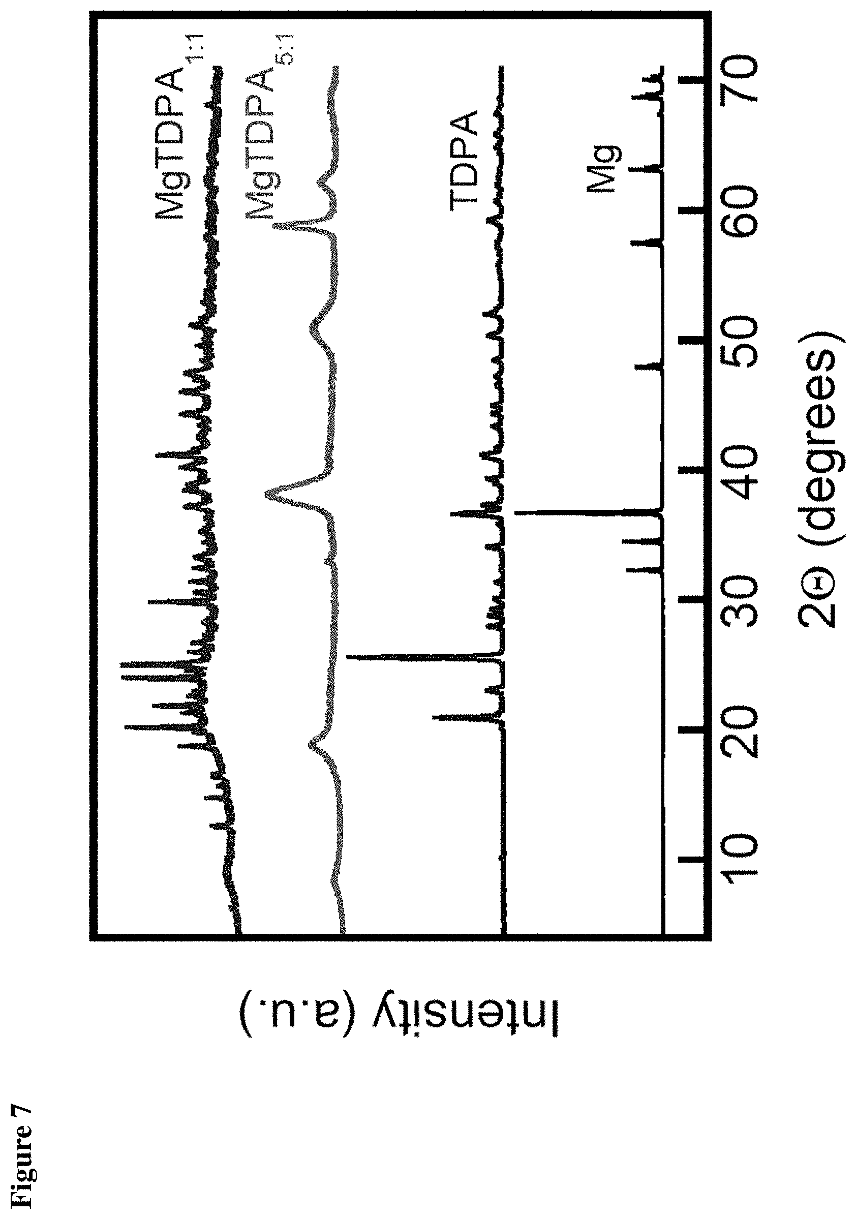 Following the coating processes, the coated steel panels were scribed in a controlled fashion and subjected to the immersion and cyclical salt-spray tests (see Examples 11 and 12). Immersion Tests with an Exemplary Thioether Salt Prior to the commencement of the immersion test, the coated panels were scribed with a scalpel blade making 100 μm-wide and 3 cm-long cuts exposing the bare steel surfaces. The tests were conducted by complete immersion of the coated panels in 3.5 wt % aqueous NaCl solutions (pH 5.25) at 25° C. Quantitative measurements of the scribe creep were conducted at the conclusion of the immersion tests after 60 days. Following the 60-day immersion, the panels were gently rinsed by deionized water, air-dried and any flaked or blistered coating along the edges of the scribe was removed using an adhesive tape according to ASTM D3359.refScribe creep measurement was performed by taking eight measurements along the length of the scraped scribe. The creep was measured edge-to-edge of the scribe using digital calipers and 3× magnifying glass, then averaged for each panel. Each type of panel (i.e. with and without the corrosion inhibitor) was measured in triplicate using three distinct panels, and the results were averaged among the panels of the same type. The scribed areas were visualized using SEM images (60-day immersion tests, Cyclical Salt-Spray Tests with an Exemplary Thioether Salt The powder coatings prepared with and without the corrosion inhibitor, MgTDPA1:1, were subjected to six cyclical tests in a commercial laboratory according to ISO 11997.refEach cycle consisted of consecutive wet (salt fog), dry, and humidity exposures. That is, each standard cycle corrosion test was set as a combination of neutral salt spray exposure according to ASTM B 117 and ISO 9227 certified tests, 100% condensing humidity according to ISO 6270-2, drying and dwelling. One full corrosion cycle was a week in duration. The coated panels (4″×3″×0.0150″) were scribed using a van Laar Model 426 scratching tool with spherical tungsten scratch needle (Erichsen GmbH & Co., Germany). Ferrous rust run-offs were not observed on the panels after 6 cycles. There was no blistering away from the scribe per ASTM D1654 in any of the tested panels. However, the appearance of white rust powdery deposits was observed on the surface of the scribes as well as in the wash-outs. Following the six cycles, the panels were gently rinsed by deionized water, air-dried and any flaked or blistered coating along the edges of the scribe was removed using an adhesive tape according to ASTM D3359. Scribe creep measurement was performed by taking eight measurements along the length of the scraped scribe. The creep was measured edge-to-edge of the scribe using digital calipers and 3× magnifying glass, then averaged for each panel. Each type of panel (with and without the corrosion inhibitor) was measured in triplicate using three distinct panels, and the results were averaged among the panels of the same type. The scribe creep (widening) was used as a quantifiable parameter of the coating delamination in industry-standard cyclic corrosion tests ( Developments in the field of “green” corrosion inhibitors are directed toward inexpensive, effective molecules of minimal negative environmental impact. In that regard, the magnesium thiodipropionates disclosed herein, which are prepared in water by either a simple replacement reaction of magnesium metal with thiodipropionic acid (TDPA) or metathesis reaction, represent promising entries in the green corrosion inhibitors arsenal. TDPA is a non-toxic, monolayer-forming, non-irritating dicarboxylic acids that is catabolized by microbes, whereas magnesium is more abundant and certainly less expensive than rare earths, carboxylates of which are considered to be green corrosion inhibitors. Yet, magnesium thiodipropionates are quite effective corrosion inhibitors in aqueous media and, for the first time, have been shown here to lower delamination of the powder coatings. This, combined with the observation that magnesium thiodipropionates accelerate benzoxazine polymerization and curing of the epoxy resin with amine hardeners, represents a rarely found synergism of functionalities useful wherever coatings are applied. All U.S. patents and U.S. and PCT published patent applications mentioned in the description above are incorporated by reference herein in their entirety. Having now fully described the present invention in some detail by way of illustration and example for purposes of clarity of understanding, it will be obvious to one of ordinary skill clin the art that the same can be performed by modifying or changing the invention within a wide and equivalent range of conditions, formulations and other parameters without affecting the scope of the invention or any specific embodiment thereof, and that such modifications or changes are intended to be encompassed within the scope of the appended claims.RELATED APPLICATIONS