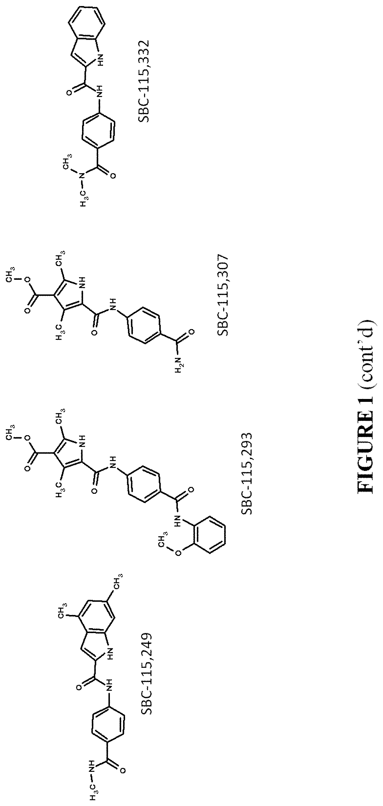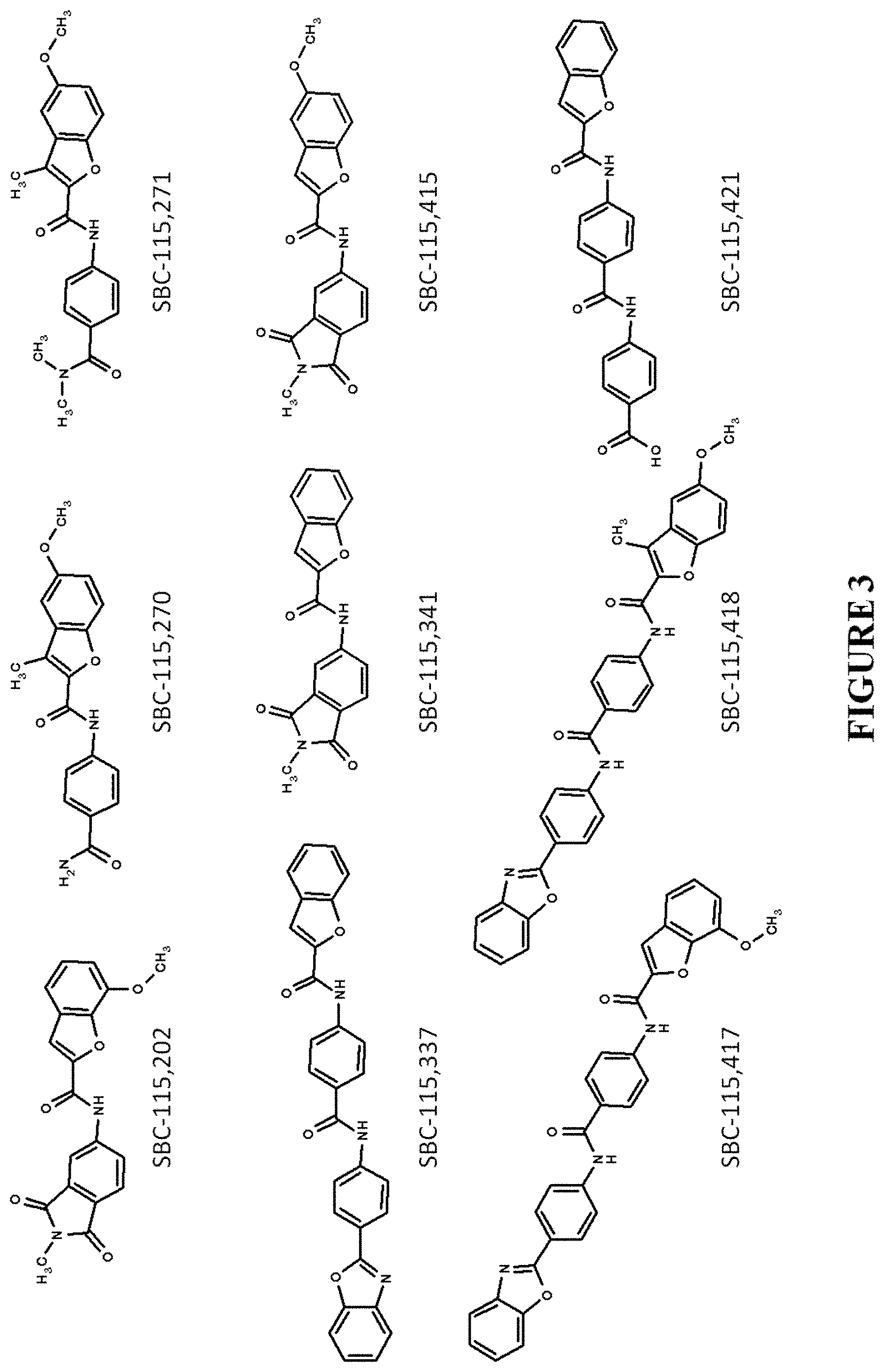 Some of the compounds described herein are obtainable from commercial sources, such as Life Chemicals (SBC-115,202), Enamine (SBC-115,270 and SBC-115,271), ChemBridge (SBC-115,337), and Princeton Biomolecular (SBC-115,341). Other preferred compounds and almost all of the most preferred compounds were not available from commercial sources but were synthesized using methods known to those skilled in the art of organic synthesis.
