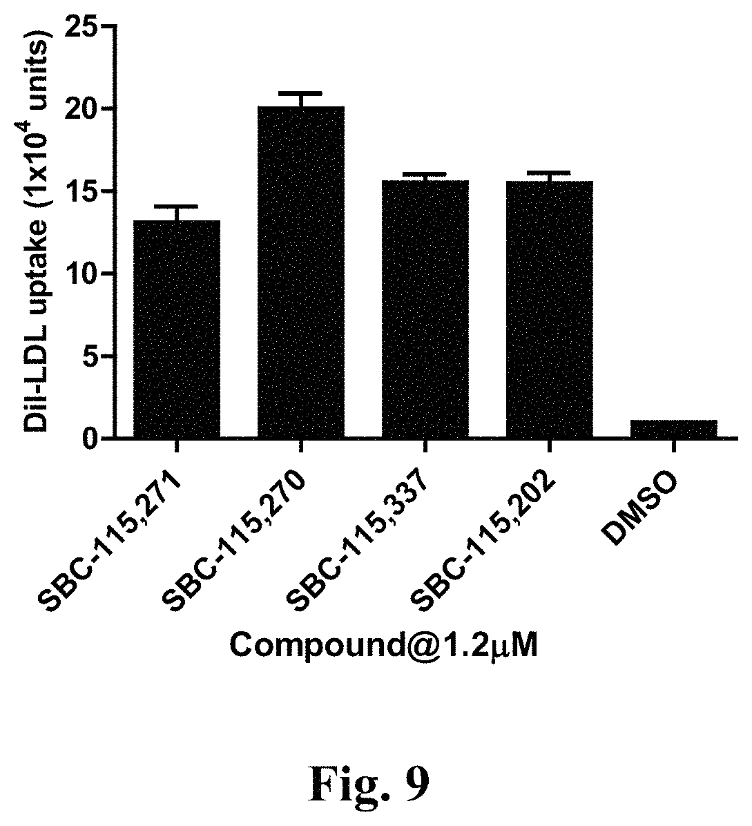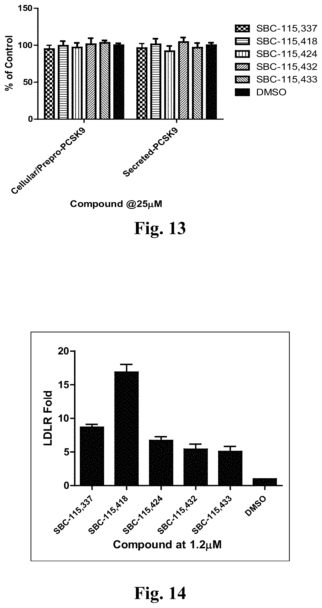 In order to confirm that these PCSK9 antagonists upregulate functional LDLR, we tested the ability of these compounds to enhance the uptake of fluorescent Dil-LDL in HepG2 cells. Briefly, HepG2 cells transfected with PCSK9 (FIG. 4) were plated and allowed to grow overnight. Compounds were added to the cells followed by the addition of fluorescent Dil-LDL. Cells were washed extensively, and the fluorescent Dil-LDL taken up by the cells were measured using the Synergy 2 plate reader (FIG. 9 and FIG. 12). As shown in FIG. 9, our compounds (SBC-115,337, SBC-115,270, SBC-115,271 and SBC-115,202) exhibited an increase in fluorescently labeled LDL uptake in HepG2 treated cells at 1.2 uM. Further analysis of additional selected compounds from our binding studies (Table 1) showed that four compounds (SBC-115,418, SBC-115,424, SBC-115,432 and SBC-115,433) exhibited significant increases in the Dil-LDL uptake at 1.2 uM compound concentration (FIG. 12). These compounds were selected for further analysis in the in vivo studies.