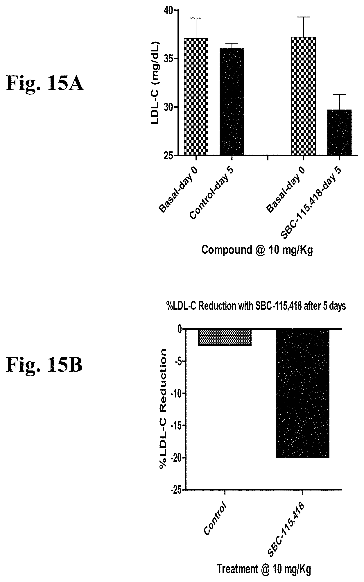 Similarly, SBC-115,418 was tested in mice as described above. C57BL/6 mice were divided into 4 groups of 5 animals in each; two base line groups, a control group that received PBS and a SBC-group that received 10 mg/kg oral daily for 5 days. Blood plasma was collected at day 1 prior to injection of the compounds. Blood plasma was collected again at day 5. Plasma LDL-C levels were measured enzymatically. (A) Representing the actual change in the LDL-C in mg/dL and (B) representing the % reduction of LDL-C after the administration of SBC-115,418 for 5 days. Our data demonstrated that SBC-115,418 lowered LDL-C levels in mice that are fed high fat diet. FIG. 15A and FIG. 15B shows data obtained with SBC-115,418 indicating a 20-25% reduction in LDL-C levels after 5 days of daily oral administration of 10 mg/kg of SBC-115,418 relative to high fat diet animal levels.