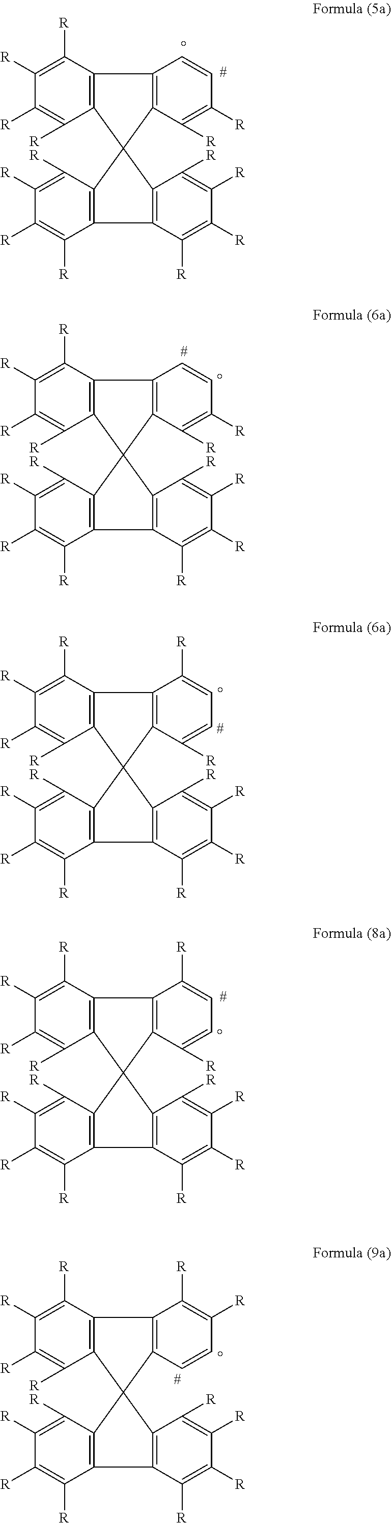 These abovementioned advantages are not accompanied by a deterioration in the further electronic properties. The invention is illustrated in detail by the examples which follow, without any intention of restricting it thereby. The person skilled in the art will be able to use the information given to execute the invention over the entire scope disclosed and to prepare further compounds of the invention without exercising inventive skill and to use them in electronic devices or to employ the process of the invention. The syntheses which follow, unless stated otherwise, are conducted under a protective gas atmosphere. The reactants can be sourced from ALDRICH or ABCR. The numbers given in square brackets for the compounds known from the literature indicate the CAS numbers of these compounds. 2.7 g (110 mmol) of iodine-activated magnesium turnings and a mixture of 25.6 g (110 mmol) of 2-bromobiphenyl, 0.8 mL of 1,2-dichloroethane, 50 mL of 1,2-dimethoxyethane, 400 mL of THF and 200 mL of toluene are used to prepare the corresponding Grignard reagent by trace heating with an oil bath at 70° C. Once the magnesium has reacted fully, the mixture is cooled to room temperature and then a solution of 25.9 g (100 mmol) of 1-bromofluorenone [36804-63-4] in 500 mL of THF is added dropwise, and the reaction mixture is heated to 50° C. for 4 h and then stirred at room temperature for a further 12 h. 100 mL of water are added, the mixture is stirred briefly, the organic phase is removed and the solvent is removed under reduced pressure. The residue is suspended in 500 mL of glacial acetic acid heated to 40° C., 0.5 mL of conc. sulfuric acid is added to the suspension and the mixture is then stirred at 100° C. for 2 h. After cooling, the precipitated solid is filtered off with suction and washed once with 100 mL of glacial acetic acid and three times with 100 mL each time of ethanol, and finally recrystallized from dioxane. Yield: 26.9 g (68 mmol), 68%; purity about 98% by1H NMR. 54 g (137 mmol) of 4-bromospiro-9,9′-bifluorene, 17.9 g (140 mmol) of 2-chloroaniline, 68.2 g (710 mmol) of sodium tert-butoxide, 613 mg (3 mmol) of palladium(II) acetate and 3.03 g (5 mmol) of dppf are dissolved in 1.3 L of toluene and stirred under reflux for 5 h. The reaction mixture is cooled down to room temperature, extended with toluene and filtered through Celite. The filtrate is concentrated under reduced pressure and the residue is crystallized from toluene/heptane. The product is isolated as a colorless solid. Yield: 52.2 g (118 mmol), 86% of theory. In an analogous manner, it is possible to prepare the following compounds: 45 g (102 mmol) of (2-chlorophenyl)-4-spiro-9,9′-bifluorenylamine, 56 g (409 mmol) of potassium carbonate, 4.5 g (12 mmol) of tricyclohexylphosphine tetrafluoroborate and 1.38 g (6 mmol) of palladium(II) acetate are suspended in 500 mL of dimethylacetamide and stirred under reflux for 6 h. After cooling, the reaction mixture is with 300 mL of water and 600 mL of dichloromethane. The mixture is stirred for a further 30 min, the organic phase is separated off and filtered through a short Celite bed, and then the solvent is removed under reduced pressure. The crude product is subjected to hot extraction with toluene and recrystallized from toluene. The product is isolated as a beige solid. Yield: 32.5 g (80 mmol correspond to 78% of theory). In an analogous manner, it is possible to prepare the following compounds: In a 500 mL four-neck flask, 760 mg (19 mmol) of sodium hydride are initially charged in 50 mL of THF. By means of a dropping funnel, 7.0 g (17 mmol) of spirocarbazole 2a, dissolved in 200 mL of THF, are added dropwise and the mixture is stirred for a further 1 h. Subsequently, 4.3 g (17 mmol) of 2-bromobenzyl bromide, dissolved in 100 mL of THF, are added dropwise and the mixture is stirred at room temperature for 5 h until conversion is complete. The reaction mixture is added to ice and warmed to room temperature. The precipitated solid is filtered and washed with n-heptane and dried under reduced pressure. The product is obtained as a colorless solid. Yield: 9.3 g (16 mmol, corresponding to 94% of theory). In an analogous manner, it is possible to obtain the following compounds: A 1 L four-neck flask is initially charged with 29 g (50 mmol) of 3a and 9.90 g (101 mmol) of potassium acetate in 500 mL of DMF, and argon is passed through for 30 minutes. Subsequently, 1.75 g (1.51 mmol) of Pd(PPh3)4are added and the mixture is heated under reflux for 16 h until conversion is complete. The reaction mixture is cooled down to room temperature and hydrolyzed with 400 mL of water. The precipitated solid is filtered and washed with water. After drying under reduced pressure, the product is obtained as a gray solid. Yield: 4.7 g (50.0 mmol, corresponding to 99% of theory). In an analogous manner, it is possible to obtain the following compounds: In a 1 L four-neck flask, 23.5 g (47.6 mmol) of 4a are dissolved in 500 mL of dichloromethane/water (1:1). Subsequently, 17.5 g (47.6 mmol) of dibenzo-18-crown-6 and, in portions, 91.0 g (576 mmol) of potassium permanganate are added and the mixture is stirred at room temperature for 24 h and under reflux for 4 days. After cooling to room temperature, the solvents are removed under reduced pressure. The solid obtained is subjected to hot extraction with toluene. The precipitated solid is filtered off and washed four times with 200 mL of cold acetonitrile. This is followed by hot extraction with toluene up to an HPLC purity of >99.9% and recrystallization. After subliming twice (340° C. at <104bar), the product is obtained in an HPLC purity of >99.9% as a white solid. Yield: 3 g (7 mmol, corresponding to 15%). In an analogous manner, it is possible to prepare the following compounds: 2.1 g (52.5 mmol) of 60% NaH in mineral oil are dissolved in 500 mL of THF under a protective atmosphere. 33.8 g (50 mmol) of compound 2a and 11.5 g (52.5 mmol) of 15-cr