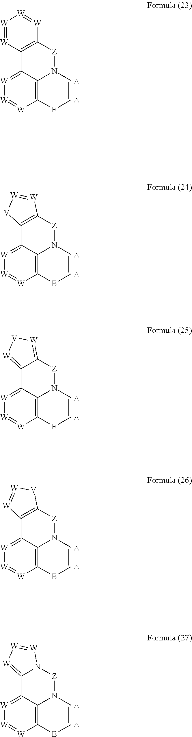 where º represents the linkage to the nitrogen atom in the group of the formula (2), # represents the linkage to the E group in the group of the formula (2), and the further symbols used are as defined above. In this case, it is preferable that the two X groups in the cycle to which the group of the formula (2) is bonded are CR or N, especially CR.