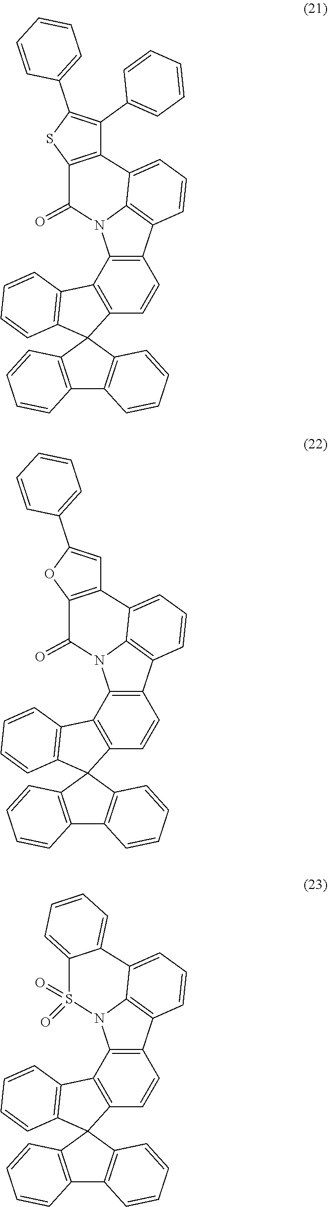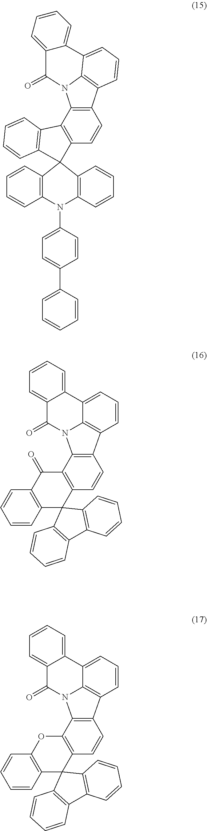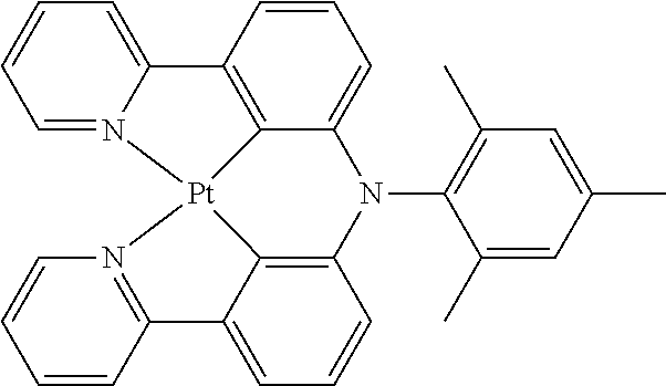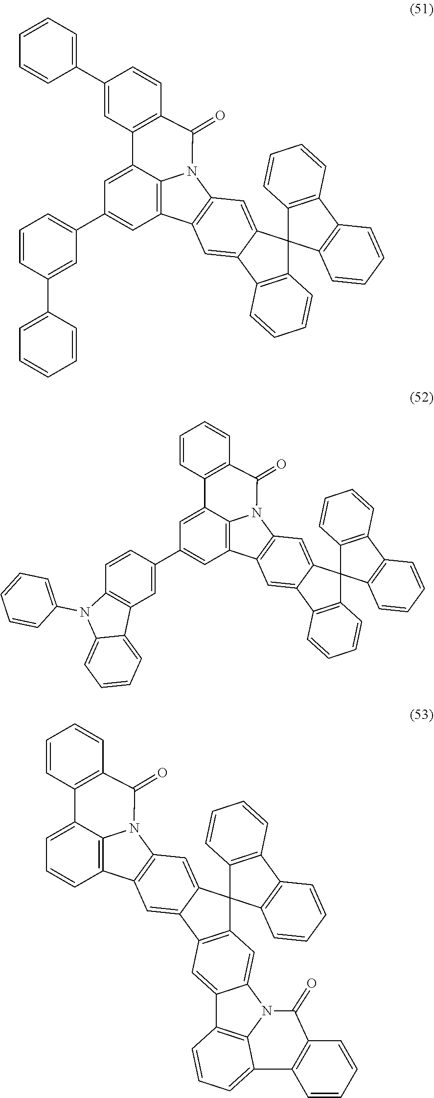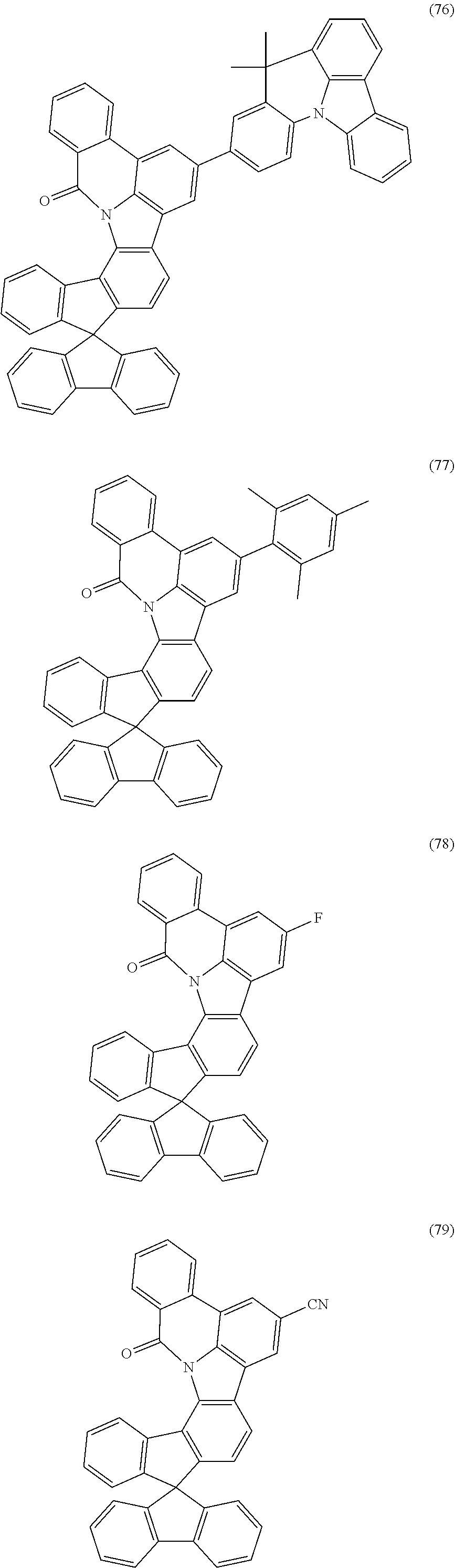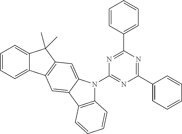 Structure of the OLEDs HTL IL EBL EML HBL ETL EIL Ex. thickness thickness thickness thickness thickness thickness thickness C1 SpA1 HATCN SpMA1 SdT1:TEG1 — ST2:LiQ — 70 nm 5 nm 90 nm (90%:10%) 40 nm (50%:50%) 30 nm C2 SpA1 HATCN SpMA1 SdT2:TEG1 — ST2:LiQ — 70 nm 5 nm 90 nm (90%:10%) 40 nm (50%:50%) 30 nm I1 SpA1 HATCN SpMA1 5d:TEG1 — ST2:LiQ — 70 nm 5 nm 90 nm (90%:10%) 40 nm (50%:50%) 30 nm I2 SpA1 HATCN SpMA1 5a:TER1 — ST2:LiQ — 90 nm 5 nm 130 nm (92%:8%) 40 nm (50%:50%) 40 nm I3 SpA1 HATCN SpMA1 5b:TER1 — ST2:LiQ — 90 nm 5 nm 130 nm (92%:8%) 40 nm (50%:50%) 40 nm I4 SpA1 HATCN SpMA1 IC1:TEG1 — 5c:ST2 LiQ 70 nm 5 nm 90 nm (90%:10%) 30 nm (50%:50%) 40 nm 3 nm I5 SpA1 HATCN SpMA1 5e:IC2:TEG1 — ST2:LiQ — 70 nm 5 nm 90 nm (45%:45%:10%) 40 nm (50%:50%) 30 nm I6 SpA1 HATCN SpMA1 5f:TEG1 — ST2:LiQ — 70 nm 5 nm 90 nm (90%:10%) 40 nm (50%:50%) 30 nm I7 SpA1 HATCN SpMA1 5d:TEG1 — ST2:LiQ — 70 nm 5 nm 90 nm (90%:10%) 40 nm (50%:50%) 30 nm I8 SpA1 HATCN SpMA1 IC1:TEG1 — 5h:ST1 LiQ 70 nm 5 nm 90 nm (90%:10%) 30 nm (50%:50%) 40 nm 3 nm I9 SpA1 HATCN SpMA1 IC1:TEG1 5i ST2:LiQ — 70 nm 5 nm 90 nm (90%:10%) 30 nm 10 nm (50%:50%) 30 nm I10 SpA1 HATCN SpMA1 IC1:TEG1 — 7c:ST2 LiQ 70 nm 5 nm 90 nm (90%:10%) 30 nm (50%:50%) 40 nm 3 nm I11 SpA1 HATCN SpMA1 7d:IC2:TEG1 — ST2:LiQ — 70 nm 5 nm 90 nm (45%:45%:10%) 40 nm (50%:50%) 30 nm C1 5.3 46 27 12.9% 0.33/0.62 C2 3.8 52 43 14.5% 0.33/0.62 I1 3.4 54 50 14.7% 0.34/0.63 I2 5.4 13 8 13.1% 0.66/0.34 I3 4.6 13 9 12.7% 0.67/0.33 I4 3.5 59 53 16.2% 0.34/0.63 I5 3.4 60 55 16.6% 0.33/0.62 I6 4.2 47 35 13.2% 0.37/0.60 I7 3.3 57 54 15.2% 0.33/0.63 I8 3.4 60 55 16.4% 0.34/0.63 I9 3.8 60 50 16.0% 0.33/0.63 I10 3.5 59 53 15.9% 0.34/0.62 I11 3.4 58 54 15.5% 0.34/0.63 HATCN SpA1 SpMA1 LiQ IC2 ST2 IC1 IC3 TEG1 TER1 SdT1 SdT2 5d 5a 5b 5c 5e 5f 5g 5h 5i 7c 7d