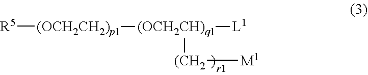 (wherein R8represents a hydrogen atom or a C1 to C12 linear-chain or branched-chain alkyl group; R9represents a C1 to C10 linear-chain or branched-chain saturated divalent hydrocarbon group optionally substituted with one hydroxyl group; R10represents a chemical bond or a C1 to C5 linear-chain or branched-chain divalent saturated hydrocarbon group optionally substituted with one [CH2CH(Q)O]s(wherein Q represents a hydrogen atom or a methyl group, and s is an integer of 1 to 20); L2represents a hydrogen atom, a hydroxyl group, a C1 to C10 linear-chain or branched-chain alkoxy group or a phenoxy group; M2represents a hydrogen atom or a hydroxyl group; each of p2and q2is an integer of 0 to 20; and r2is an integer of 0 to 10)