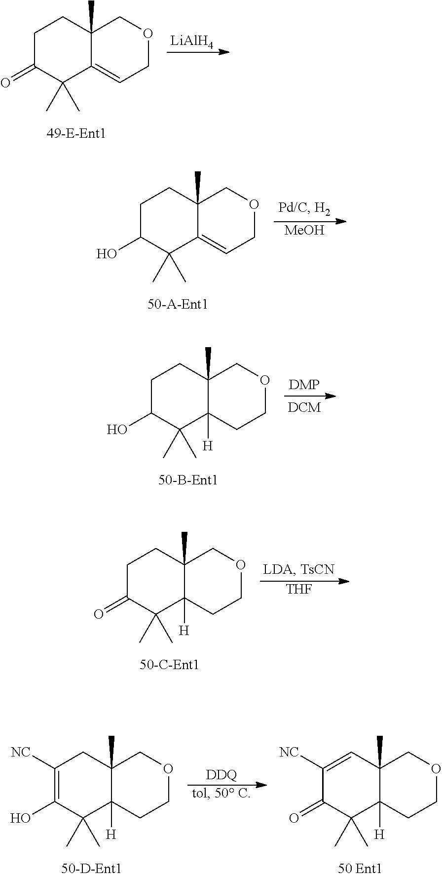 To a solution of compound 52-A Ent2 in 5 mL methanol was added 5.4 M of Sodium methoxide in methanol(0.29 mL, 1.6 mmol). After 3 h, the reaction was concentrated and partitioned between water and ethyl acetate. 1N HCl was used to adjust pH to 3. The organic phase was separated and washed with brine, dried over MgSO4, filtered and concentrated. LC/MS and NMR show incomplete conversion to product (˜90% conversion). The intermediate was carried on crude to the next step. LC/MS (M+H)=249. Preparation of Compound 52-Ent2 Compound 52-B Ent2 (120 mg, 0.48 mmol) in 10 mL benzene (insoluble) was treated with Dichlorodicyanoquinone (DDQ, 0.115 g, 0.507 mmol) and heated to reflux for 4 hours. The reaction was cooled to RT, filtered, and rinsed with benzene. The crude material was purified twice using silica gel chromatography using heptanes/acetone as the eluent to afford a product containing ˜7% of an impurity. Further purification by SFC afforded 98% pure 52-Ent2. 1H NMR (400 MHz, DMSO-d6) δ ppm 8.01 (s, 1H) 7.60 (br s, 1H) 3.40 (br s, 5H) 3.29 (dd, J=14.7, 4.9 Hz, 1H) 2.97 (dd, J=14.7, 7.7 Hz, 1H) 2.36-2.47 (m, 1H) 2.25 (br dd, J=13.9, 7.4 Hz, 1H) 2.03 (dd, J=11.8, 2.0 Hz, 1H) 1.69-1.83 (m, 1H) 1.41-1.60 (m, 1H) 1.15 (s, 3H) 1.06 (s, 3H) 0.97 (s, 3H). HPLC Purity: 98% LC/MS (M+H)=247. Preparation of Compound 52-Ent1 Compound 52-Ent1 was prepared in a manner analogous to that described above for 52-Ent2 using (S)-1-phenylethan-1-amine in place of (R)-1-phenylethan-1-amine. Compound 52-A Ent2 (100.00 mg, 402.71 umol) in 4 mL of anhydrous THF was treated with borane; tetrahydrofuran (1 M, 1.61 mL) overnight. The reaction was quenched by the slow addition of 1 mL of 1N HCL and allowed to stir for 3 h. The reaction was quenched with sat Na2CO3until pH of 12. Extracted with ethyl acetate and washed with brine. The reaction was dried over MgSO4, filtered, and concentrated. The product was purified by an acid/base extraction as follows: The crude material as partioned between 1N HCl and ethyl ether. The ethyl ether layer (“neutral organic) was discarded. The pH of the HCl layer was adjusted to 12 using 1N NaOH and then extracted with dichloromethane. The dichloromethane layer was dried over MgSO4, filtered, and concentrated to afford 53-A Ent2 (51.00 mg, 217.63 umol, 54.04% yield). Data for 53-A Ent2: 1H NMR (400 MHz, CHLOROFORM-d) δ ppm 8.03 (s, 1H) 3.23 (dd, J=11.4, 5.6 Hz, 1H) 2.81 (d, J=14.1 Hz, 1H) 2.65 (td, J=12.2, 4.5 Hz, 1H) 2.44-2.57 (m, 2H) 2.00 (d, J=14.8 Hz, 1H) 1.79-1.93 (m, 2H) 1.70 (br dd, J=13.2, 5.9 Hz, 1H) 1.35-1.55 (m, 3H) 1.33 (s, 3H) 1.23 (s, 3H) 0.83 (d, J=0.8 Hz, 3H). Preparation of Compound 53-B Ent2: Compound 53-A Ent2 (51.00 mg, 217.63 umol) in 3 mL of anhydrous DCM was treated with triethylamine (66.07 mg, 652.90 umol, 90.51 uL) and Acetyl chloride (25.63 mg, 326.45 umol, 23.30 uL). After 10 min, the reaction was quenched by addition of sat. NaHCO3solution and diluted with ethyl acetate. The layers were separated layers and the organic phase was washed with brine. The organic phase was dried over MgSO4, filtered, and concentrated to afford crude 53-B Ent2 (60.00 mg, 217.10 umol, 99% yield). LC/MS (M+H)=277. Preparation of Compound 53-C Ent2 To a solution of 53-B Ent2 (60.00 mg, 217.10 umol) in 3 mL of methanol was added sodium methoxide (375.29 mg, 1.74 mmol, 25% purity) The reaction was allowed to stir for 3 days and formed a single peak of the desired mass by LC/MS. The reaction was concentrated and partioned between ethyl acetate and water. The aqueous phase was adjusted to a pH of 3 using 1 N HCl and the organic phase was separated and washed with brine, dried over MgSO4, filtered, and concentrated to afford crude 53-C Ent2. LC/MS (M+H)=277. Preparation of Compound 53-Ent2 Compound 53-C Ent2 (80.00 mg, 289.47 umol) was dissolved in 6 mL of anhydrous benzene, treated with DDQ (72.28 mg, 318.41 umol), and heated to reflux for 4 h. The reaction was cooled to RT and filtered. The filtrate was concentrated and deposited on 400 mg of silica gel and purified twice using 30% acetone in heptane to afford a white solid, 42 mg of 53-Ent2. The compound is a single peak by TLC and HPLC analysis but appears to be a ˜4:1 mixture of atropisomers by1H-NMR. Data for 53-Ent2: 1H-NMR. (d6-DMSO): δ ppm 8.12 (s, 0.8H), 8.05 (s, 0.2H), 3.72 (d, J=14.8 Hz, 0.2H), 3.58 (series of m, 1.8H), 3.40-3.15 (series of m, 2H), 2.09 (m, 0.2H), 2.04 (s, 0.6H), 2.02 (s, 2.4H), 1.90-1.65 (series of m, 2H), 1.51 (m, 2H), 1.14 (s, 1.2H), 1.13 (s, 2.4H), 1.10 (s, 2.4H), 0.99 (m, 3H). LC/MS (M+H): 275. HPLC Purity: 99% To a solution of compound 39-C-Ent1 (300 mg, 1.36 mmol, 1.0 eq.), and TEA (274 mg, 2.72 mmol, 2 eq) in THF (10 mL) was added 1-bromo-2-(methylsulfonyl)ethane (507 mg, 2.72 mmol, 2 eq). The mixture was stirred at 70° C. for 16 hours. The mixture turned to a black-brown solution. LCMS showed the reaction was completed. Most of the starting material was almost consumed and the desired product was detected. The mixture was concentrated in vacuo to give compound 54-A (400 mg, crude), which was used in the next step without purification. LCMS: (M+H=327.1) Preparation of Compound 54-B: To a solution of compound 54-A (400 mg, 1.22 mmol, 1 eq) in MeOH (5 mL) was added a solution of NaOMe in MeOH (1.83 mL, 3.66 mmol, 3 eq, 2M). The mixture was stirred at 28° C. for 16 hours. The mixture turned to clear. TLC (PE:EA=5:1) showed the reaction worked. Most of the starting material was almost consumed and a new spot was detected. The mixture was diluted with water (25 mL) and extracted with EtOAc (25 mL×3). The combined organic phase was dried over Na2SO4, and filtered. The filtrate was concentrated in vacuo to give compound 54-B (300 mg, crude), which was used directly in the next step without purification.