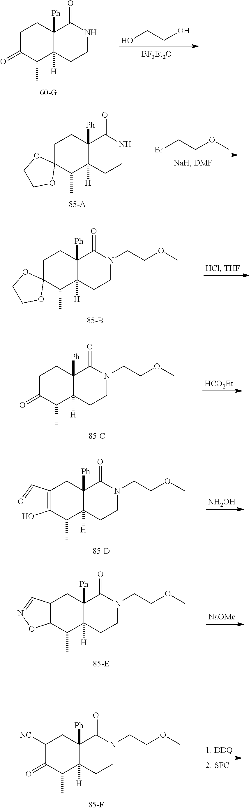 HPLC: (Purity: 100%) LCMS: (M+H: 309.2) SFC: (ee: 100%) 1HNMR (500 MHz, CDCl3)6ppm 8.52 (s, 1H), 7.39-7.33 (m, 3H), 7.13-7.10 (m, 2H), 3.69 (dd, J=12.21, 6.10 Hz, 1H), 3.58 (td, J=12.21, 6.71 Hz, 1H), 3.13 (s, 3H), 2.49 (dd, J=13.43, 2.44 Hz, 1H), 2.11 (tdd, J=13.43, 13.43, 11.60, 7.33 Hz, 1H), 1.84 (ddd, J=13.89, 6.56, 2.14 Hz, 1H), 1.21 (s, 3H), 0.60 (s, 3H). Data for 84-Ent-2 HPLC: (Purity: 99%) LCMS: (M+H: 309.2) SFC: (ee: 100%) 1HNMR (500 MHz, CDCl3)6ppm 8.52 (s, 1H), 7.39-7.33 (m, 3H), 7.13-7.10 (m, 2H), 3.69 (dd, J=12.21, 6.10 Hz, 1H), 3.58 (td, J=12.21, 6.71 Hz, 1H), 3.13 (s, 3H), 2.49 (dd, J=13.43, 2.44 Hz, 1H), 2.11 (tdd, J=13.43, 13.43, 11.60, 7.33 Hz, 1H), 1.84 (ddd, J=13.89, 6.56, 2.14 Hz, 1H), 1.21 (s, 3H), 0.60 (s, 3H). LCMS: (M+H: 302.1). 1H NMR: (400 MHz, CDCl3) δ 7.62 (d, J=7.50 Hz, 2H), 7.26-7.33 (m, 2H), 7.18-7.26 (m, 1H), 5.70 (br s, 1H), 3.95 (s, 2H), 3.74 (s, 2H), 3.17 (tt, J=4.38, 8.52 Hz, 1H), 2.88-3.02 (m, 1H), 2.48-2.64 (m, 1H), 2.24-2.32 (m, 1H), 2.11-2.17 (m, 3H), 1.91-2.02 (m, 1H), 1.61 (td, J=3.34, 13.62 Hz, 1H), 1.23-1.34 (m, 1H), 0.99 (d, J=6.62 Hz, 3H). Preparation of Compound 85-B To a solution of compound 85-A (700 mg, 2.33 mmol, 1.0 eq.) in DMF (10 mL) was added NaH (186 mg, 4.66 mmol, 2.0 eq.) at 0° C. and stirred at 15° C. for 0.5 hour. Then 1-bromo-2-methoxyethane (484 mg, 3.49 mmol, 1.5 eq.) was added. The mixture was stirred at 20° C. for 2 hours. LCMS showed that the starting material was consumed completely and the desired product was detected. The reaction mixture was diluted with EtOAc (50 mL). Then Sat. NaHCO3(50 mL) and extracted with EtOAc (50 mL×3). The combined organic layer was washed with brine (100 mL) and dried over anhydrous Na2SO4, filtered, concentrated under reduced pressure to give the residue, which was purified by column chromatography (PE/EtOAc=20:1 to 3:1) to give compound 85-B (850 mg, 88% yield) as a light yellow solid. LCMS: (M+H: 360.1). Preparation of Compound 85-C To a solution of compound 85-B (800 mg, 1.90 mmol, 1.0 eq.) in THF (anhydrous, 20 mL) was added HCl (9 mL, 9.04 mmol, 5 eq., 1 M in water). The solution was stirred at 20° C. for 12 hours. LCMS showed that the starting material was consumed completely and the desired product was detected. The mixture was added Sat. NH4HCO3(20 mL). The residue was extracted with EtOAc (20 mL×3). The combined organic layers were dried over Na2SO4, filtered and concentrated to give the crude compound 85-C, which was purified by column chromatography (PE/EtOAc=20:1 to 1:1) to give compound 85-C (310 mg, 44% yield) as a colorless oil. LCMS: (M+CH3CN: 346.1). 1H NMR: (400 MHz, CDCl3) δ 7.61 (d, J=7.02 Hz, 2H), 7.33-7.41 (m, 2H), 7.31 (d, J=7.02 Hz, 1H), 3.58-3.65 (m, 1H), 3.39-3.53 (m, 3H), 3.28-3.38 (m, 2H), 3.25 (s, 3H), 2.80-2.90 (m, 1H), 2.64-2.73 (m, 1H), 1.96-2.40 (m, 6H), 1.16 (d, J=6.58 Hz, 3H) Preparation of Compound 85-D Na (79 mg, 3.45 mmol, 3.5 eq.) was added to MeOH (3.5 mL) in many portions at 25° C. and stirring until Na was disappeared, and then a mixture of compound 85-C (310 mg, 0.98 mmol, 1.0 eq.) and HCOOEt (5 mL) were added to the above solution dropwise over 5 min under N2. The reaction mixture was stirred at 20° C. for 12 hours. LCMS showed that the starting material was consumed completely and the desired product was detected. The mixture was added Sat. NH4Cl (25 mL) and extracted with EtOAc (30 mL×3). The combined organic layer was washed with brine (30 mL×3), dried over anhydrous Na2SO4, filtered, concentrated under reduced pressure to supply compound 85-D (290 mg, 85% yield) as yellow oil. LCMS: 19437-100-1C (M+H: 344.1). Preparation of Compound 85-E To a solution of compound 85-D (290 mg, 0.84 mmol, 1.0 eq.) in EtOH (5 mL) and H2O (1 mL) was added hydrochloride hydroxylamine (64 mg, 0.93 mmol, 1.1 eq.). After addition the mixture was stirred at 50° C. for 16 h. LCMS showed that the starting material was consumed completely and the desired product was detected. The mixture was diluted with NaHCO3(20 mL), and extracted with EtOAc (30 mL×3). The combined organic layer dried over anhydrous Na2SO4, filtered, and concentrated under reduced pressure to give compound 85-E (200 mg, 69% yield) as a yellow gum. LCMS: (M+H: 341.1) 1H NMR: (400 MHz, CDCl3) δ 8.23 (s, 1H), 7.19-7.24 (m, 3H), 7.09-7.16 (m, 2H), 3.87-3.95 (m, 1H), 3.72-3.80 (m, 2H), 3.53-3.70 (m, 3H), 3.43 (s, 3H), 3.38-3.41 (m, 1H), 3.01 (dd, J=2.84, 16.88 Hz, 1H), 2.26 (br d, J=7.02 Hz, 1H), 1.84-1.96 (m, 2H), 1.32-1.37 (m, 3H). Preparation of Compound 85-E Na (68 mg, 2.94 mmol, 5 eq.) was added MeOH (1.5 mL) in many portions at 25° C. and stirring until Na was disappeared. Then compound 85-D (200 mg, 0.59 mmol, 1.0 eq.) was added. The reaction mixture was stirred at 20° C. for 16 hours. TLC (PE/EA=1:1) showed the starting materials were consumed completely and a new spot was observed. The mixture quenched by Sat. NH4Cl (15 mL) and extracted with EtOAc (15 mL×3). The combined organic layer was washed with brine (20 mL×2), dried over anhydrous Na2SO4, filtered, concentrated under reduced pressure to supply compound 85-E (220 mg, crude) as yellow gum. LCMS: (M+H: 341.1). Preparation of Compounds 85-Ent and 85-Ent2 To a solution of compound 85-E (200 mg, 0.59 mmol, 1.0 eq.) in Tol. (3 mL) was added DDQ (170 mg, 0.71 mmol, 1.2 eq.) slowly. The mixture was stirred at 80° C. for 2 hours. LCMS showed that the starting material was consumed completely and the desired product was detected. The mixture was diluted with water (30 mL), and extracted with EtOAc (30 mL×3). The combined organic layers was dried over anhydrous Na2SO4, filtered, and concentrated under reduced pressure. The residue was purified by prep-HPLC (Column: Xtimate C18 150*25 mm*5 um; water (10 mM NH4HCO3)-ACN, FlowRate: 25 mL/min) to give the racemate product (89 mg) as a colorless oil. The racemate was further separated by prep-SFC (Column: AD (250 mm*30 mm; 10 um); Condition: Neu-EtOH; FlowRate: 60 mL/min) to give the e