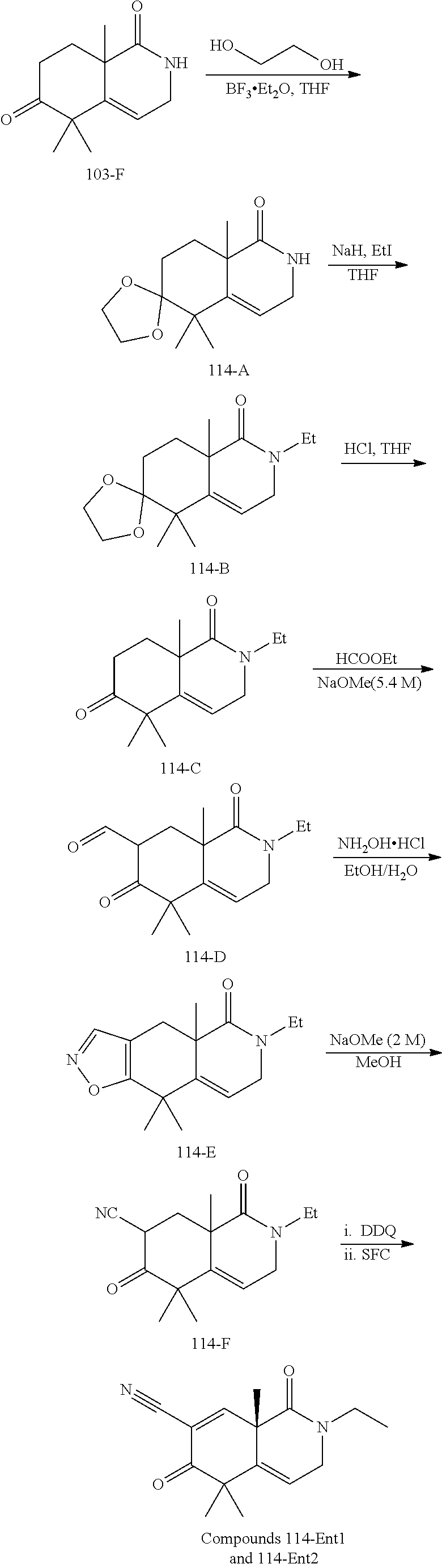 HPLC: (Purity: 97.5%) LCMS: (M+H: 233.1) SFC: (ee: 99.5%) 1HNMR (400 MHz, CDCl3) δ ppm 7.37 (s, 1H), 5.71 (s, 1H), 3.30 (d, J=12.3 Hz, 1H), 3.13 (dd, J=11.3, 4.5 Hz, 1H), 2.56 (dd, J=18.1, 5.8 Hz, 1H), 2.42-2.51 (m, 1H), 2.30 (dd, J=13.1, 5.3 Hz, 1H), 1.42 (d, J=0.8 Hz, 3H), 1.24 (s, 3H), 1.14 (s, 3H). Data for 163-Ent2 HPLC: (Purity: 97.3%) LCMS: (M+H: 233.1) SFC: (ee: 96.9%) 1HNMR (400 MHz, CDCl3) δ ppm 7.37 (s, 1H), 5.72 (s, 1H), 3.30 (d, J=11.0 Hz, 1H), 3.13 (dd, J=11.3, 4.5 Hz, 1H), 2.56 (dd, J=17.8, 5.5 Hz, 1H), 2.42-2.50 (m, 1H), 2.30 (dd, J=12.8, 5.5 Hz, 1H), 1.42 (s, 3H), 1.24 (s, 3H), 1.14 (s, 3H). LCMS: (M+H: 249.1) Procedure for Preparation of Compounds 164-Ent and 164-Ent2 Compound 164-A (83 mg, 334 umol) was dissolved in toluene (3.3 mL) and DDQ (99 mg, 434 umol) was added. The mixture was heated to reflux for 60 minutes then cooled to room temperature. The reaction was filtered and concentrated and the residue was then purified by column chromatography (50-100% EtOAc/Heptane, 12 g column). The red residue obtained was then diluted with sat. sodium bicarbonate and extracted with DCM (3×). The organic layers were dried, filtered, and concentrated to provide the product as an oil which was then purified by chiral SFC (Preparative method: Column: ChromegaChiral CCS 20×250 mm, Method: 20% methanol/isopropanol [1:1] in CO2[flow rate: 80 g/min], ABPR 120 bar; Analytical method: Column: Chiralpak AS-H 4.6×100 mm, Method: 10% methanol:isopropanol [1:1] in CO2[flow rate: 4 mL/min], ABPR 125 bar) to provide 164-Ent1 (6.2 mg, Rt=2.84 min) and 164-Ent2 (5.8 mg, Rt=2.46 min) as white solids.