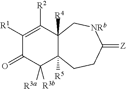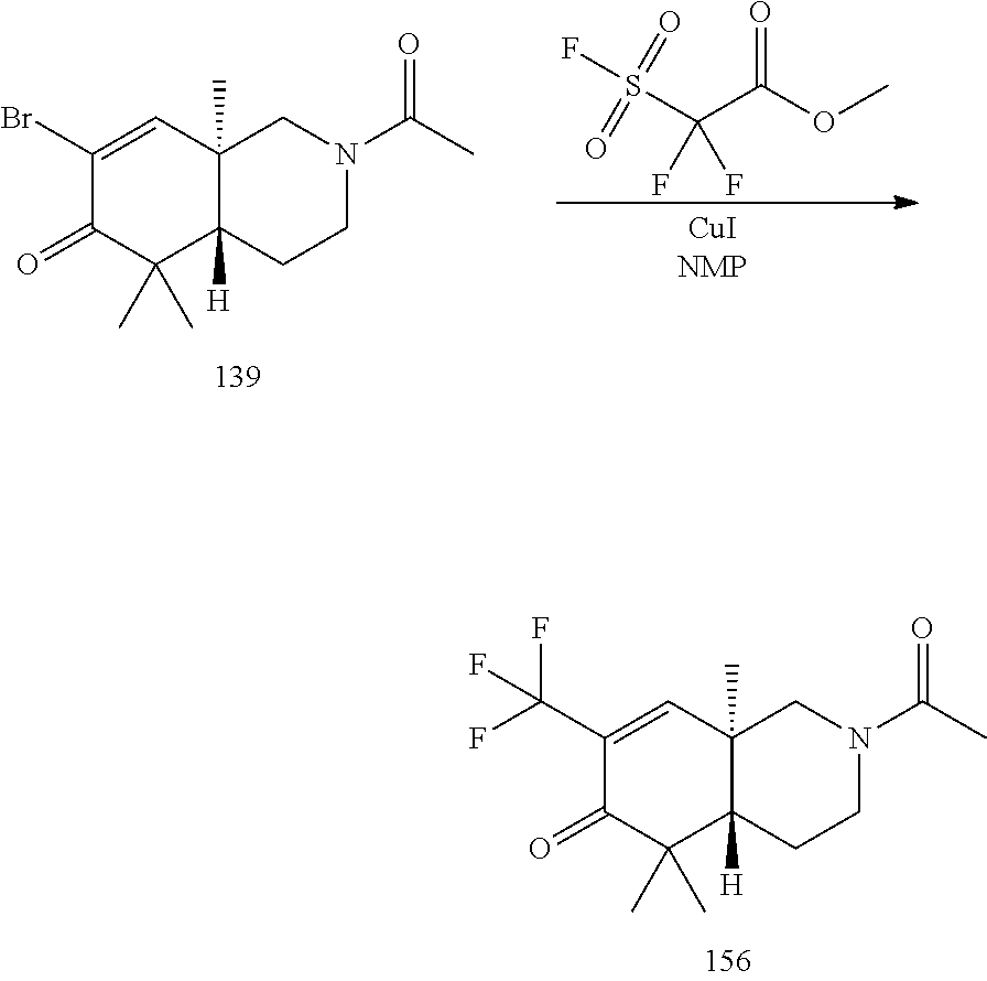 HPLC purity: >99% LCMS: (M+H) 247.1 ee: unknown 1H NMR (500 MHz, DMSO-d6) δ ppm 0.96-1.02 (m, 3H) 1.18 (s, 3H) 1.39-1.52 (m, 1H) 1.54-1.60 (m, 3H) 1.76-1.96 (m, 3H) 2.12-2.21 (m, 1H) 2.31 (br s, 1H) 2.57 (ddd, J=15.11, 12.97, 1.83 Hz, 1H) 7.74 (s, 1H) 7.80 (s, 1H). 1H NMR (500 MHz, CHLOROFORM-d) δ ppm 0.95 (s, 3H) 1.05 (s, 3H) 1.37 (s, 3H) 1.52 (dt, J=13.73, 4.12 Hz, 1H) 1.66-1.85 (m, 5H) 1.87-2.06 (m, 2H) 2.21-2.29 (m, 1H) 2.47-2.66 (m, 2H) 2.82 (s, 3H) 3.80-4.04 (m, 4H). Preparation of 167-B Compound 167-A (225.00 mg, 799.60 umol) was dissolved in 4 mL THF and treated with 2 mL of 1N HCL and allowed to stir overnight. The reaction was diluted with 20 mL brine and 60 mL EtOAc and the layers were separated. The aqueous layer was extracted with 20 mL EtOAc. The combined organic phases were washed with sat. NaHCO3and brine, dried over MgSO4, filtered, and concentrated to afford a white crystalline solid called 167-B (190.00 mg, 800.54 umol, 100.12% yield). 1H NMR (500 MHz, CHLOROFORM-d) δ ppm 2.92 (s, 3H) 2.69-2.78 (m, 1H) 2.58-2.65 (m, 1H) 2.47-2.57 (m, 1H) 2.33-2.44 (m, 1H) 2.08-2.28 (m, 3H) 1.73-1.94 (m, 4H) 1.54 (s, 3H) 1.19 (s, 3H) 1.14 (s, 3H). Preparation of 167-C: Compound 167-B (180.00 mg, 758.41 umol) and ethyl formate (1.12 g, 15.17 mmol, 1.22 mL) were combined and treated with sodium methoxide (4.3 M, 705.49 uL) and allowed to stir overnight. The reaction was quenched by the addition of 3.2 mL of 1N HCl and extracted with ethyl acetate. The organic phase was washed with brine, dried over MgSO4, filtered, and concentrated to afford a yellow oil. The yellow oil (200.00 mg, 753.72 umol) was dissolved in 4 mL ethanol and 1 mL water. To this solution was added hydroxylamine hydrochloride (157.13 mg, 2.26 mmol, 94.09 uL) and stirred overnight. The reaction was concentrated to remove ethanol and then diluted with ethyl acetate. The organic phase was washed with sat NaHCO3and brine, then dried over MgSO4, filtered, and concentrated to afford 167-C as a white solid. LCMS (M+H)=263.1 Preparation of 167-D Compound 167-C (200.00 mg, 762.34 umol) was dissolved in 5 mL methanol and treated with sodium methoxide (4.3 M, 709.15 uL) and allowed to stir at RT. After 3 days, the reaction was quenched by addition of 3.5 mL of 1N HCl and concentrated to remove methanol. The organic phase was partitioned between ethyl acetate and brine. The layers were separated and the organic phase dried over MgSO4, filtered, and concentrated. The crude material (167-D) was carried onto the next step. LCMS (M+H)=263.1 Preparation of 167 Crude compound 167-D (140.00 mg, 533.64 umol) was dissolved in 6 mL of anhydrous benzene and treated with DDQ and heated to reflux for 1 h. The reaction was concentrated and purified by two silica gel columns using 35% acetone in heptane to afford 167 (58.00 mg, 222.79 umol, 41.75% yield, 100% purity). 1H NMR (500 MHz, DMSO-d6) δ ppm 0.97 (s, 3H) 1.17 (s, 3H) 1.31-1.47 (m, 1H) 1.71 (s, 3H) 1.82-2.00 (m, 3H) 2.13-2.23 (m, 1H) 2.42 (dd, J=15.57, 4.58 Hz, 1H) 2.78-2.97 (m, 4H) 8.17 (s, 1H). LCMS (M+H)=261.1 Ee: unknown HPLC Purity>99% Examples 126 to 132 are intentionally deleted. LCMS: ESI-MS (M+H)+: 314.1 1H NMR (500 MHz, CHLOROFORM-d) δ 7.74-7.81 (m, 1H), 4.89-4.95 (m, 0.36H), 4.70 (dd, J=1.83, 12.21 Hz, 0.52H), 4.06 (td, J=2.14, 13.43 Hz, 0.54H), 3.74 (dd, J=1.83, 12.82 Hz, 0.36H), 3.20 (d, J=3.66 Hz, 3H), 3.13-3.19 (m, 0.44H), 3.09-3.13 (m, 0.66H), 2.54 (d, J=12.21 Hz, 1H), 2.24 (s, 3H), 1.94 (br s, 1H), 1.64-1.82 (m, 2H), 1.25 (s, 4H), 1.20-1.22 (m, 2H), 1.14 (s, 3H) 1HNMR (500 MHz, CDCl3) δ ppm 7.36-7.28 (m, 3H), 7.27-7.20 (m, 2H), 4.87-4.80 (m, 1H, minor rotamer), 4.56 (dd, J=6.7, 8.5 Hz, 1H, major rotamer), 4.15-4.06 (m, 2H), 3.76 (td, J=7.4, 15.1 Hz, 1H, minor rotamer), 3.64-3.53 (m, 2H), 3.36 (ddd, J=5.5, 7.3, 15.3 Hz, 1H, minor rotamer), 3.31-3.20 (m, 1H), 3.00 (s, 3H, major rotamer), 2.92 (s, 3H, minor rotamer), 2.59-2.49 (m, 2H), 2.43-2.32 (m, 1H, minor rotamer), 1.34-1.15 (m, 3H, major rotamer), 0.89 (t, J=7.0 Hz, 3H, minor rotamer). Procedure for Preparation of Compound 150-B THF (30.62 mL) was added to an oven dried flask under nitrogen. The solution was heated to 60° C. and a solution of 150-A (6.55 g, 19.14 mmol) in THF (45.94 mL) was added simultaneously with a 2M solution of tert-butyl(chloro)magnesium (23.93 mL) in ethyl ether. The mixture was then stirred at 60° C. for 2 h then cooled to room temperature. The mixture was diluted with saturated ammonium chloride solution and extracted with EtOAc (3×). The combined organic layers were washed with brine, dried over sodium sulfate, filtered, and concentrated. The residue was purified by flash chromatography (5-50% EtOAc/heptane) to obtain 1.96 g (47% yield) of 150-B as a white solid which appeared as a mixture of tautomers by1H NMR. 1HNMR (500 MHz, CDCl3) δ ppm 7.31-7.18 (m, 5H), 3.74 (s, 1H, minor tautomer), 3.48-3.28 (m, 4H, major and minor tautomers), 3.02 (s, 3H, major tautomer), 2.99 (s, 3H, minor tautomer), 2.98-2.90 (m, 1H, major and minor tautomers), 2.78 (d, J=4.9 Hz, 1H, minor tautomer), 2.62-2.37 (m, 2H, major and minor tautomers). Procedure for Preparation of Compound 150-C To a solution of 150-B (1.96 g, 9.02 mmol) in acetonitrile (18.04 mL) was added triethylamine (2.50 mL, 18.04 mmol) and ethyl vinyl ketone (1.07 mL, 10.82 mmol). The mixture was heated to 75° C. overnight then concentrated. The residue was then dissolved in MeOH (45 mL) at room temperature under nitrogen and NaOMe (4.37 M, 2.48 mL) was added. The mixture was then stirred for 15 hours at which point a saturated, aqueous solution of ammonium chloride was added followed by EtOAc. The layers were separated and the aqueous layer was extracted with EtOAc (2×). The combined organic layers were dried over sodium sulfate, filtered, and concentrated. The residue was then purified by flash chromatography (5-60% EtOAc/Heptane) to provide 150-C as a red oil (750 mg, 29% yield). 1HNMR (500 MHz, CDCl3) δ ppm 7.26-7.22 (m, 3H), 7.10-7.03