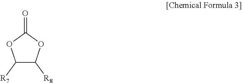 Comparative 0 0 34.0 Example 3 Comparative 1 0 26.1 Example 4 Comparative 0 LiFSI 1 30.6 Example 5 Comparative 1 LiFSI 0.05 26.2 Example 6 Comparative 1 LiFSI 5.5 37.0 Example 7 Comparative 0.05 LiFSI 1 31.1 Example 8 Comparative 5.5 LiFSI 1 39.6 Example 9 Reference 1.5 LiFSI 5 38.4 Example 1 Example 6 1 LiFSI 1 24.0 Example 7 1 LiFSI 2 20.5 Example 8 1 LiTFSI 1 24.6 Example 9 1 LiTFSI 2 21.4 DESCRIPTION OF SYMBOLS
