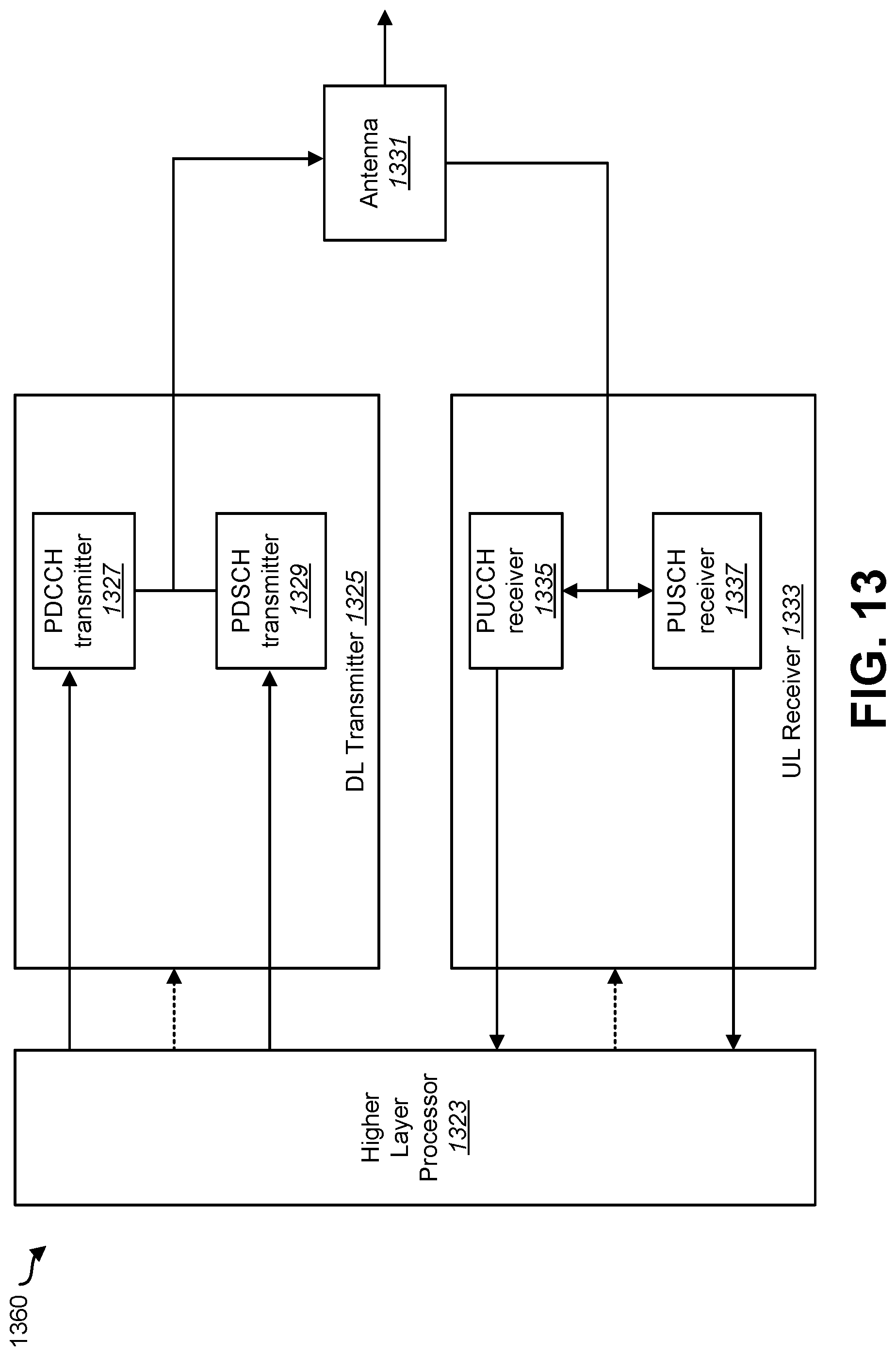 FIG. 13 is a block diagram illustrating one implementation of a gNB 1360. The gNB 1360 may include a higher layer processor 1323, a DL transmitter 1325, a UL receiver 1333, and antennas 1331. The DL transmitter 1325 may include a PDCCH transmitter 1327 and a PDSCH transmitter 1329. The UL receiver 1333 may include a PUCCH 1335 receiver and a PUSCH receiver 1337. The higher layer processor 1323 may manage physical layer's behaviors (the DL transmitter's and the UL receiver's behaviors) and provide higher layer parameters to the physical layer. The higher layer processor 1323 may obtain transport blocks from the physical layer. The higher layer processor 1323 may send/acquire higher layer messages such as an RRC message and MAC message to/from a UE's higher layer. The higher layer processor 1323 may provide the PDSCH transmitter 1329 transport blocks and provide the PDCCH transmitter 1327 transmission parameters related to the transport blocks. The UL receiver 1333 may receive multiplexed uplink physical channels and uplink physical signals via receiving antennas 1331 and de-multiplex them. The PUCCH receiver 1335 may provide the higher layer processor UCI. The PUSCH receiver 1337 may provide the higher layer processor received transport blocks.