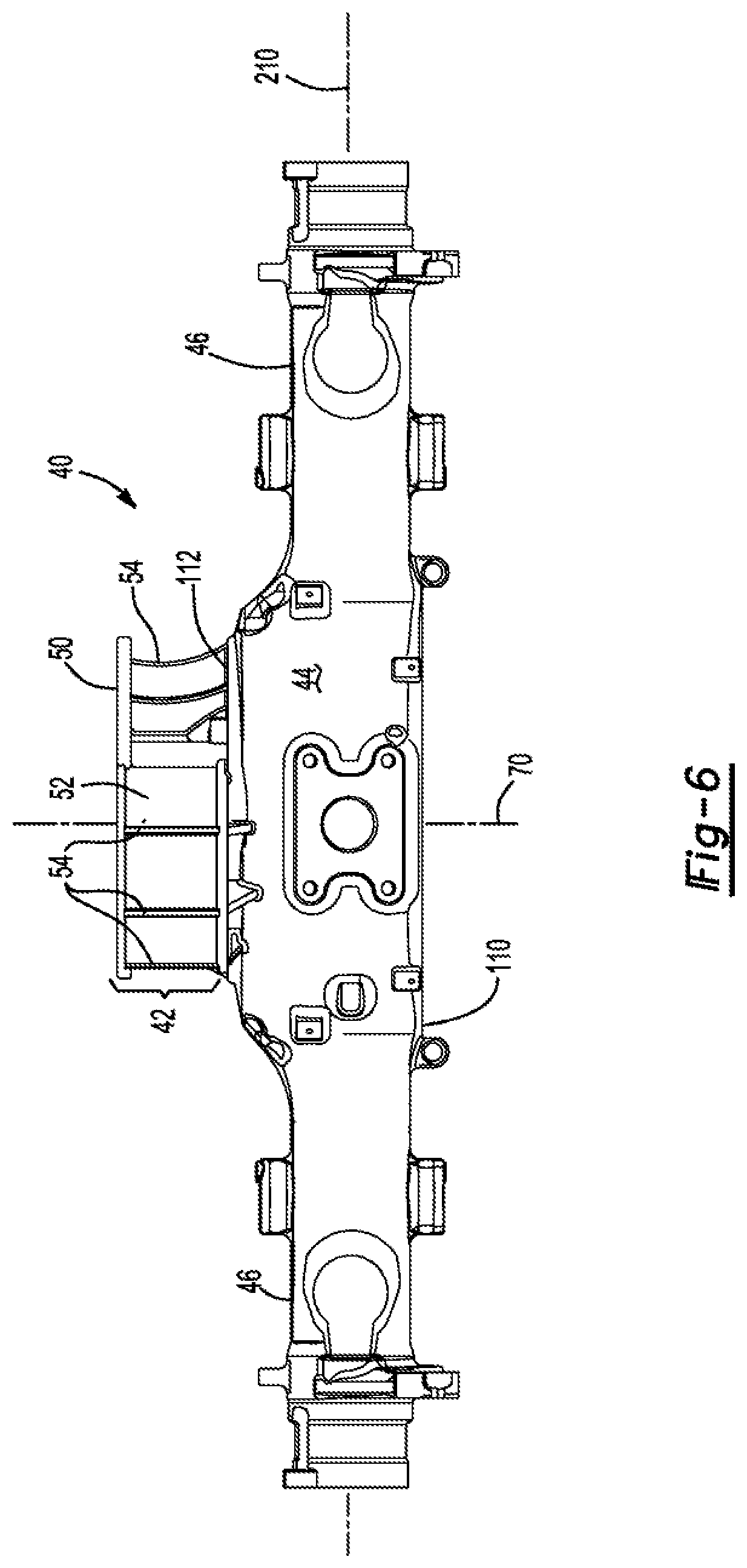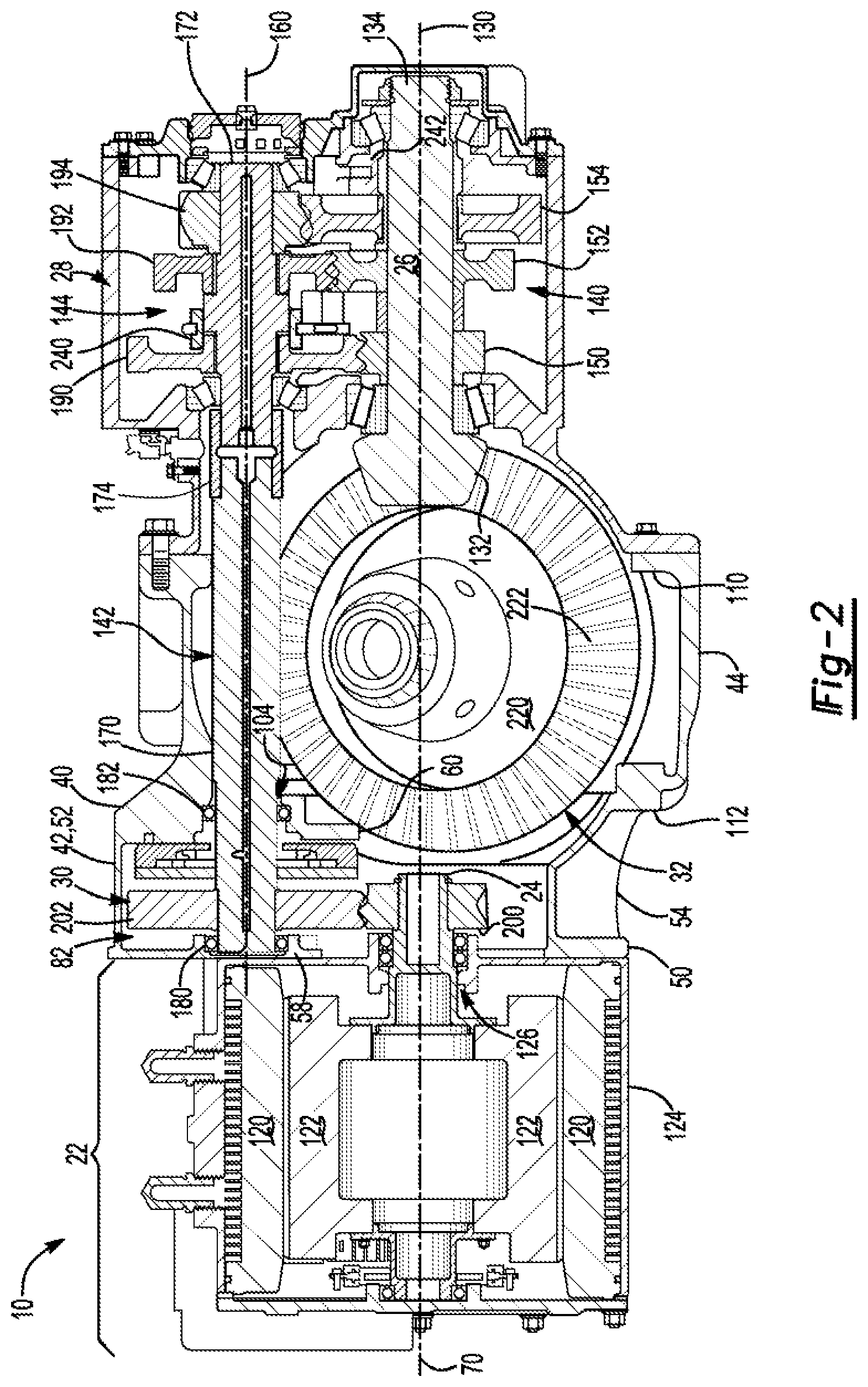 a drop gear housing portion that defines a first mounting flange; a center portion that extends from the drop gear housing portion and defines a second mounting flange; and an arm portion that extends from the center portion and is configured to receive an axle shaft; an electric motor module that is mounted to the first mounting flange; and a countershaft transmission module that is mounted to the second mounting flange. 2. The axle assembly of 3. The axle assembly of 4. The axle assembly of 5. The axle assembly of 6. The axle assembly of 7. The axle assembly of 8. The axle assembly of 9. The axle assembly of 10. An axle assembly comprising: