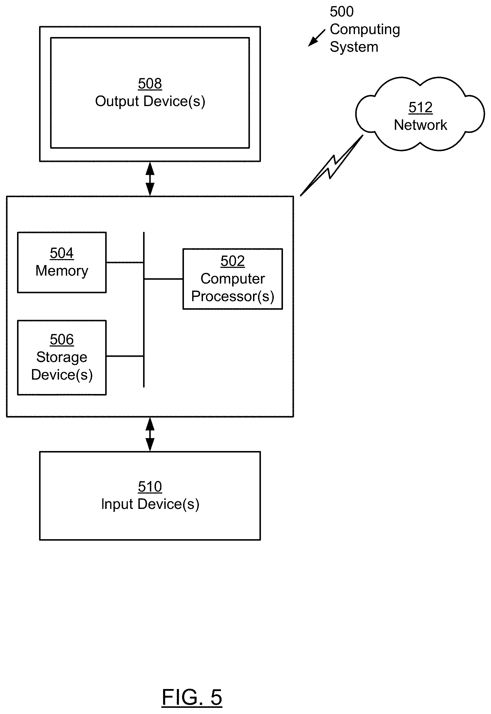 Embodiments of the invention may be implemented on virtually any type of computing system regardless of the platform being used. For example, the computing system may be one or more mobile devices (e.g., laptop computer, smart phone, personal digital assistant, tablet computer, or other mobile device), desktop computers, servers, blades in a server chassis, or any other type of computing device or devices that includes at least the minimum processing power, memory, and input and output device(s) to perform one or more embodiments of the invention. For example, as shown in FIG. 5, the computing system (500) may include one or more computer processor(s) (502), associated memory (504) (e.g., random access memory (RAM), cache memory, flash memory, etc.), one or more storage device(s) (506) (e.g., a hard disk, an optical drive such as a compact disk (CD) drive or digital versatile disk (DVD) drive, a flash memory stick, etc.), and numerous other elements and functionalities. The computer processor(s) (502) may be an integrated circuit for processing instructions. For example, the computer processor(s) may be one or more cores, or micro-cores of a processor. The computing system (500) may also include one or more input device(s) (510), such as a touchscreen, keyboard, mouse, microphone, touchpad, electronic pen, or any other type of input device. Further, the computing system (500) may include one or more output device(s) (508), such as a screen (e.g., a liquid crystal display (LCD), a plasma display, touchscreen, cathode ray tube (CRT) monitor, projector, or other display device), a printer, external storage, or any other output device. One or more of the output device(s) may be the same or different from the input device(s). The computing system (500) may be connected to a network (512) (e.g., a local area network (LAN), a wide area network (WAN) such as the Internet, mobile network, or any other type of network) via a network interface connection (not shown). The input and output device(s) may be locally or remotely (e.g., via the network (512)) connected to the computer processor(s) (502), memory (504), and storage device(s) (506). Many different types of computing systems exist, and the aforementioned input and output device(s) may take other forms.