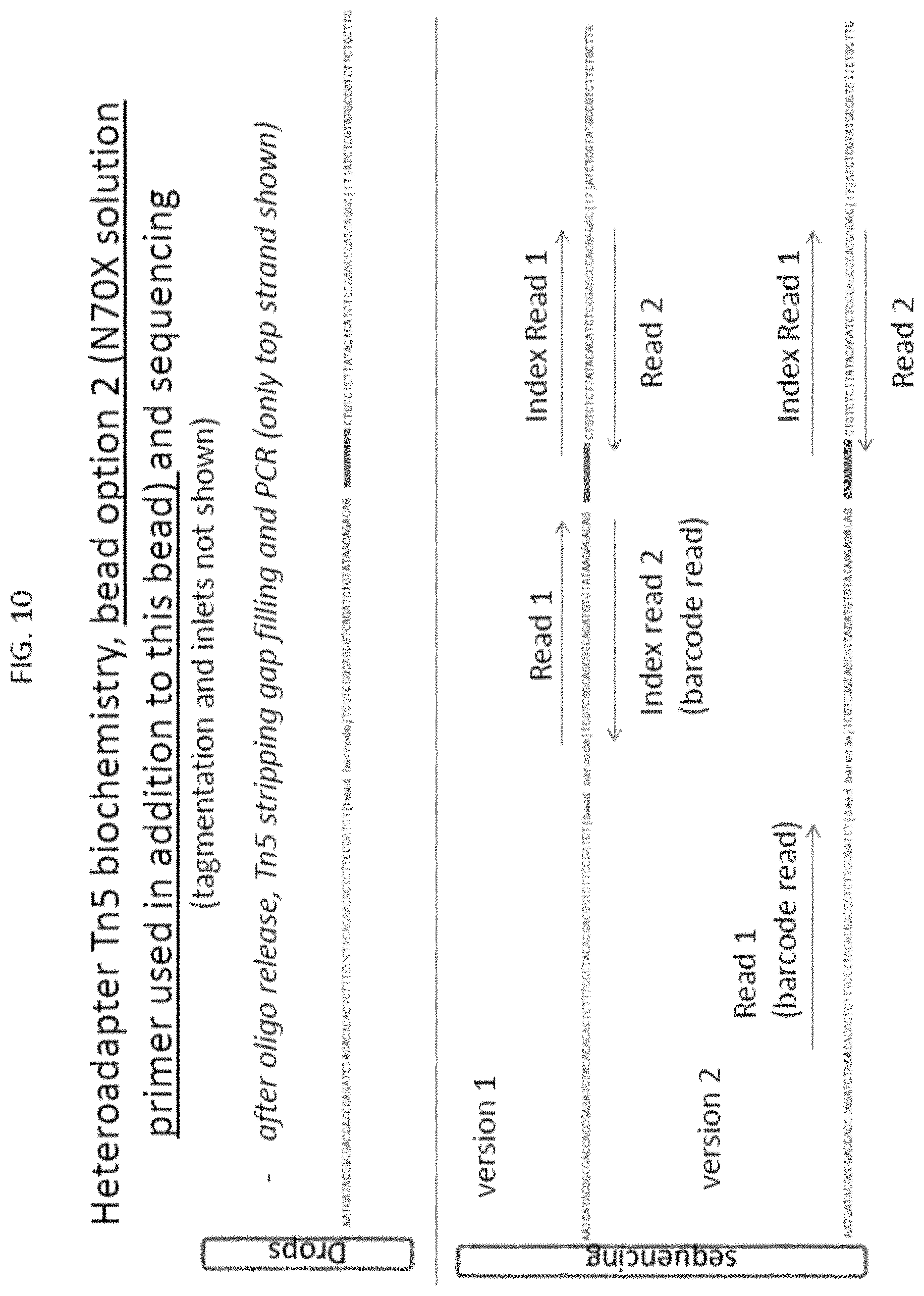 In some embodiments, the partitions comprise an amount of agent that displaces tagmentase from DNA but does not inhibit polymerization. In some embodiments, the partitions further comprise: tagmentase; and genomic DNA, wherein segments of the DNA have ends defined by adaptors inserted at breakpoints created by the tagmentase in the form first adaptor—DNA segment—second adaptor. In some embodiments, the agent is a detergent. In some embodiments, the detergent is sodium dodecyl sulfate (SDS). In some embodiments, the concentration of SDS is 0.005-0.05% (e.g., 0.01-0.04%, e.g., 0.01-0.02%). In some embodiments, the partitions are droplets in an emulsion. In some embodiments, the partitions comprise on average 0.02-3 (e.g., 0.05-1, 0.08-0.5, e.g., 0.1, 1, 2, or 3) beads. In some embodiments, the genomic DNA is from a single cell. In some embodiments, the genomic DNA is from a mammal or plant. In some embodiments, the first adaptor and the second adaptor have different sequences. In some embodiments, the first adaptor and the second adaptor are less than 50% identical. In some embodiments, the first adaptor and the second adaptor have identical sequences. In some embodiments, the first adaptor and the second adaptor are linked by a linking sequence in a form comprising first adaptor-DNA segment-second adaptor-(linker sequence)-first adaptor-DNA segment-second adaptor)n, where n is any integer 1 or greater. In some embodiments, the linking sequence comprises a restriction recognition sequence and optionally the partition further comprises a restriction enzyme the restriction recognition sequence. In some embodiments, the linking sequence comprises one or more uracils and optionally the partition further comprises a uracil-DNA N-glycosylase. In some embodiments, the linking sequence comprises one or more ribonucleotide. In some embodiments, n is an integer selected from 1-10,000. In some embodiments, the length of the first adaptor-DNA segment-second adaptor-(linker sequence-first adaptor-DNA segment-second adaptor)nis between 5 kb-10 Mb, e.g., 1 Mb-10 Mb. In some embodiments, the plurality comprises at least 10,000 different partitions. In some embodiments, the tagmentase is linked to a solid support. For example, in some embodiments the solid support is a bead that is different from the bead linked to the forward primer. Also provided is a plurality of partitions comprising DNA segments having contiguity maintained by tagmentase. In some embodiments, the partitions comprise linked DNA segments in the form of DNA segment-first adaptor-tagmentase-second adaptor-(DNA segment-first adaptor-tagmentase-second adaptor)n-DNA segment, where n is any integer and “-” indicates a covalent linkage and wherein the linked DNA maintains contiguity compared to genomic DNA. In some embodiments, the partitions are droplets in an emulsion. In some embodiments, the partitions comprise on average 0.02-3 (e.g., 0.05-1, 0.08-0.5, e.g., 0.1, 1, 2, or 3) beads. In some embodiments, the genomic DNA is from a single cell. In some embodiments, the genomic DNA is from a mammal or plant. In some embodiments, the first adaptor and the second adaptor have different sequences. In some embodiments, the first adaptor and the second adaptor are less than 50% identical. In some embodiments, the first adaptor and the second adaptor have identical sequences. In some embodiments, the linking sequence comprises a restriction recognition sequence and optionally the partition further comprises a restriction enzyme the restriction recognition sequence. In some embodiments, the linking sequence comprises one or more uracils and optionally the partition further comprises a uracil-DNA N-glycosylase. In some embodiments, the linking sequence comprises one or more ribonucleotide. In some embodiments, n is an integer selected from 1-10,000. In some embodiments, the length of the first adaptor-DNA segment-second adaptor-(linker sequence-first adaptor-DNA segment-second adaptor)n is between 5 kb-10 Mb, e.g., 1 Mb-10 Mb. In some embodiments, the plurality comprise at least 10,000 different partitions. Unless defined otherwise, all technical and scientific terms used herein generally have the same meaning as commonly understood by one of ordinary skill in the art to which this invention belongs. Generally, the nomenclature used herein and the laboratory procedures in cell culture, molecular genetics, organic chemistry, and nucleic acid chemistry and hybridization described below are those well-known and commonly employed in the art. Standard techniques are used for nucleic acid and peptide synthesis. The techniques and procedures are generally performed according to conventional methods in the art and various general references (see generally, Sambrook et al. MOLECULAR CLONING: A LABORATORY MANUAL, 2d ed. (1989) Cold Spring Harbor Laboratory Press, Cold Spring Harbor, N.Y., which is incorporated herein by reference), which are provided throughout this document. The nomenclature used herein and the laboratory procedures in analytical chemistry, and organic synthetic described below are those well-known and commonly employed in the art. The term “amplification reaction” refers to any in vitro means for multiplying the copies of a target sequence of nucleic acid in a linear or exponential manner. Such methods include but are not limited to polymerase chain reaction (PCR); DNA ligase chain reaction (see U.S. Pat. Nos. 4,683,195 and 4,683,202; PCR Protocols: A Guide to Methods and Applications (Innis et al., eds, 1990)) (LCR); QBeta RNA replicase and RNA transcription-based amplification reactions (e.g., amplification that involves T7, T3, or SP6 primed RNA polymerization), such as the transcription amplification system (TAS), nucleic acid sequence based amplification (NASBA), and self-sustained sequence replication (3 SR); isothermal amplification reactions (e.g., single-primer isothermal amplification (SPIA)); as well as others known to 