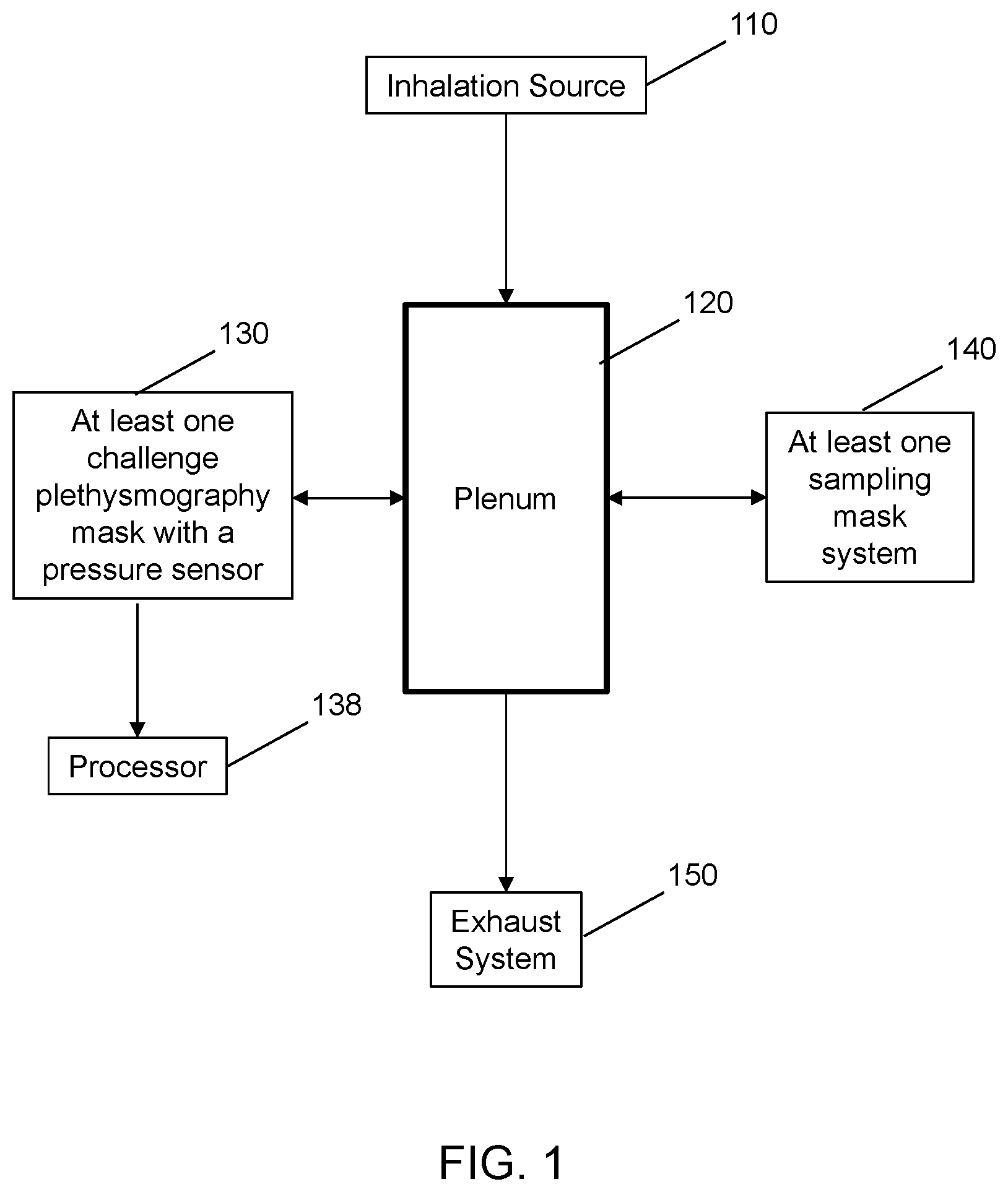 In at least one embodiment, a system includes an inhalation source; a plenum in fluid communication with the inhalation source; at least one challenge plethysmography mask in fluid communication with the plenum, for each challenge plethysmography mask including a mask having a cavity to receive at least a nose of a test animal, a delivery conduit in fluid communication with the plenum and the cavity of the mask, at least one exhaust conduit in fluid communication with the cavity of the mask and the plenum, and a pressure sensor attached to the mask to measure pressure within the cavity of the mask; at least one processor in electrical communication with the at least one pressure sensor, the processor configured to process an output signal of the pressure sensor into respiratory data for each test animal during an exposure study; and an exhaust system in fluid communication with the plenum.