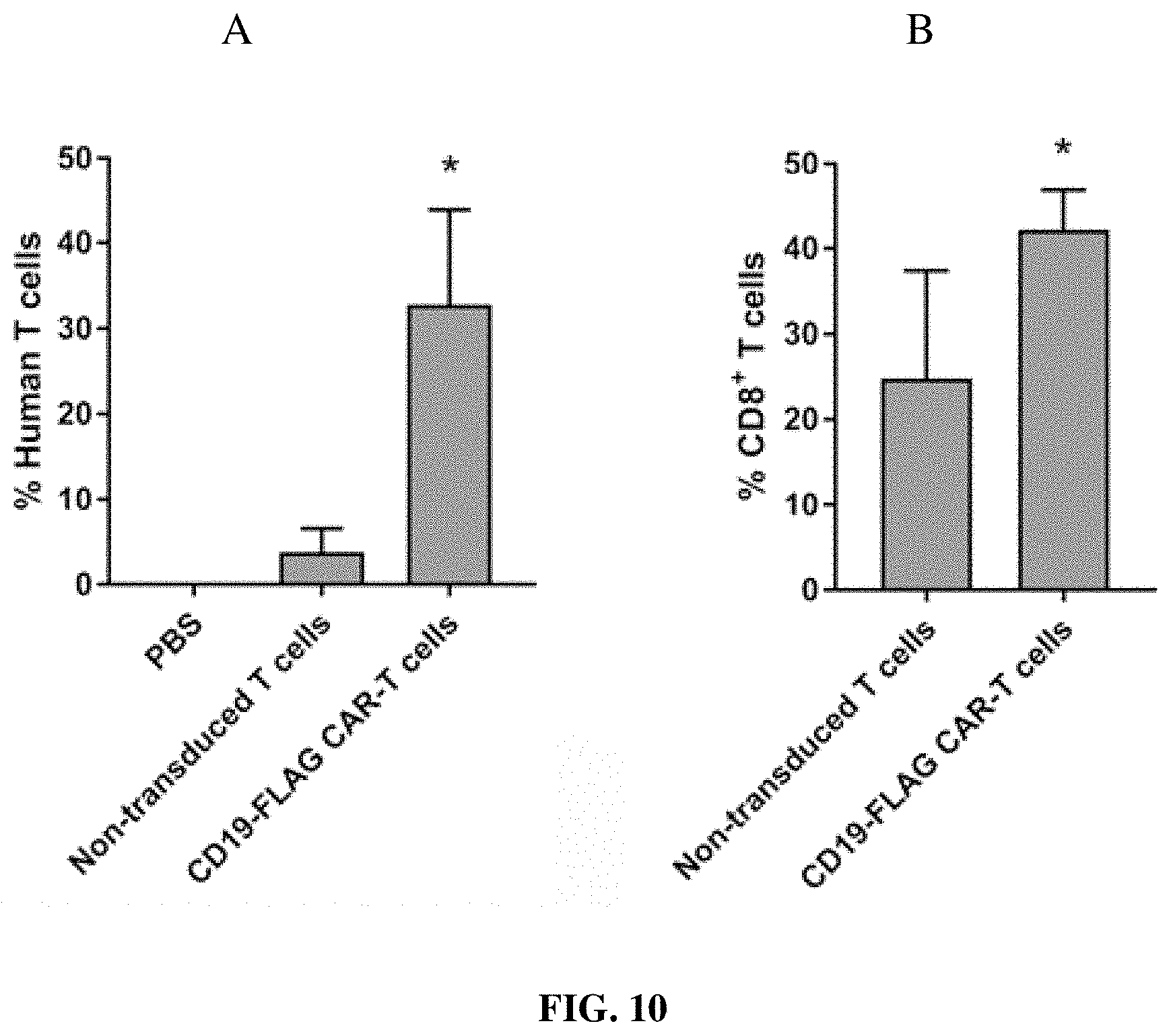 <Human GM-CSF Signal peptide> SEQ ID NO: 2 MLLLVTSLLLCELPHPAFLLIP FMC63 anti-CD19 scFv ScFv (VL-Linker-VH) <VL> SEQ ID NO: 3 D I Q Met T Q T T S S L S A S L G D R V T I S C R A S Q D I S K Y L N W Y Q Q K P D G T V K L L I Y H T S R L H S G V P S R F S G S G S G T D Y S L T I S N L E Q E D I A T Y F C Q Q G N T L P Y T F G G G T K L E I T <linker> SEQ ID NO: 4 G S T S G S G K P G S G E G S T K G <VH> SEQ ID NO: 5 E V K L Q E S G P G L V A P S Q S L S V T C T V S G V S L P D Y G V S W I R Q P P R K G L E W L G V I W G S E T T Y Y N S A L K S R L T I I K D N S K S Q V F L K Met N S L Q T D D T A I Y Y C A K H Y Y Y G G S Y A Met D Y W G Q G T S V T V S S In our contruct, we have 3 amino acids AAA after VH. <Flag tag> if present, after VH, SEQ ID NO: 5 DYKDDDDK <CD28 hinge> SEQ ID NO: 6 I E V M Y P P P Y L D N E K S N G T I I H V K G K H L C P S P L F P G P S K P <Transmembrane Domain TM28> SEQ ID NO: 7 F W V L V V V G G V L A C Y S L L V T V A F I I F W V <Co-stimulating domain CD28> SEQ ID NO: 8 R S K R S R L L H S D Y M N M T P R R P G P T R K H Y Q P Y A P P R D F A A Y R S <Activation domain CD3-zeta> SEQ ID NO: 9 R V K F S R S A D A P A Y Q Q G Q N Q L Y N E L N L G R R E E Y D V L D K R R G R D P E M G G K P R R K N P Q E G L Y N E L Q K D K M A E A Y S E I G M K G E R R R G K G H D G L Y Q G L S T A T K D T Y D A L H M Q A L P P R CD19-FLAG CAR sequence can be shown as SEQ ID NO: 10, FLAG is bold and underlined Met L L L V T S L L L C E L P H P A F L L I P D I Q Met T Q T T S S L S A S L G D R V T I S C R A S Q D I S K Y L N W Y Q Q K P D G T V K L L I Y H T S R L H S G V P S R F S G S G S G T D Y S L T I S N L E Q E D I A T Y F C Q Q G N T L P Y T F G G G T K L E I T G S T S G S G K P G S G E G S T K G E V K L Q E S G P G L V A P S Q S L S V T C T V S G V S L P D Y G V S W I R Q P P R K G L E W L G V I W G S E T T Y Y N S A L K S R L T I I K D N S K S Q V F L K Met N S L Q T D D T A I Y Y C A K H Y Y Y G G S Y A Met D Y W G Q G T S V T V S S A A A D YKDDDDK I E V Met Y P P P Y L D N E K S N G T I I H V K G K H L C P S P L F P G P S K P F W V L V V V G G V L A C Y S L L V T V A F I I F W V R S K R S R L L H S D Y Met N Met T P R R P G P T R K H Y Q P Y A P P R D F A A Y R S R V K F S R S A D A P A Y Q Q G Q N Q L Y N E L N L G R R E E Y D V L D K R R G R D P E Met G G K P R R K N P Q E G L Y N E L Q K D K Met A E A Y S E I G Met K G E R R R G K G H D G L Y Q G L S T A T K D T Y D A L H Met Q A L P P R Example 13