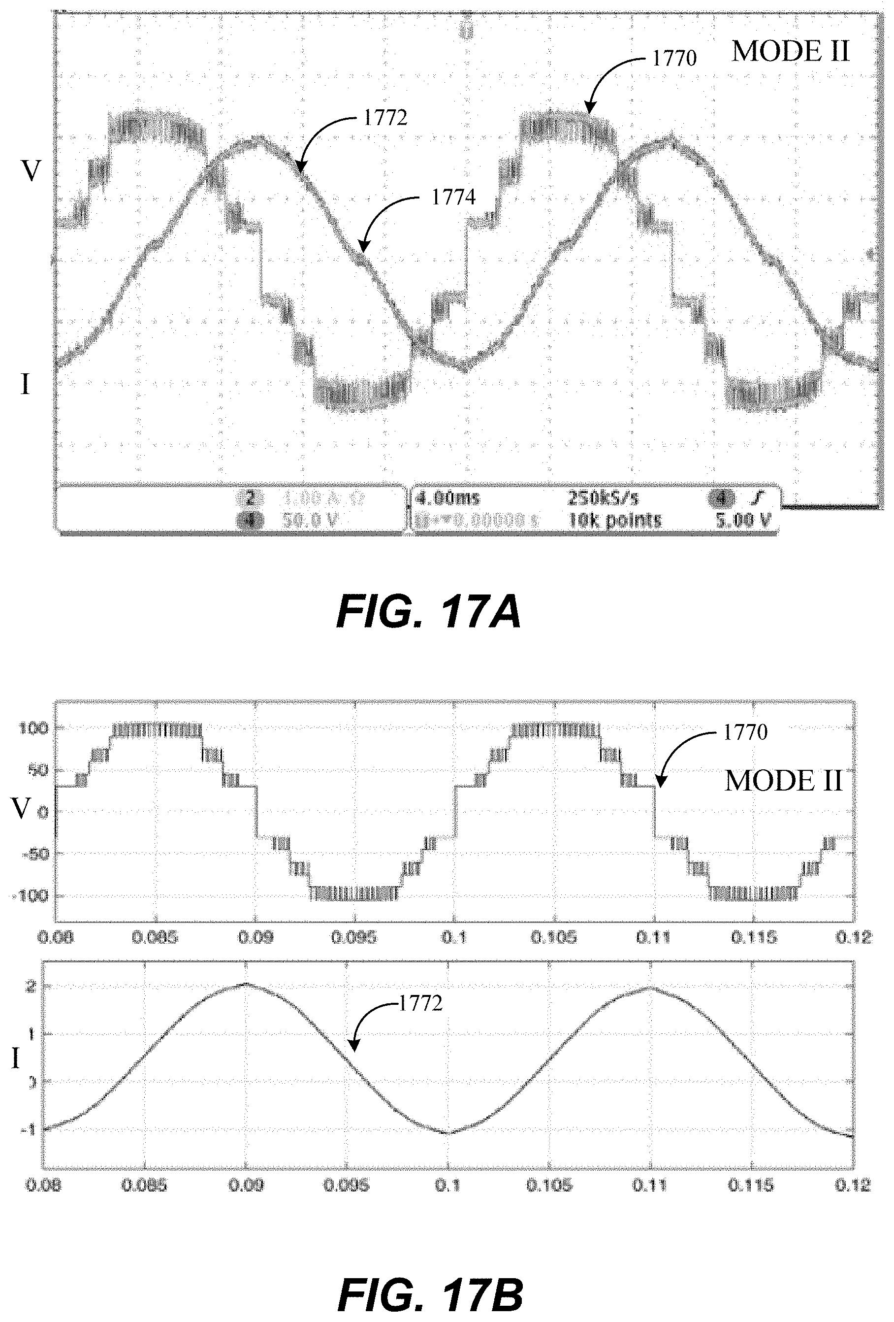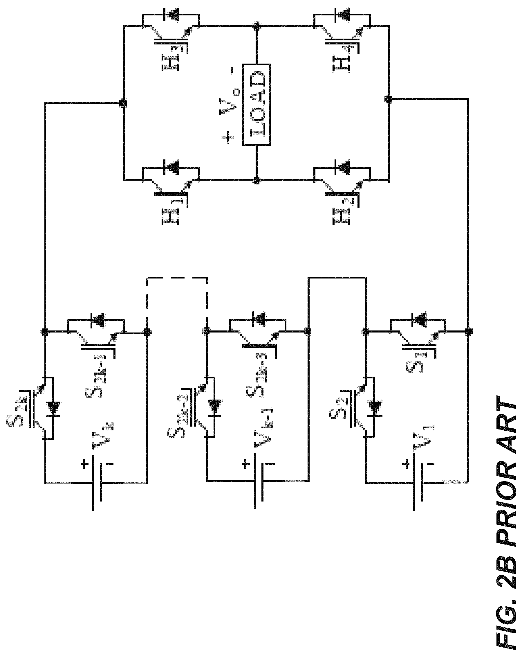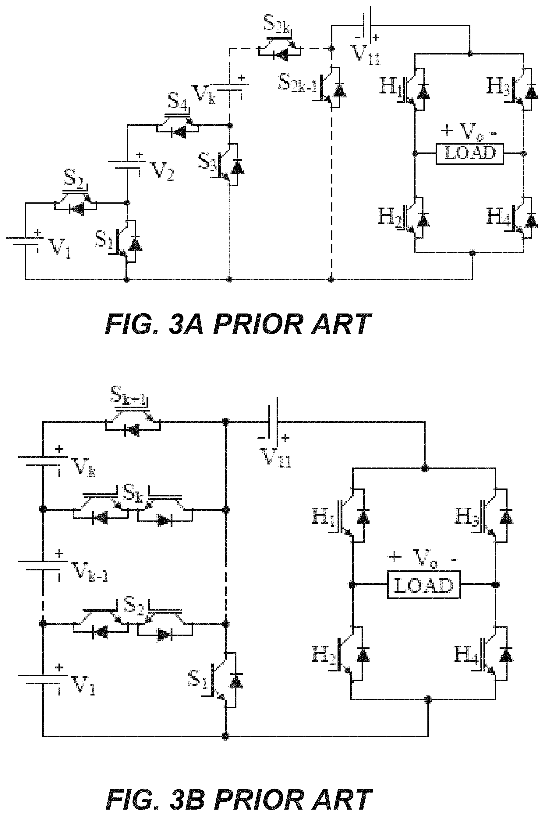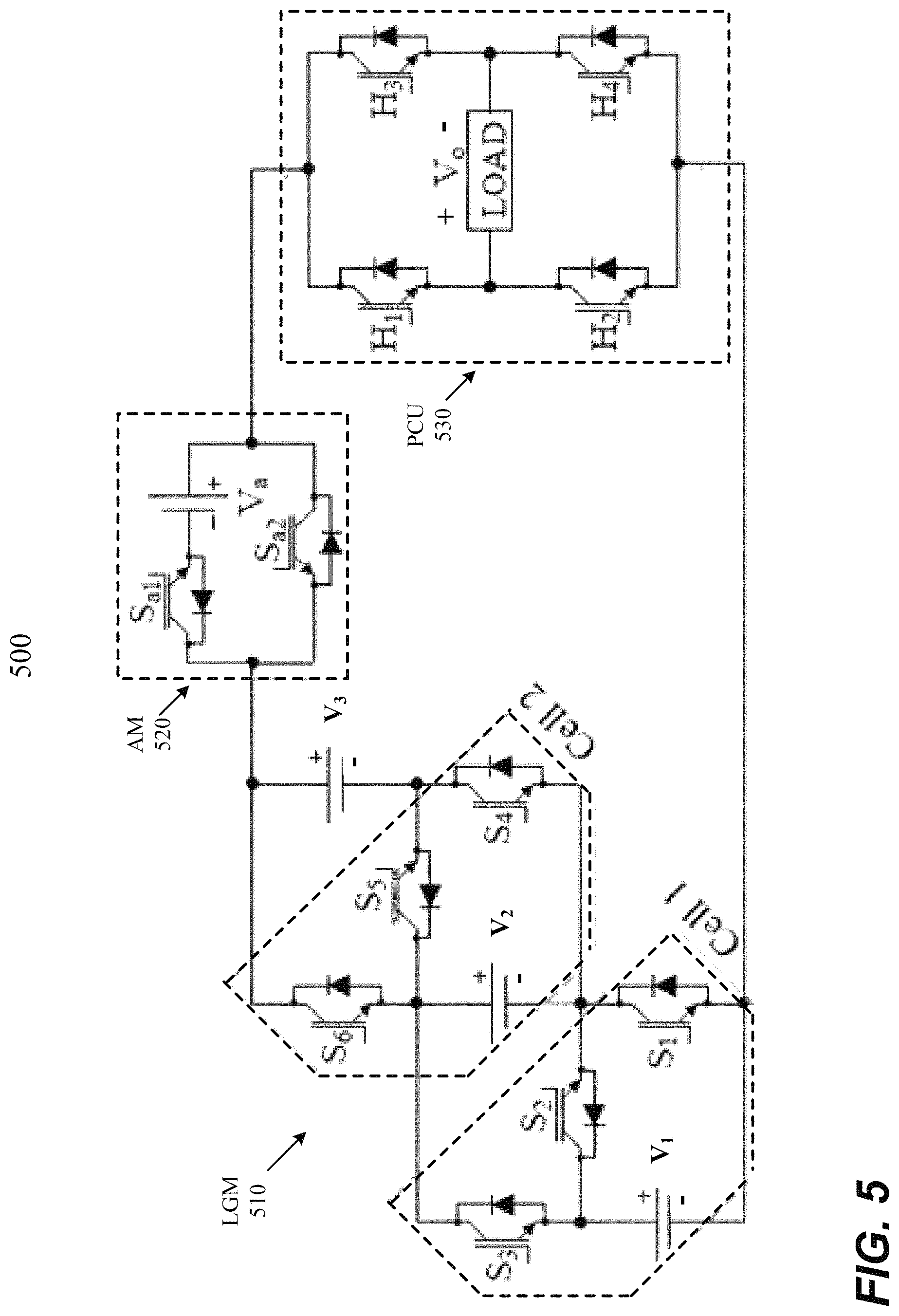 As shown in The LGM is built based on the interconnection of a k number of cells (k is an integer). Each cell comprises three unidirectional switches and one DC voltage source. For example, Cell 1 includes S1, S2, S3and voltage source Vdc1. The level function of the LGM is to generate the additive combinations of different DC sources of same magnitude; therefore, a staircase waveform is generated at its output P3. This is done by utilizing the switches such that the voltage sources of two cells can be connected in series or parallel. For example, if switches S1and S3are turned ON, the two DC voltage sources Vdc1and Vdc2will be connected in parallel at P1and the voltage at P1is Vdc. As Vdc1=Vdc2, both cells share the load equally. If switch S2is turned ON and switches S1and S3are turned OFF, the two DC voltage sources Vdc1and Vdc2will be connected in series with additive polarity and 2Vdc appears at P1. If switch S1is turned ON and switch S3is turned OFF or if switch S1is OFF and switch S3is ON, and S2is OFF, then there is no circuit connection and the voltage at the output of the cell is zero. Similarly, several DC voltage sources can be operated in series and parallel combinations to share the load with different voltage levels. The pair of switches (S1, S2) and (S2, S3) should be operated in a complementary mode to avoid short-circuiting voltage source Vdc1. In other words, S2should be OFF when either S1or S3is ON and vice versa. A similar operation is required for the kthcell. Moreover, all switches in the LGM operate at low frequency. However, it has to be noted that the LGM cannot produce a zero level at the output because the parallel/series combination of the DC sources will always result in a certain voltage at the output (as the voltage sources cannot be set to zero and the switches themselves have small internal voltages). Since there is no instant when the output is not connected to the source, a zero level cannot exist at the output P3at any time. This module can generate all the additive combinations of the different voltage sources with their individual voltage source magnitudes. Moreover, all modules can be operated in parallel to share the load. To generate a higher number of levels at the output P4, an auxiliary module 420 (AM) is connected after the LGM 410. This module comprises one DC voltage source Vaand two unidirectional switches Sa1and Sa2. Both switches must be operated in a complementary mode to avoid short-circuiting voltage source Va. When Sa2is turned ON (and Sa1is OFF), the voltage level generated by the LGM at P3is connected at the output P4. When Sa1is turned ON (and Sa2is OFF), the voltage source Vaadds to the level generated by the LGM at P3. If the magnitude of Vais selected to be half of the DC sources, an intermediate level is formed halfway in between two levels. On the other hand, if Vaequals the DC sources, no additional level is formed. Other values of Varesult in an unequal intermediate step, which is not desirable. The AM is also used to construct the PWM waveform. Switches Sa1and Sa2are modulated similar to the conventional (two-level) inverter. Furthermore, both switches operate at a higher switching frequency as the transition for both switches occurs for each level at the output, except for the zero voltage level. The combination of the LGM and AM generates the voltage levels in positive polarity only. To achieve both positive and negative voltage levels at the output, a standard H-bridge is used as a polarity changing unit. The H-bridge includes switches H1, H2, H3, H4and a center connection for the load. Another function of the PCU is to generate a zero voltage level at the output. This is achieved by simultaneously holding the H2and H4ON for a certain amount of time. The operating principle of the proposed multilevel inverter is explained with two cells (k=2) in the LGM as shown in The number of levels at the output is decided by the magnitude of DC voltage sources connected in the LGM 510 and AMV 530. For the parallel operation of the multilevel inverter, the magnitude of DC sources connected in LGM must be the same. If the magnitude is not equal, the anti-parallel diode connected to an IGBT will conduct, which leads to the short-circuiting of the voltage sources. The multilevel inverter can operate in two modes. The magnitude of voltage source Vaof the AM 520 determines these modes. Mode I may be viewed as a symmetrical configuration. In this mode, the magnitude of each DC source, including the DC source in the AM, is selected as Vd. Therefore,