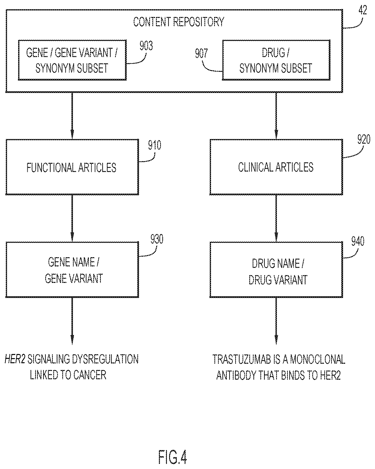 pre-process documents to render document sections visible to machine readers; generating document subsets from the documents based on user-defined terms; classify documents within the content repository or documents within the document subsets into one or more categories, based upon a number of times classification terms appear in a specific section of the document or based on an article type tag, wherein classifying documents based on the number of times classification terms appear in the specific section of the document comprises applying predefined weighting values to the number of times classification terms appear in the specific section, wherein the predefined weighting values are selected based on a specific number equal to a sum of unique classification terms in the specific section compared to a matching threshold value of a plurality of matching threshold values, wherein each matching threshold value is associated with a specific section of the document; rank documents based upon the frequency of classification terms in the specified section; and associate documents with specific diseases, genes, gene variants, and drugs or synonyms thereof by comparing relevant search terms to specific sections of the documents. 16. The computer program product of 17. The computer program product of 18. The computer program product of 19. The computer program product of 20. The computer program product of