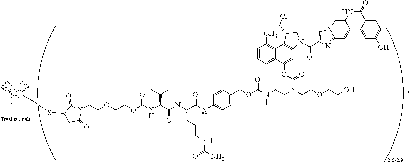 histidine, trehalose, and polysorbate wherein the molar ratio of trehalose to ADC is 1,500-1,700 to 1, and, when reconstituted with water, the ADC of formula (II) is present in an amount of 5-15 mg/ml, the histidine concentration is 3.0-10 mM, the amount of polysorbate is 0.005-0.02% (m/v), and the pH is 5.5-5.8.