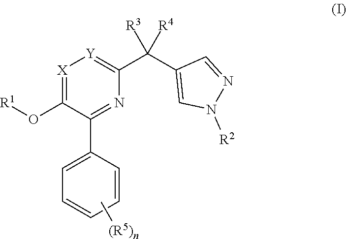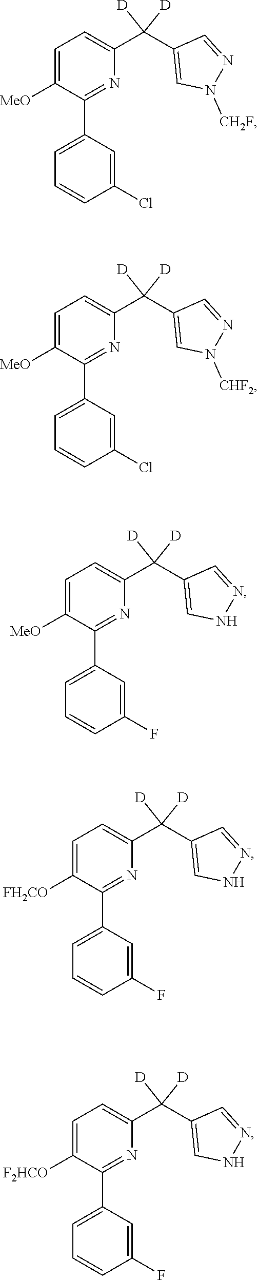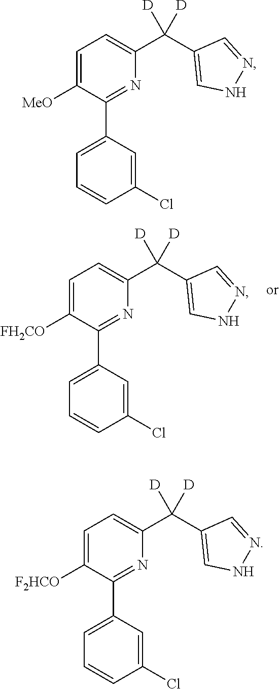 Step 5: Crude 6-[bromo(2H2)methyI]-2-(3-chlorophenyl)-3-(difluoromethoxy)pyridine (80 mg, 0.23 mmol) was dissolved in dioxane/water (4:1, 1.5 mL) and treated with 1-(1-ethoxyethyl)-4-(4,4,5,5-tetramethyl-1,3,2-dioxaborolan-2-yl)-1H-pyrazole (110 mg, 0.34 mmol), Pd(dppf)2Cl2*DCM (20 mg, 0.025 mmol), and K3PO4(100 mg, 0.47 mmol). The reaction was purged with Ar for 5 min, then heated to 85° C. under Ar for 20 hrs. The reaction was diluted with water (50 mL) and filtered through Celite to remove insoluble materials. Crude product was extracted with EtOAc and the solvent then evaporated. The residue was taken up in MeOH and 2N HCl and stirred overnight. The reaction was neutralized with NaHCO3, then extracted 3× EtOAc. The combined organics were washed with brine, dried with Na2SO4, and concentrated. The sample was purified by chromatography (3-5% EtOAc/DCM, then 4:1 hexane/acetone) to give Compound 3.1H NMR (CDCl3) δ ppm 7.88 (t, J=1.7 Hz, 1H), 7.77 (m, 1H), 7.60 (m, 3H), 7.43 (m, 2H), 6.99 (d, J=8.4 Hz, 1H), 6.42 (t, J=73 Hz, 1H), 6.38 (t, J=2.1 Hz, 1H).