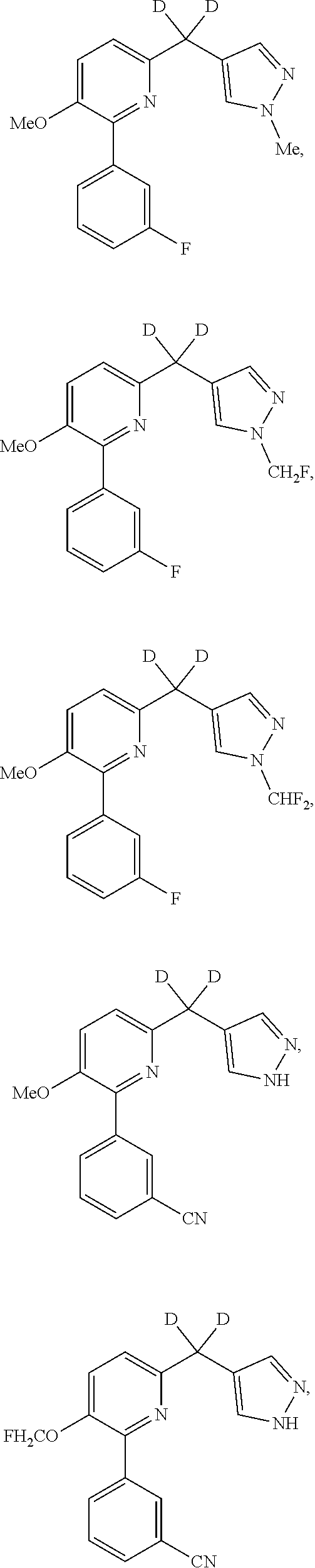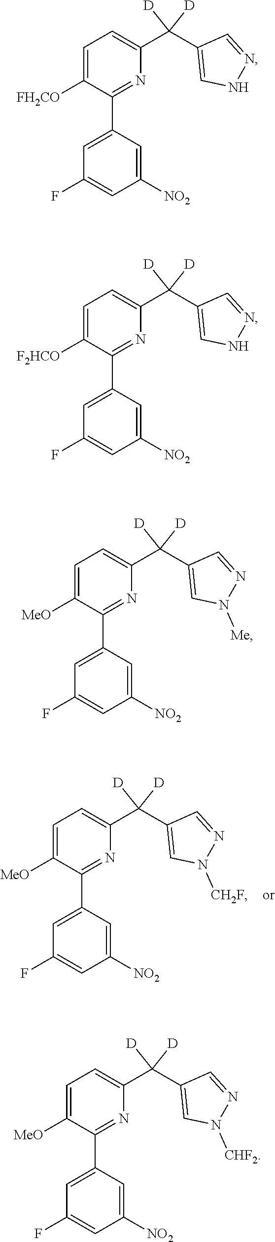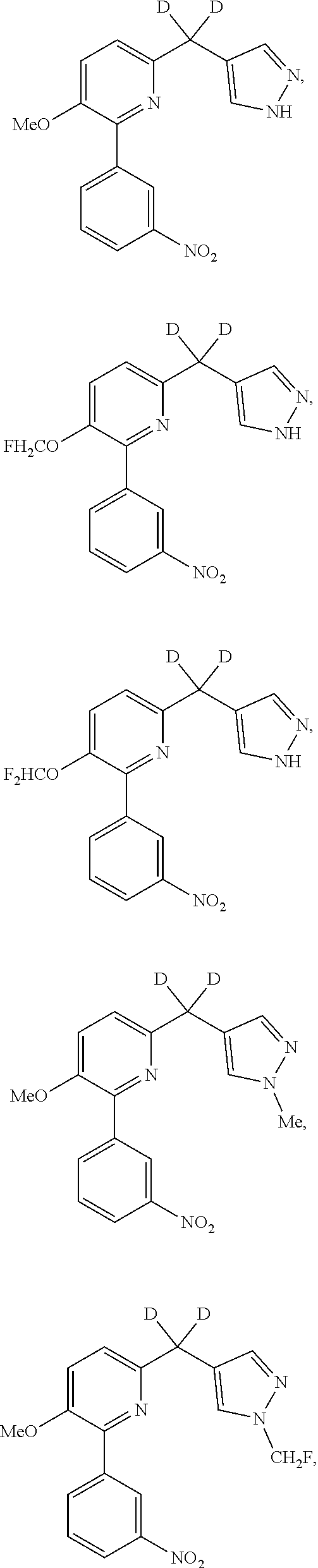 Step 5: Crude 2-(3-nitro-phenyl)-3-methoxy-6-(dideuteriomethylbromide)pyridine (1.00 g, 3.22 mmol) was dissolved in dioxane/water (4:1, 15 mL) and treated with 1-(1-ethoxyethyl)-4-(4,4,5,5-tetramethyl-1,3,2-dioxaborolan-2-yl)-1H-pyrazole (1.3 g, 4.83 mmol), Pd(dppf)2Cl2*DCM (200 mg, 0.25 mmol), and K3PO4(1.4 g, 6.6 mmol). The reaction was purged with Ar for 5 min, then heated to 90° C. under Ar for 20 hrs. The reaction was diluted with water (50 mL) and filtered through Celite to remove insoluble materials. Crude product was extracted with EtOAc and the solvent then evaporated. The residue was taken up in MeOH (10 mL) and 2N HCl (6 mL) and stirred overnight. The reaction was neutralized with NaHCO3, then extracted 3× EtOAc. The combined organics were washed 1× brine, dried with Na2SO4, and concentrated. The sample was purified by preparative TLC with 3-5% EtOAc/DCM as eluent to give 3-methoxy-2-(3-nitrophenyl)-6-[(1H-pyrazol-4-yl)(2H2)methyl]pyridine (Compound 1).1H NMR (CDCl3) δ 7.17 (d, J=8.6 Hz, 1H), 7.29 (d, J=8.6 Hz, 1H), 7.56 (s, 2H), 7.62 (t, J=8.01 Hz, 1H), 8.25 (ddd, J=8.2, 2.3, 1.0 Hz, 1H), 8.37 (dt, J=7.8, 1.3 Hz, 1H), 8.91 (t, J=2 Hz, 1H)