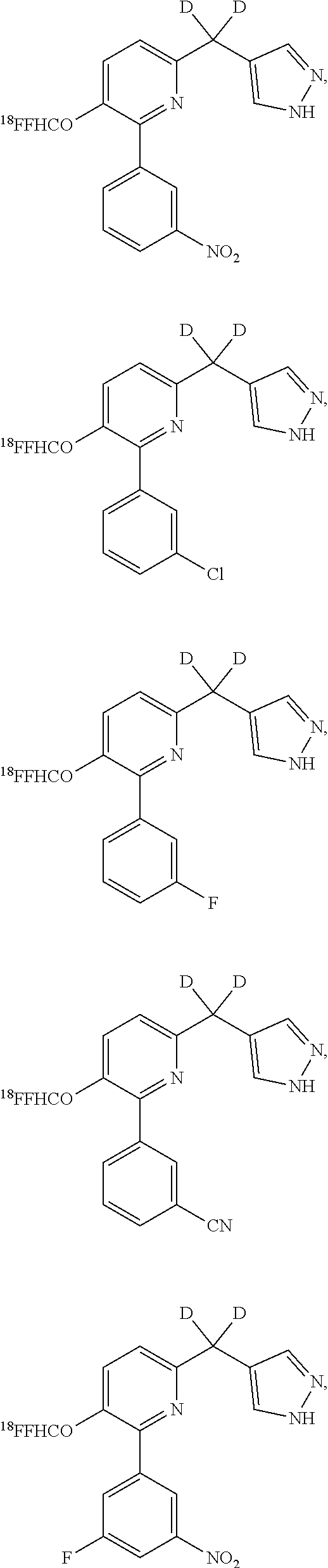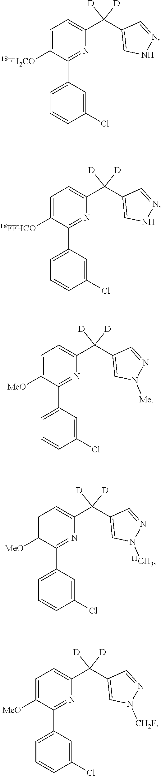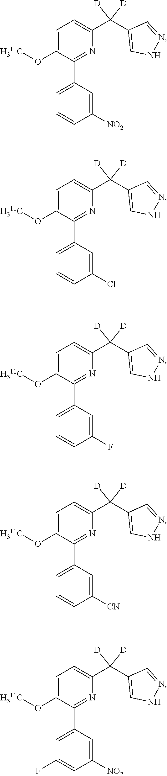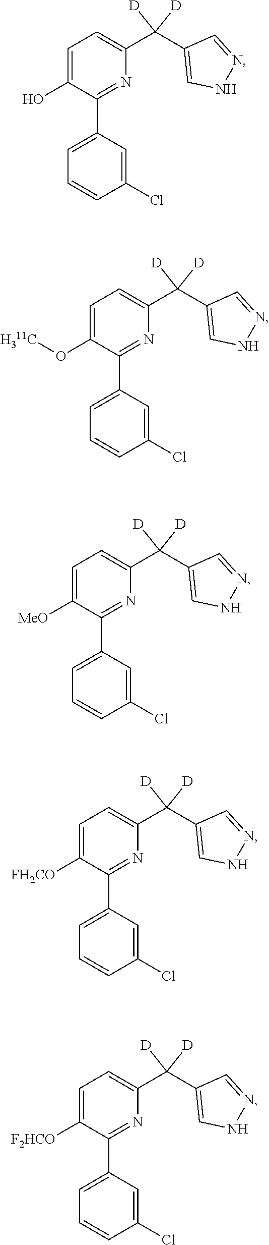 Step 5: Crude 2-(3-nitro-phenyl)-3-methoxy-6-(dideuteriomethylbromide)pyridine (1.00 g, 3.22 mmol) was dissolved in dioxane/water (4:1, 15 mL) and treated with 1-(1-ethoxyethyl)-4-(4,4,5,5-tetramethyl-1,3,2-dioxaborolan-2-yl)-1H-pyrazole (1.3 g, 4.83 mmol), Pd(dppf)2Cl2*DCM (200 mg, 0.25 mmol), and K3PO4(1.4 g, 6.6 mmol). The reaction was purged with Ar for 5 min, then heated to 90° C. under Ar for 20 hrs. The reaction was diluted with water (50 mL) and filtered through Celite to remove insoluble materials. Crude product was extracted with EtOAc and the solvent then evaporated. The residue was taken up in MeOH (10 mL) and 2N HCl (6 mL) and stirred overnight. The reaction was neutralized with NaHCO3, then extracted 3× EtOAc. The combined organics were washed 1× brine, dried with Na2SO4, and concentrated. The sample was purified by preparative TLC with 3-5% EtOAc/DCM as eluent to give 3-methoxy-2-(3-nitrophenyl)-6-[(1H-pyrazol-4-yl)(2H2)methyl]pyridine (Compound 1).1H NMR (CDCl3) δ 7.17 (d, J=8.6 Hz, 1H), 7.29 (d, J=8.6 Hz, 1H), 7.56 (s, 2H), 7.62 (t, J=8.01 Hz, 1H), 8.25 (ddd, J=8.2, 2.3, 1.0 Hz, 1H), 8.37 (dt, J=7.8, 1.3 Hz, 1H), 8.91 (t, J=2 Hz, 1H)