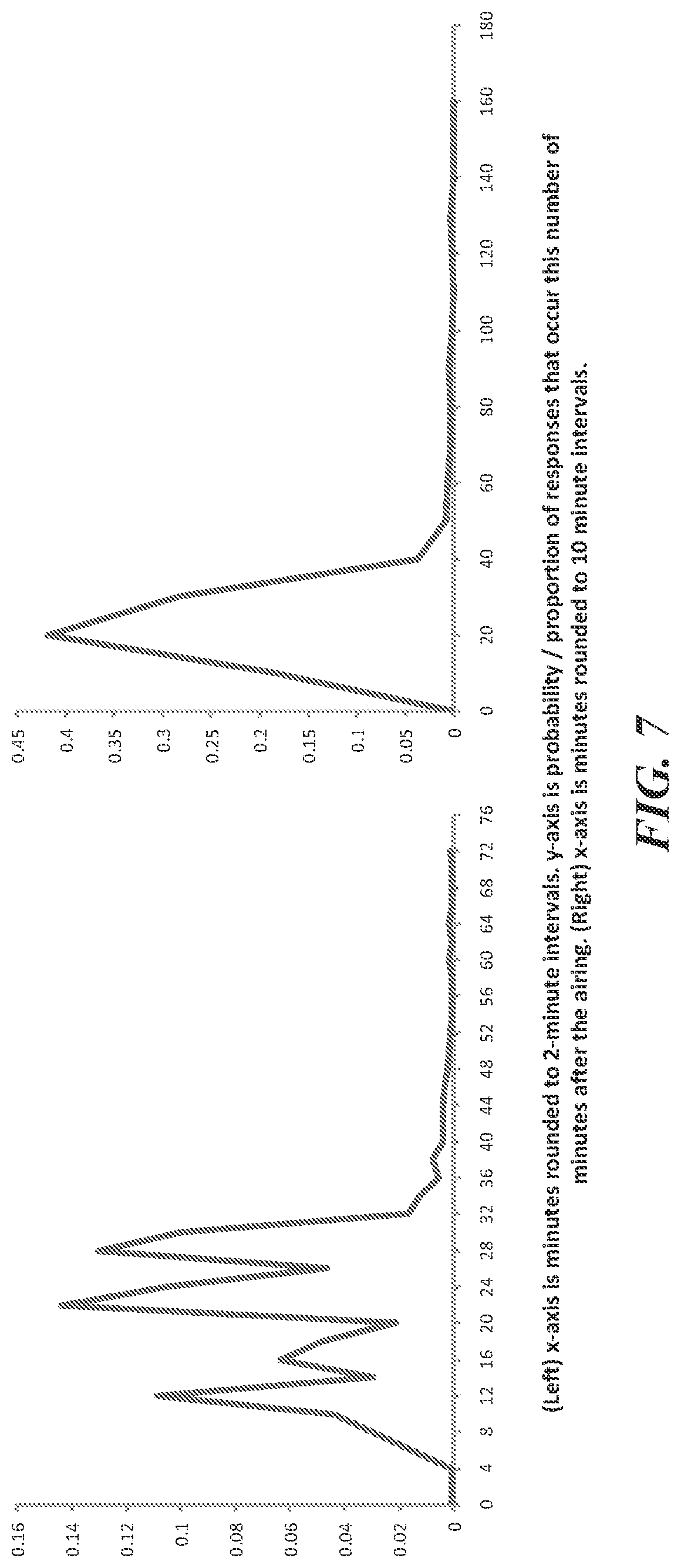 Each spot has information about the station-program that it ran on, and so after quantifying the disparity above for every possible station-response, it is then possible to quantify the disparity for each response-spot. In measuring the disparity between spot and customer response demographics, it is helpful to appropriately scale the variables to maximize the effectiveness of the match. Demographic variables range from ordinal values in the tens (e.g. age ranges from 18 . . . 80) to “has children” which is a two-value binary variable, 0,1. If the variables aren't scaled then in an L1-distance calculation, the age variable would tend to exert up around 50× more “weight” on the distance match than gender. Yet gender may be just as valuable as age. Because of this, the system standardizes each disparity to z-scores. The transformation is Each demographic is compared against the distribution of its disparities to determine whether it is high or low compared to the norm for disparity. D. Time Time is one of the most important variables for determining which spot might have caused a particular response. As is the case in other credit assignment algorithms such as Q-learning, events that are closer in time to the response receive more credit. A unique linking key makes it possible to observe responses that are tied to particular spots. However, because of some shared linking keys, the “lone spot” method is also employed on top of this basic technique to ensure that no drag orders or other issues are possible. Based on this filtered set of spot and response pairs, the system can calculate the probability distribution of how quickly after an airing consumers respond, Pr(r|rd−sd=T). The shape of this spot-response probability of response given time curve is shown in VIII. Unknown Signal Identification The television spots that are known about may not be a complete list of the marketing events that are running in the world. There may be other marketing events, including other television broadcasts, direct mail, and so on. There may also be organic web activity as people convert online. The method for identifying unknown spots is if the predicted highest probability of a spot being responsible for a response is lower than a threshold, then the system assumes that another unknown spot may be causing this response. It is possible to gather a little more information on the unknown spot. After identifying an unknown spot, the system has information about the kind of spot it was. Amongst other things the system knows: