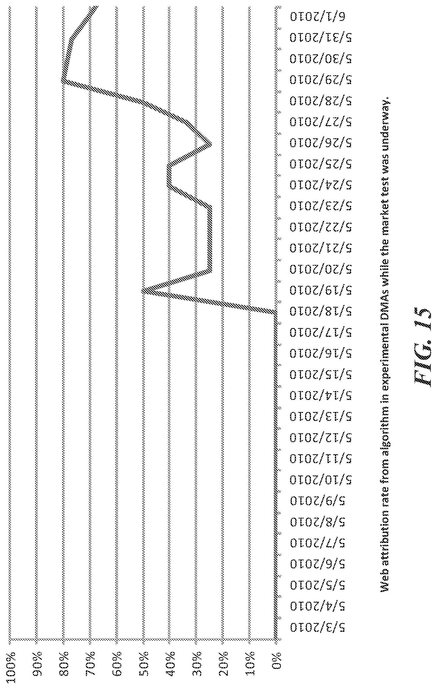The attribution rate for the media aired the first week can be calculated as 6/(1+6)=85%. The subsequent lift during the second phase due to the national program was 16, so 94% attribution rate is determined for the nationally televised ads aired the second week. The behavior of the response-spot probability estimation algorithm before and during the market test is shown in The attribution rates calculated algorithmically are directionally correct with the lower bound attribution rates which were accessible because of the unique design of the experiment. However, they are lower than the actual attribution rates. In investigating why the attribution rates were lower, it was found that many of the media markets were improperly coded, and so were failing to match when a response originated in one of the targeted DMAs. Methods for standardizing market naming automatically and heuristically are discussed elsewhere in this patent. B. Calculating Aggregate Attribution Percentages—Analysis of Variance Method A second method for calculating the aggregate conversions that are attributed to each media event is to perform statistical analysis on historical data. This method requires some amount of historical data with the date of media, and the date of conversion events. First, consider a response timeseries Conversions(t) and a media timeseries MediaEventOccurred01(t). Other media event timeseries are captured as OtherMediaEvent01(t). Align the timeseries variables by time, so that on the same day-hour there are total media placements MediaEventOccurred01(t), and total responses Conversions(t), and other ancillary media events that the system may be tracking OtherMediaEvent01(t). Next, a linear model is created that predicts, based on some media events, the number of conversion events that will result. Let the model be of the form
