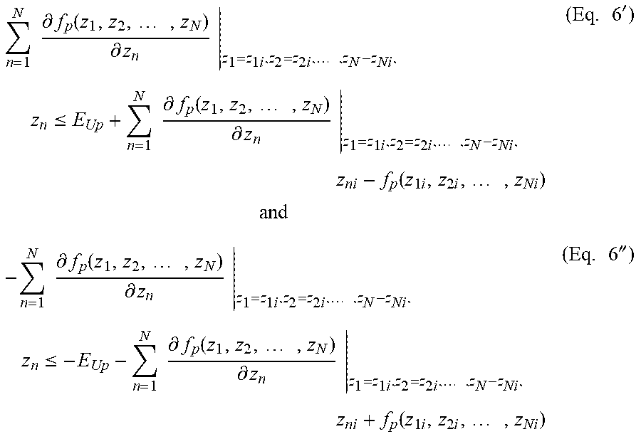 for k=1,2, . . . K; the optimization process becomes a classic quadratic programming problem, wherein Anj, Bj, Cnk, Dk, are constants. Additional constraints can be imposed for each iteration. For example, a “damping factor” ΔDcan be introduced to limit the difference between (z1(i+1), z2(i+1), zN(i+1)) and (z1i, z2i, . . . , zNi), so that the approximation of Eq. 3 holds. Such constraints can be expressed as zni−ΔD≤zn≤zni+ΔD·(z1(i+1), z2(i+1), . . . , zN(i+1)) can be derived using, for example, methods described in Numerical Optimization (2nded.) by Jorge Nocedal and Stephen J. Wright (Berlin N.Y.: Vandenberghe. Cambridge University Press).