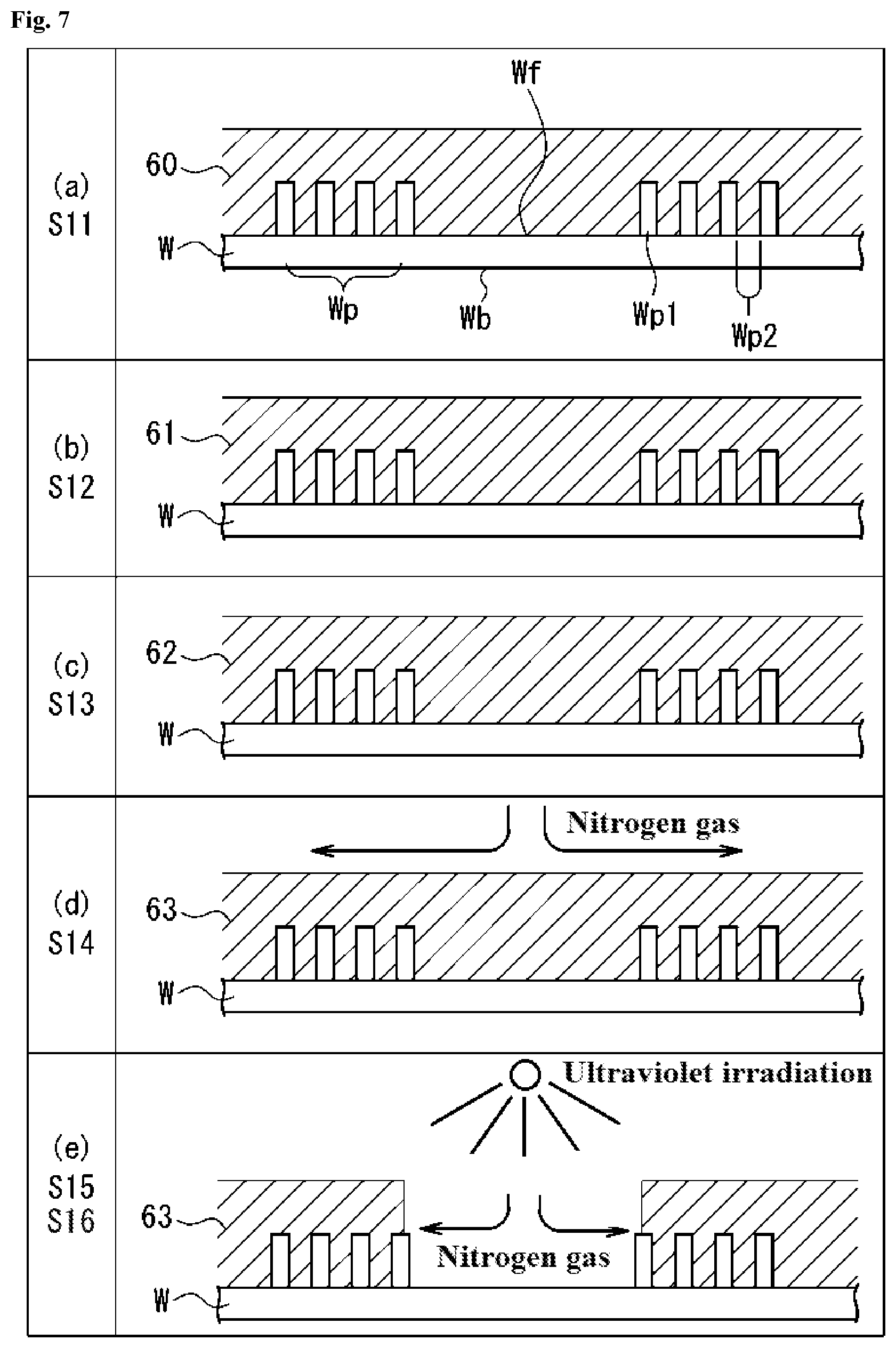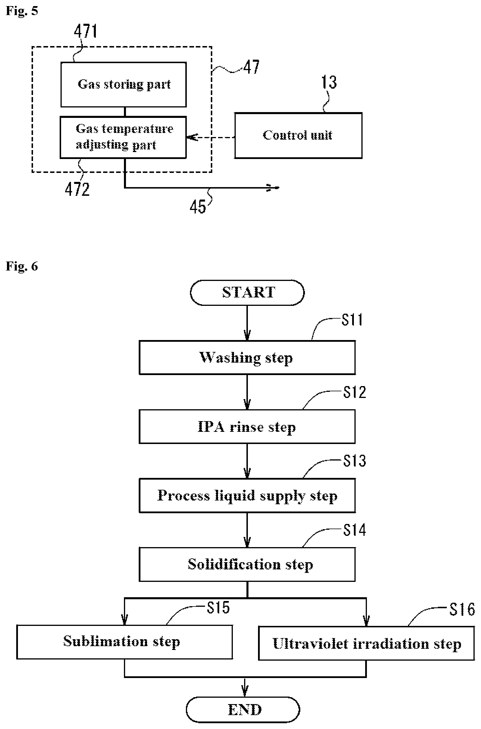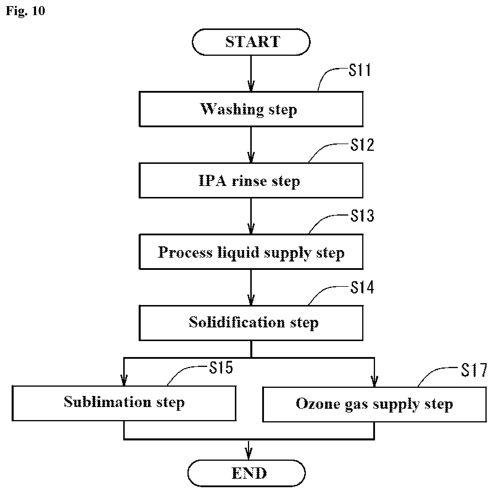 The present application is a 35 U.S.C. §§ 371 national phase conversion of PCT/JP2017/040563, filed Nov. 10, 2017, which claims priority to Japanese Patent Application No. 2017-000867, filed Jan. 6, 2017, the contents of both of which are incorporated herein by reference. The PCT International Application was published in the Japanese language. The present invention relates to a substrate treating apparatus and a substrate treating method which remove, from substrates, liquids adhered to various types of substrates (hereinafter simply referred to as “substrates”) such as a semiconductor substrate, a glass substrate for a photomask, a glass substrate for a liquid crystal display, a glass substrate for a plasma display, a FED (Field Emission Display) substrate, a substrate for an optical disc, a substrate for a magnetic disc and a substrate for a magneto-optical disc. In the manufacturing process of an electronic component such as a semiconductor device or a liquid crystal display device, various types of wet processing using liquids are performed on a substrate, and thereafter dry processing for removing the liquids adhered to the substrate by the wet processing is performed on the substrate. As the wet processing, washing processing which removes contaminants on the surface of the substrate can be mentioned. For example, on the surface of a substrate in which a fine pattern having recesses and projections is formed by a dry etching step, a reaction byproduct (etching residue) is present. In addition to the etching residue, a metal impurity, an organic contaminant and the like may be adhered to the surface of the substrate, and in order to remove these substances, washing processing such as for supplying a washing liquid to the substrate is performed. After the washing processing, rinse processing which removes the washing liquid with a rinse liquid and dry processing which dries the rinse liquid are performed. As the rinse processing, rinse processing that supplies a rinse liquid such as deionized water (DIW) to the surface of the substrate to which the washing liquid is adhered so as to remove the washing liquid on the surface of the substrate can be mentioned. Thereafter, the dry processing is performed that removes the rinse liquid so as to dry the substrate. In recent years, as a finer pattern has been formed on a substrate, the aspect ratio of a convex portion in a pattern having recesses and projections (the ratio between the height and the width of the convex portion in the pattern) has been increased. Hence, there is a problem of a so-called pattern collapse in which at the time of dry processing, surface tension that acts on a boundary surface between a liquid such as a washing liquid or a rinse liquid entering a concave portion in the pattern and a gas in contact with the liquid pulls and collapses the adjacent convex portions in the pattern. As a dry technology for preventing the pattern collapse caused by surface tension as described above, for example, Japanese Unexamined Patent Application Publication No. 2013-16699 discloses a method in which a solution is brought into contact with a substrate where a structure (pattern) is formed such that the solution is changed into a solid, in which the solid is used as a support member (solidified body) for the pattern and in which the support member is removed by being changed from a solid phase to a gas phase without the intervention of a liquid phase. This patent literature also discloses that as the support member, a sublimable substance is used which is at least any of a methacrylic resin material, a styrene resin material and a fluorocarbon material. Patent literatures 2 and 3 disclose dry technologies in which the solution of a sublimable substance is supplied on a substrate, in which a solvent in the solution is dried such that the top of the substrate is filled with the sublimable substance in a solid phase and in which thus the sublimable substance is sublimed. According to these patent literatures, it is assumed that, since surface tension does not act on a boundary surface between a solid and a gas in contact with the solid, it is possible to reduce the collapse of a pattern caused by surface tension. Patent literature 4 discloses a dry technology in which the melt of tertiary butanol (t-butanol) is supplied to a substrate to which a liquid is adhered, in which t-butanol is solidified on the substrate so as to form a solidified body and in which t-butanol is thereafter removed by being sublimed. Patent Literature 1: JP 2013-16699 A Patent Literature 2: JP 2012-243869 A Patent Literature 3: JP 2013-258272 A Patent Literature 4: JP 2015-142069 A However, disadvantageously, even in the dry technologies disclosed in patent literatures 1 to 4, for example, for a substrate having a pattern which is fine and has a high aspect ratio (that is, the height of a convex pattern is greater than the width of the convex pattern), it is impossible to further prevent the collapse of the pattern. The present invention is made in view of the foregoing problem, and an object thereof is to provide a substrate treating method and a substrate treating apparatus which can reduce the collapse of a pattern on a substrate. The inventors et al. of the present application have found that when organic substances serving as an impurity are included in a process liquid including a sublimable substance, the collapse of a pattern occurs due to the organic substances. In other words, when the sublimable substance is sublimed in a solidified body of the process liquid including the organic substances, the organic substances are precipitated without being sublimed. Furthermore, it has been found that when the organic substances are brought into an aggregated state by interaction between the precipitated organic substances, gravity acts on the pattern, and thus the collapse of the pattern occurs. In order to solve the above-mentioned problems, the substra