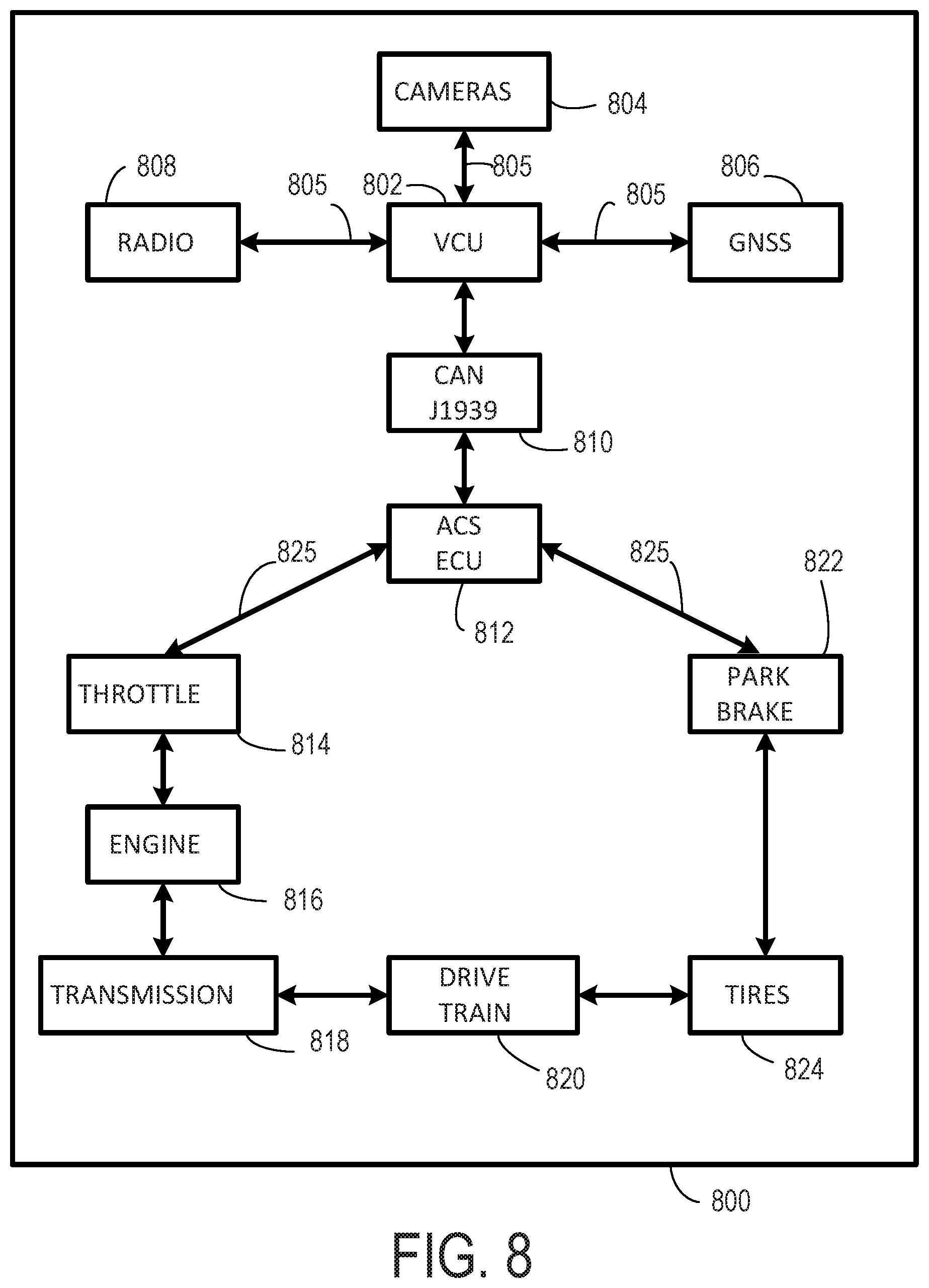 Turning to FIG. 8, an embodiment of overall teleoperation control system 800 for ADV 110 is described. Standards for busses used in system 800 include standard IEEE 802.3 (for convenience, “Ethernet”), a collection of standards describing local area network composition and operation, and standard SAE J1939 (CAN), Recommended Practice for a Serial Control and Communications Vehicle Network, which is the vehicle bus recommended practice used for communication and diagnostics among vehicle components. Both of these standards are incorporated into this document in their entireties. System 800, then, employs two types of busses, each of which being coupled to VCU 802, Ethernet connections 805 and CAN bus connections 810, 825. Cameras 804 are coupled to VCU 802 and thus to radio 808, and provide remote viewing of the areas of ADV 110 operation (fore and aft) by the operations supervisor (e.g., van operator). GNSS system 806 identifies the horizontal and vertical location and position of ADV 110 within a predefined area of an orchard, and provides tracking capability of ADV 110 as it drives other predefined paths, as selected and identified by VCU 802. Positioning and path information, as well as ADV 110 operating parameters, are relayed to mobile control center 120 by radio 808. Radio 808 receives command and control information from mobile control center 120, which may cause VCU 802 to begin, modify, or terminate operation in a selected subsystem. Cameras 804, GPS 806, and radio 808 can be coupled to VCU 802 using the Ethernet switched packet bus 805.