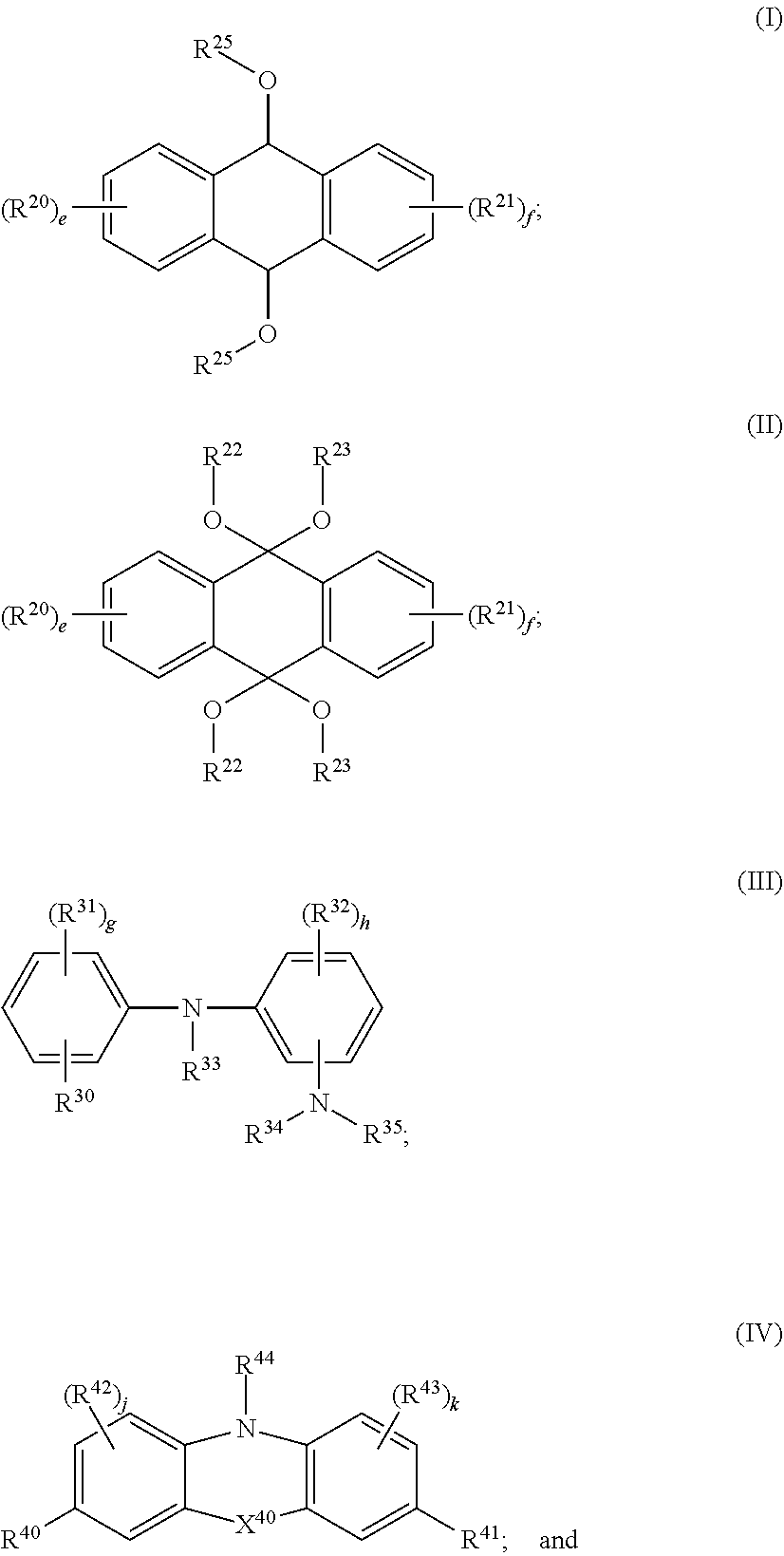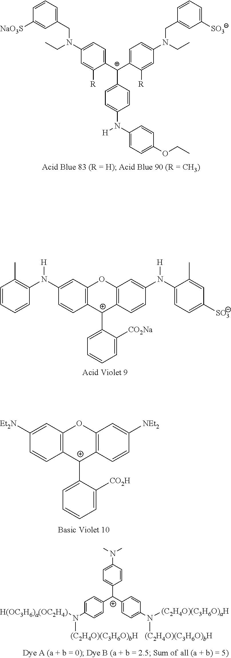 A. Creating Test Fabrics for Illumination A 1.0 m section is cut from a bolt of cotton fabric (Style 403) and stripped prior to use by washing at 49° C. two times with AATCC Standard HE heavy duty liquid (HDL) laundry detergent without optical brightener (1.55 g/1.0 L) in deionized water. Thereafter, 3″×6″ swatches are cut from the stripped fabric for use in the method herein. A concentrated stock solution of the oxidized form of the leuco colorant is prepared in a solvent selected from ethanol or 50:50 ethanol:water, preferably ethanol. A base wash solution is prepared by dissolving AATCC Standard HE HDL without optical brightener (1.55 g/1.0 L) in deionized water. Two stripped cotton swatches are weighed together and placed in a 500 mL Erlenmeyer flask along with four 10 mm glass marbles. A total of three such flasks are prepared for each wash solution to be tested. The base wash solution is dosed with the fully oxidized leuco colorant stock to achieve a wash solution having an absorbance of 0.100±0.005 at the lambda max of the dye between 400-700 nm. A wash solution absent fully oxidized leuco colorant is used as the control. An aliquot of each wash solution sufficient to provide a 20.0:1.0 liquor:fabric (w/w) ratio is placed into each of the three 500 mL Erlenmeyer flasks. Each flask is dosed with a 1000 gpg stock hardness solution to achieve a final wash hardness of 6 gpg (3:1 Ca:Mg). The flasks are placed on a Model 75 wrist action shaker (Burrell Scientific, Inc., Pittsburgh, Pa.) and agitated at the maximum setting for 12 minutes, after which the wash solution is removed by aspiration, a volume of rinse water (0 gpg) equivalent to the amount of wash solution used is added. Each flask is dosed with a 1000 gpg stock hardness solution to achieve a final rinse hardness of 6 gpg (3:1 Ca:Mg) before agitating 4 more minutes. The rinse is removed by aspiration and the fabric swatches are spun dry (Mini Countertop Spin Dryer, The Laundry Alternative Inc., Nashua, N.H.) for 1 minute, then placed in a food dehydrator set at 135° F. to dry in the dark for 2 hours. The reflectance spectrum of the fabrics is measured on the Konica-Minolta 3610d reflectance spectrophotometer to obtain WI CIE and K/S values, and the average of the 18 measurements (6 fabrics with three exposure windows per CD-3T sample holder, see Part B below) for each set of fabrics (sample and control) is used to calculate (a) the absorbance on fabric of the fully oxidized leuco colorant before illumination (AbsB) using the following equation: